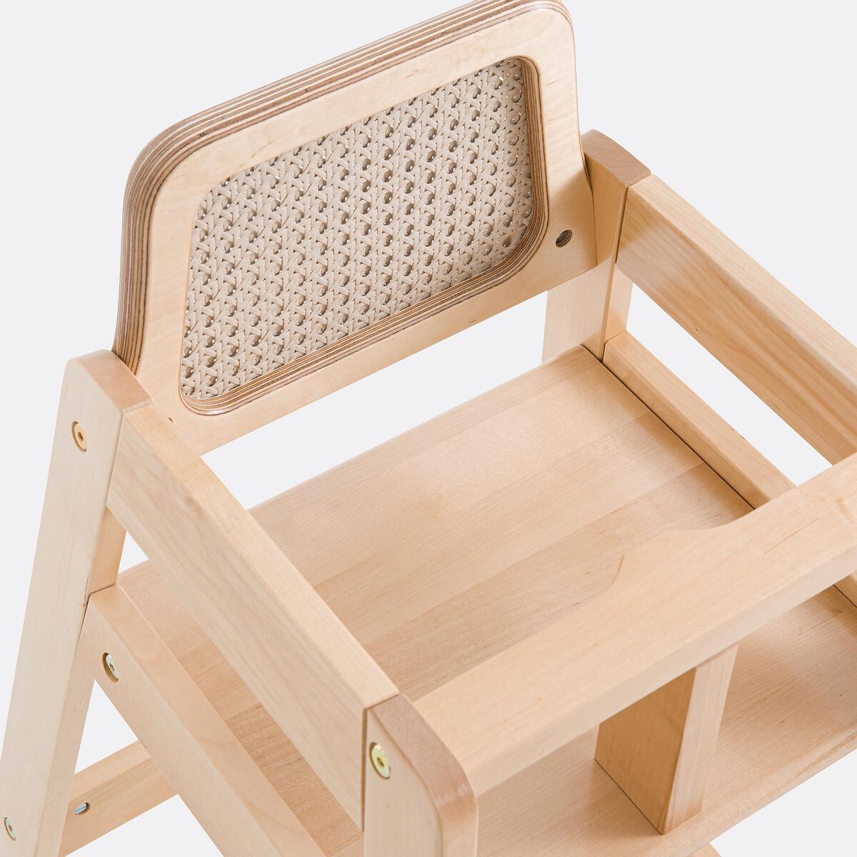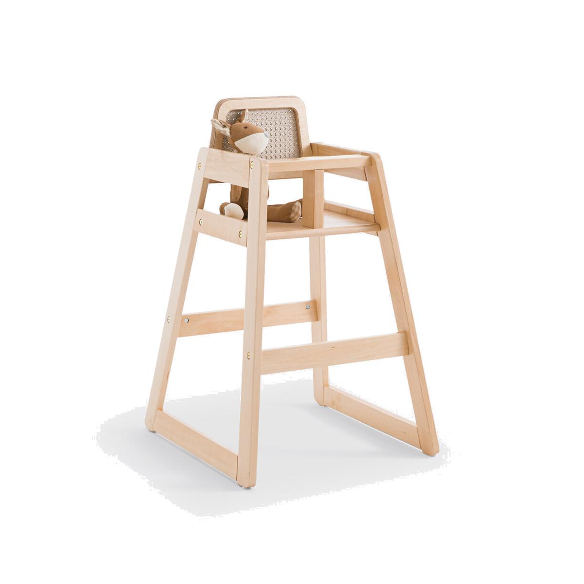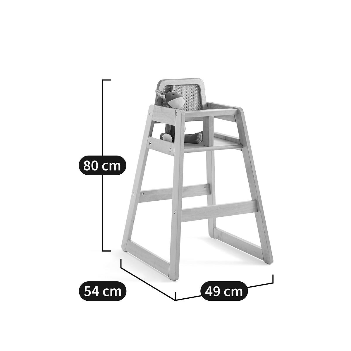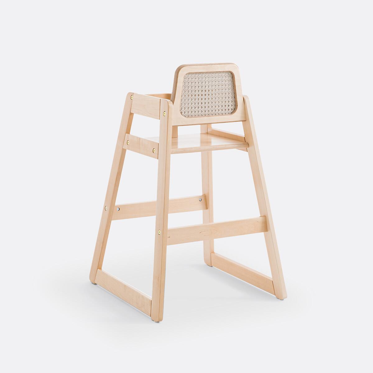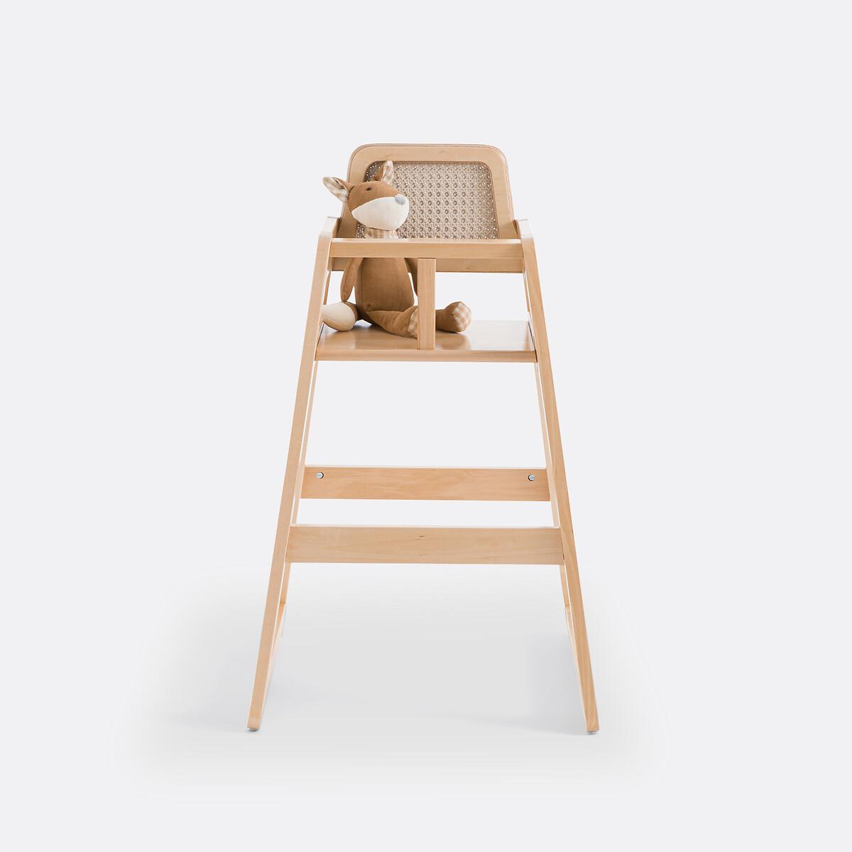 For baby's first meals at the family table, here is the Marila high chair. The ideal height, good stability and a barrier for safety. And an assertive bohemian style with its light wood structure and rattan backrest. Made in Europe. Product Details • Solid birch structure, water-based paint finish • Cane back • Non-removable safety barrier • This product is intended for children who are able to sit up unaided, aged three years or less or weighing less than or equal to 15kg.. • This chair meets the requirements specified by standard EN 14988:2017 + A1.Quality Info • This product complies with current safety requirements • Use up to 3 years maximumDimensions. Overall • Width: 49cm • Height: 80cm • Depth: 54cm. Usable dimensions: • Seat: L26.6 x D22.2cm • Space between safety barrier and seat: 13.3cmDelivery:. This product requires assembly. Available for home delivery. • Made in Europe. Dimensions and weight of package:1 parcel • L78 x H62 x D5cm, 8kg