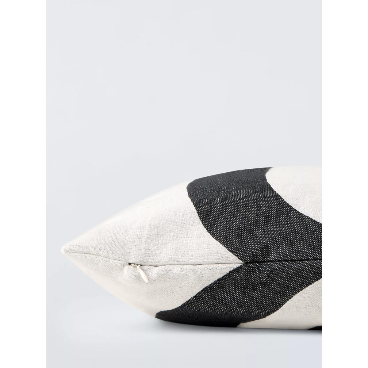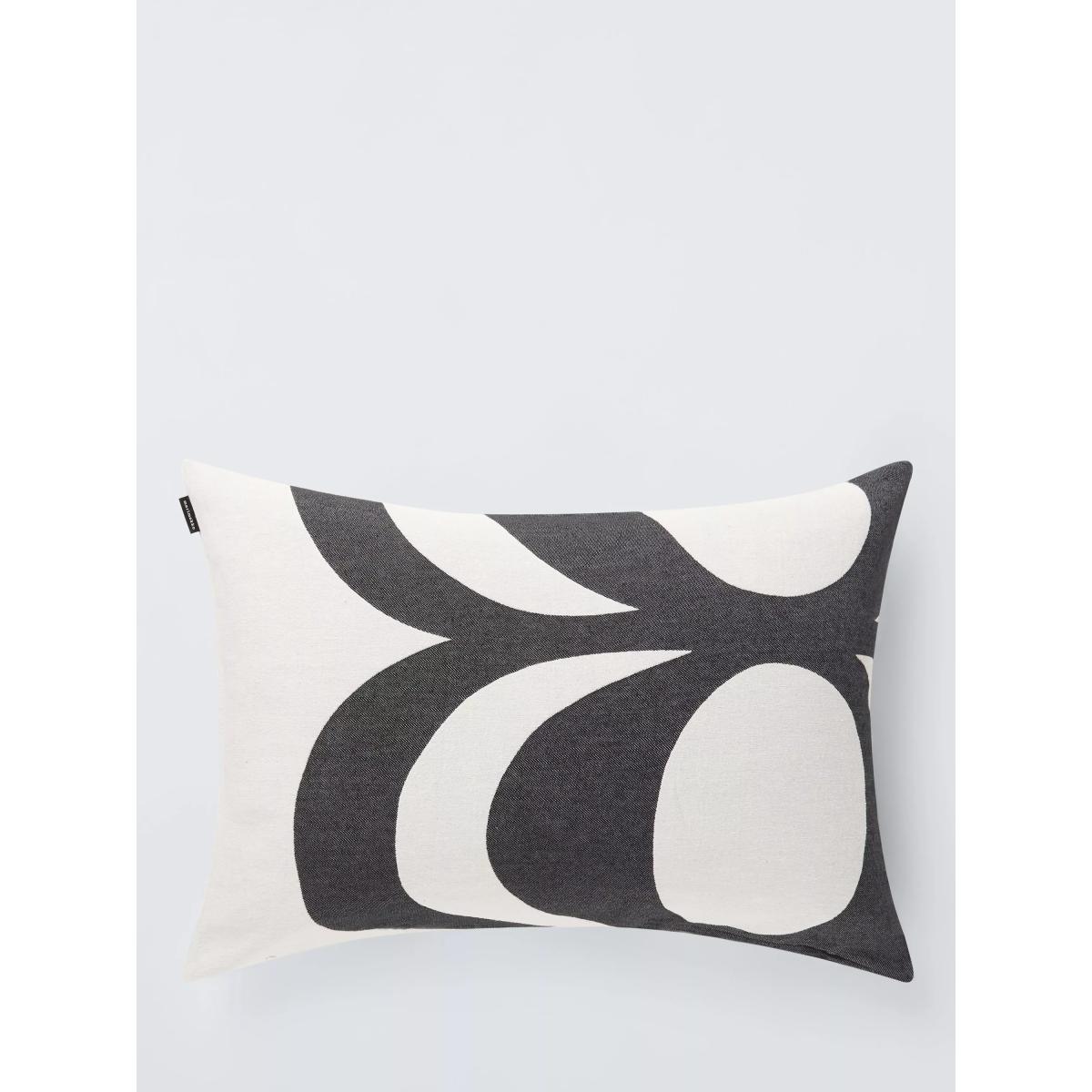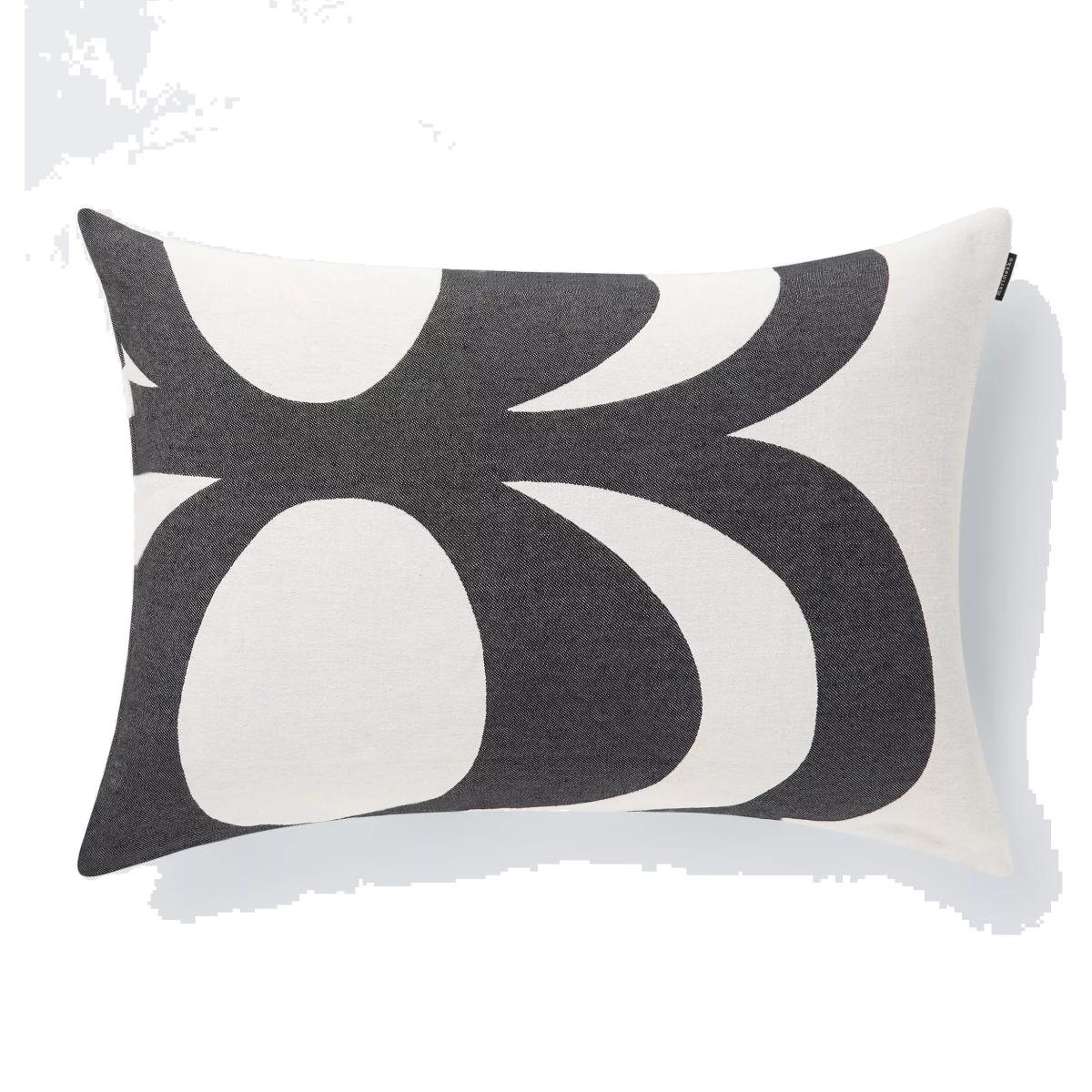 The classic, swirling black and white Kaivo pattern decorates this rectangular cotton and polyester blend cushion cover from Marimekko.