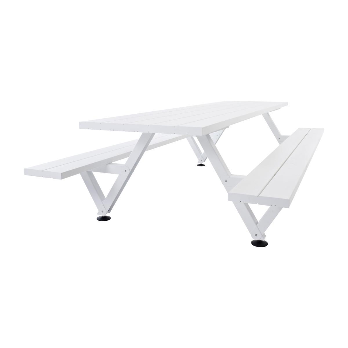 Marina is a picnic table in its most basic shape and made out of pultrusion fibre glass profiles. This way, seemingly endless tables can be created. The composite of fibre glass and polyester is a solid, durable and contemporary material that feels just like wood. However, it is considerably less sensitive to temperature changes and humidity.