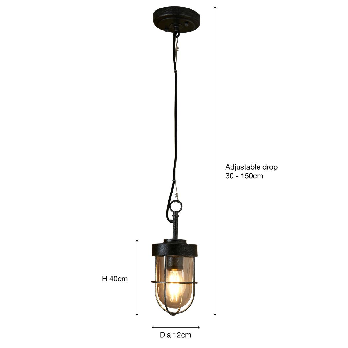 Add a modern contemporary look to your home with the Marine Industrial Ceiling Fitting. This industrial style single pendant is finished in aged pewter paint, and a clear glass shade. Complete with IP44 rating, so its suitable for use in the bathroom. The Marine Ceiling fitting is height adjustable, dimmable with a compatible bulb and light switch, as well as suitable for use with LED lamps. Matching items from the Marine range are available to help coordinate your home.