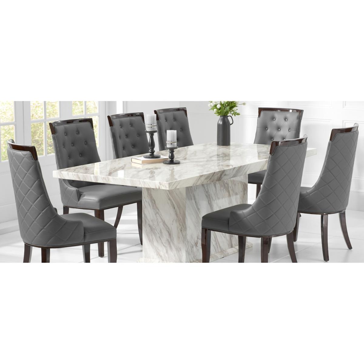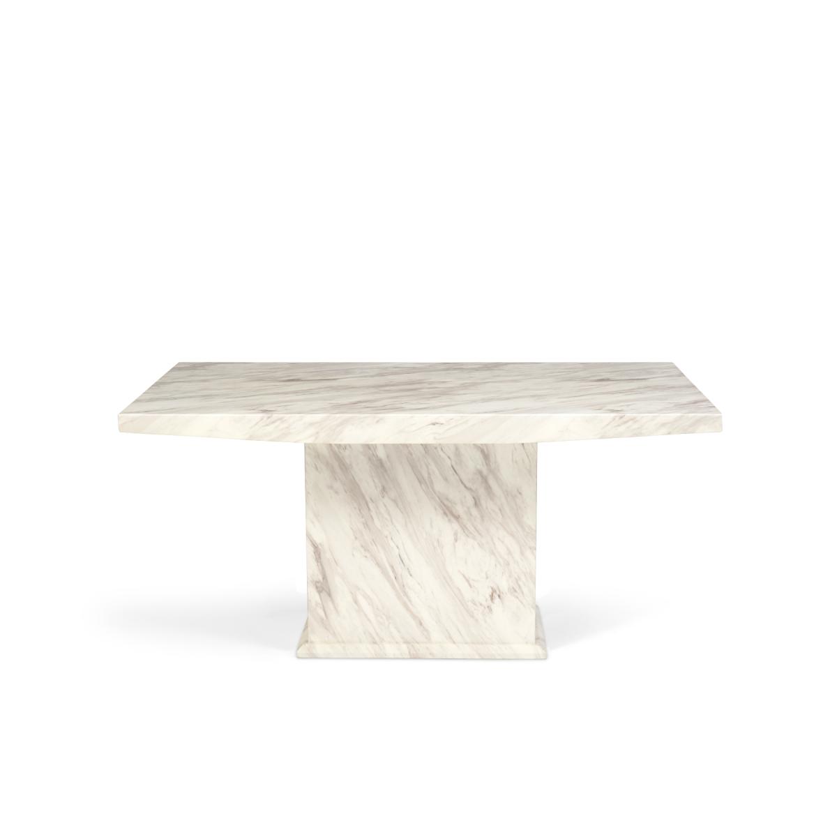 A dynamic and gracious pedestal supports the Marino dining table with matching marble textures, exhibiting elegance, sophistication, and glamour.
