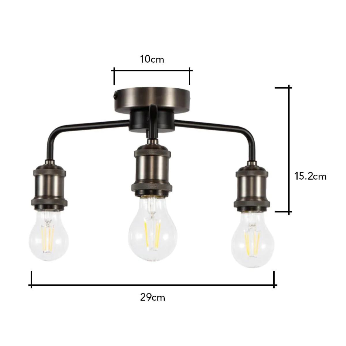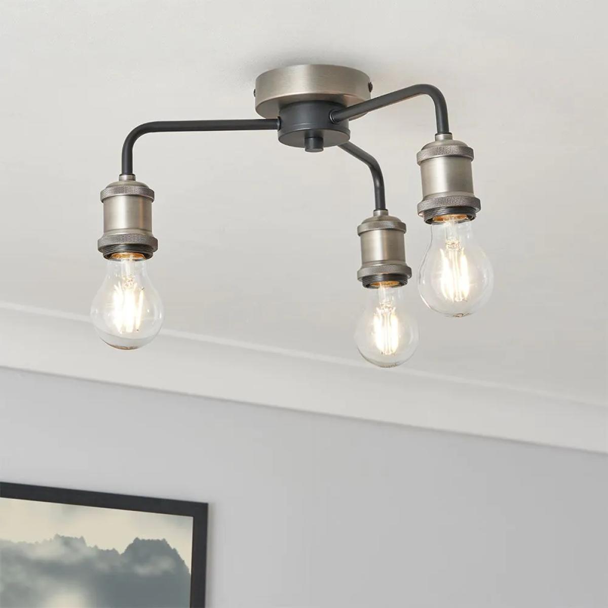 Industrial styling for your home décor with the Mario Semi Flush Ceiling Light. This ceiling light fixture comes in a robust pewter finish for a bold appearance, and features a mechanical inspired 3 arm design for an eye catching aesthetic. It also looks ideal when paired with our separately sold vintage filament light bulbs and is also ideal for low ceilings in hallways, landing or kitchens due to the minimal drop height.