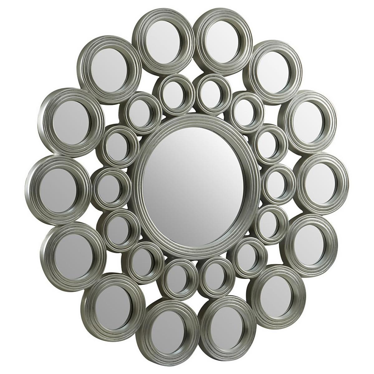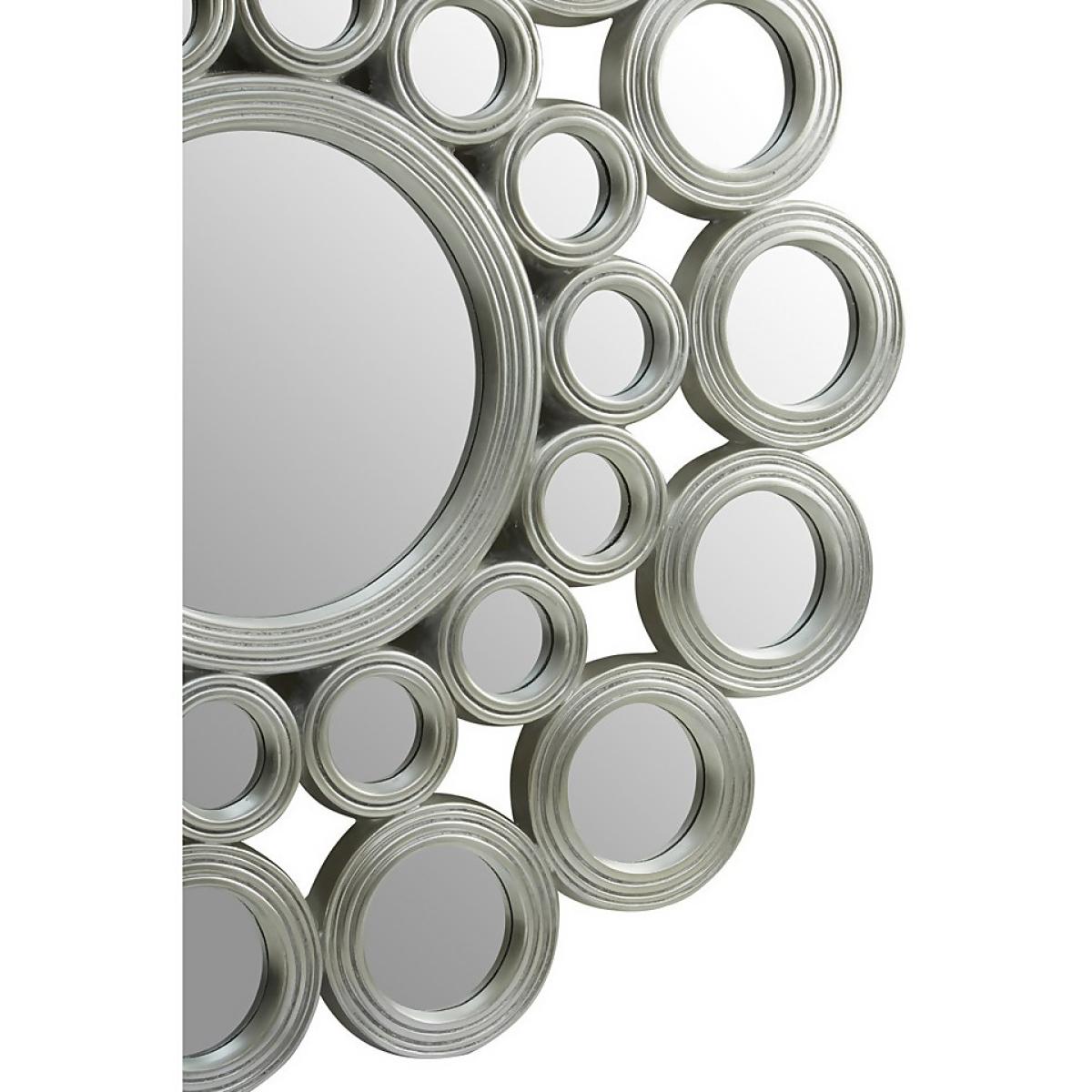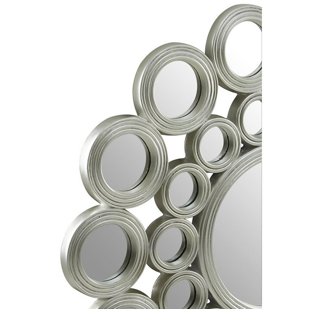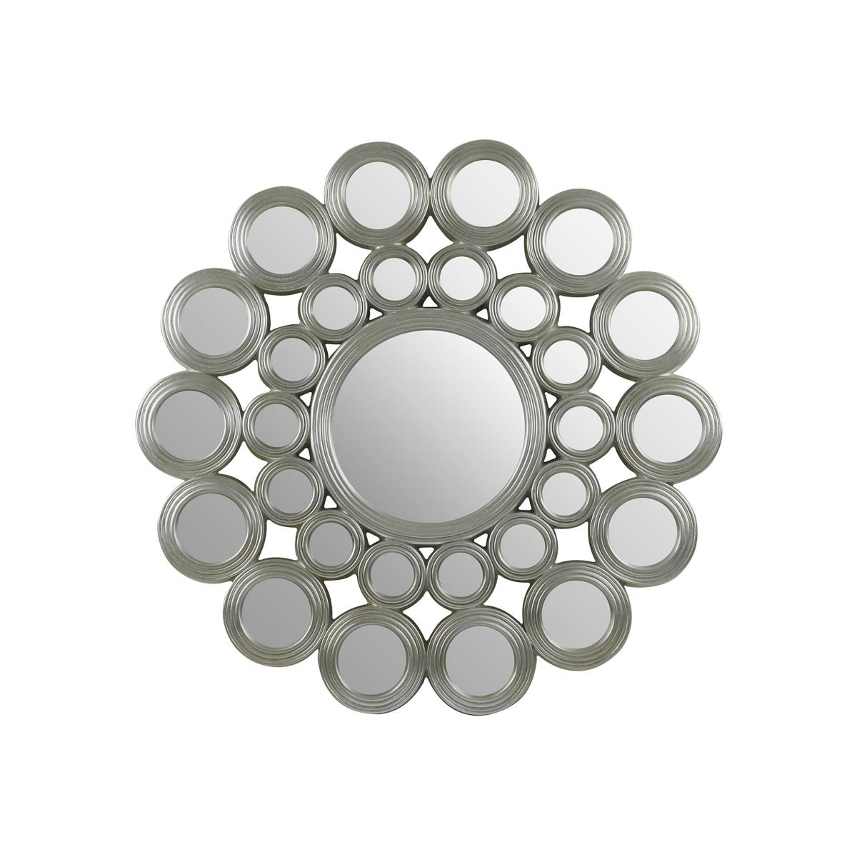 This contemporary wall mirror is comprised of different-sized, round metal frames joined together in a sequence like a flower. Each piece is complemented by a mirrored glass and has ridged lines that give it a texture.