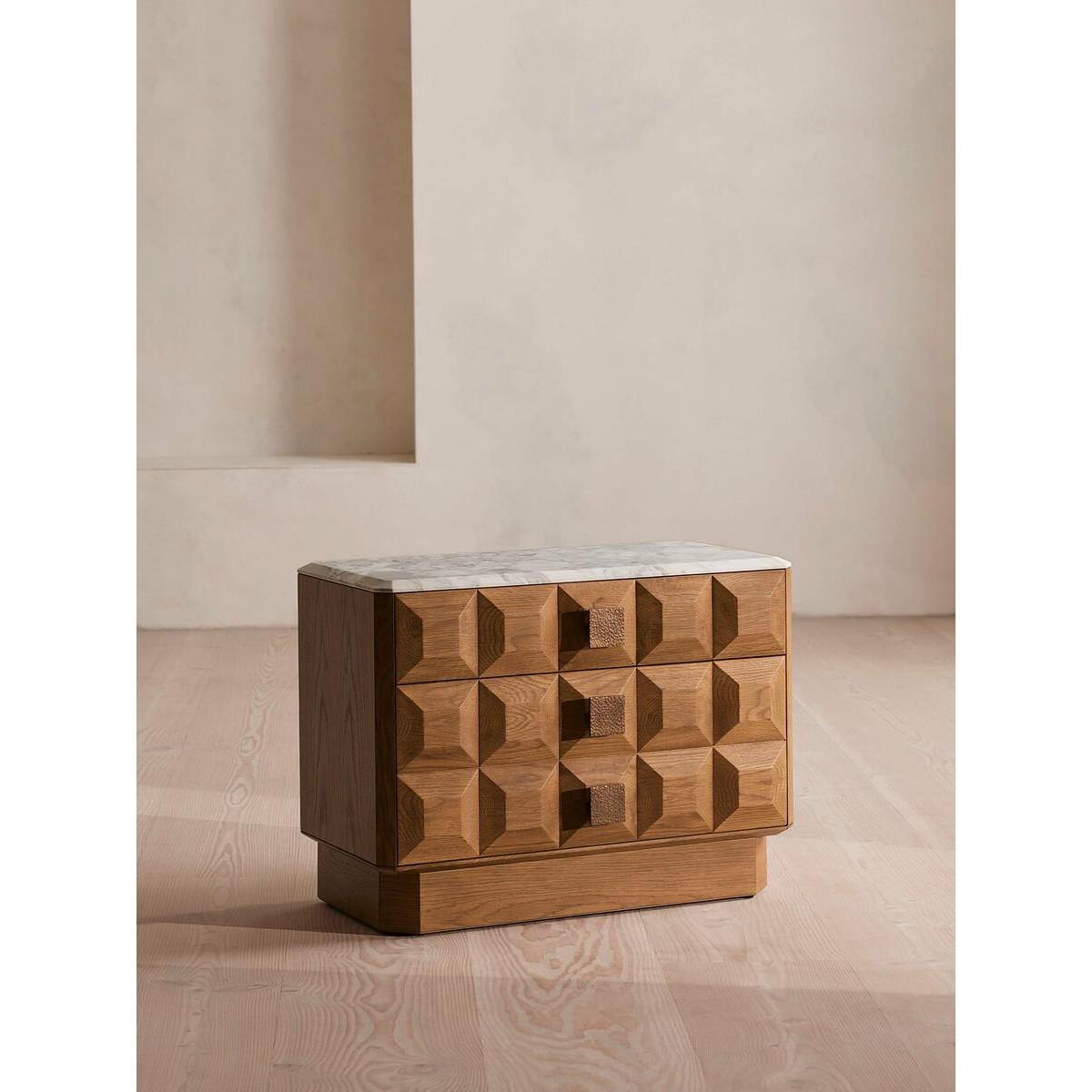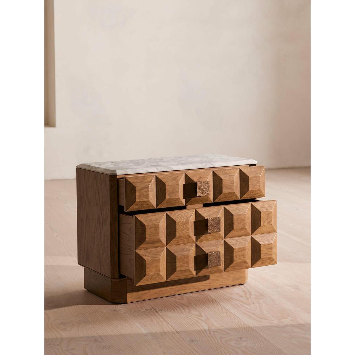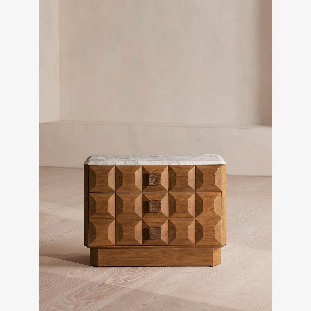 Our Marius bedside table is characteristic of the mixed material finishes found in the bedrooms of Soho House Barcelona. Crafted from European oak, this piece is complemented with a honed Arabescato Corchia marble top sourced from Italy. Relief geometric pattern drawer fronts highlight the craftsmanship behind this unique design, with hammered antique brass handles adding another material contrast. This wider style of the two features one classic top drawer and a taller bottom drawer for larger storage items, resting on a chamfered rectangular base. Two-drawer wide bedside table Honed Arabescato Corchia marble top Mid-tone European oak Relief geometric pattern drawer fronts Hammered antique brass handles Classic top drawer and taller bottom drawer Chamfered rectangular base Available in two sizes Inspired by the bedrooms of Soho House Barcelona