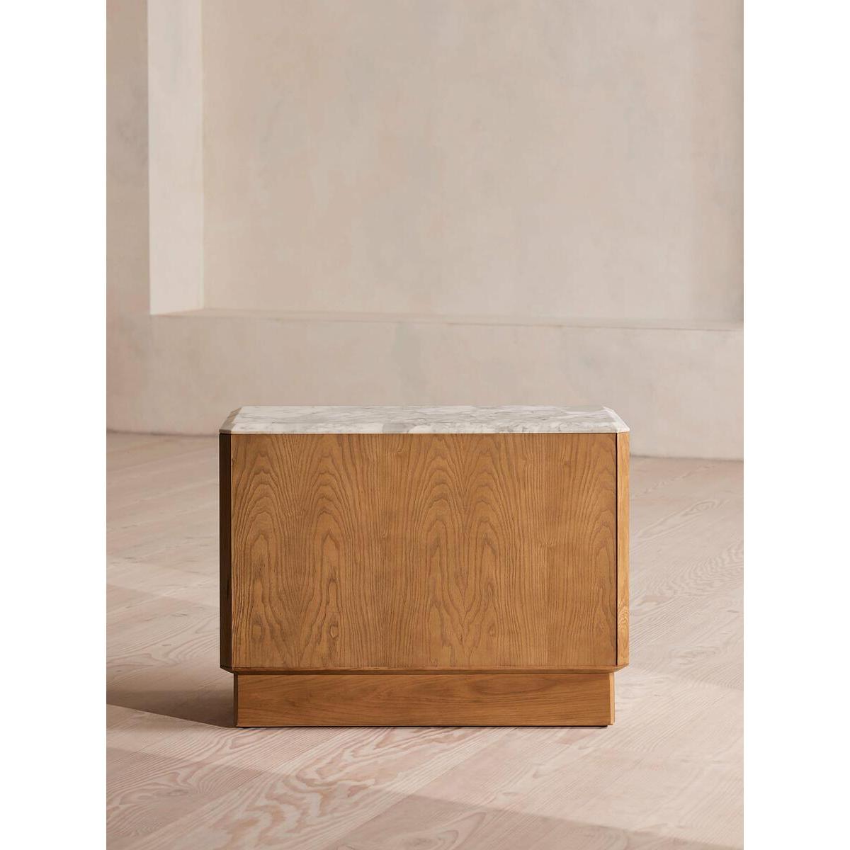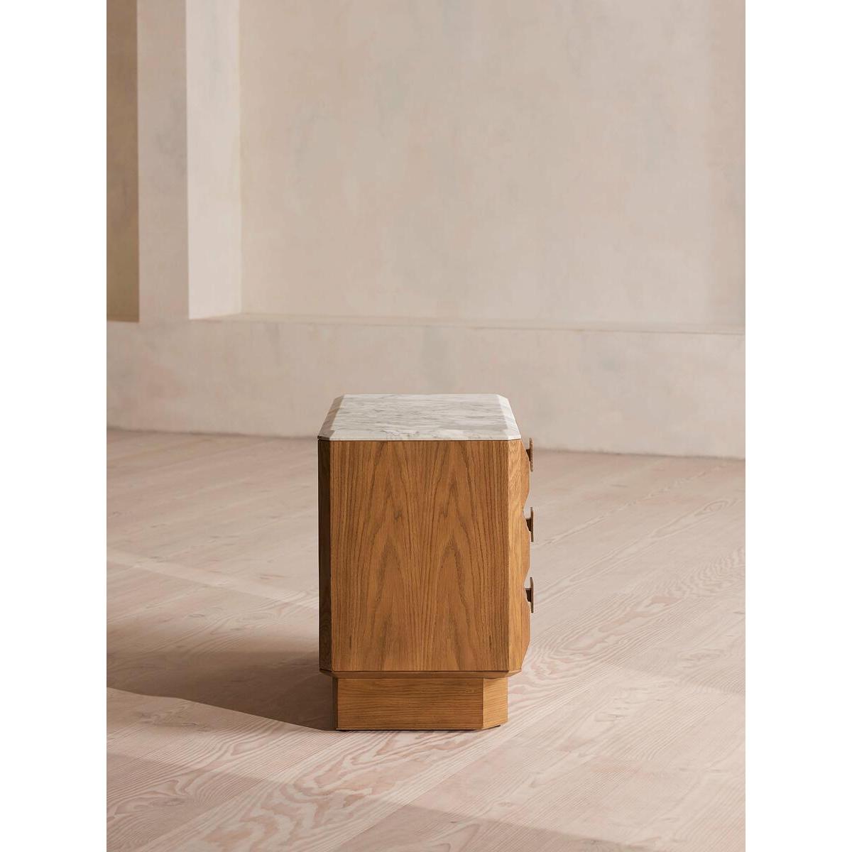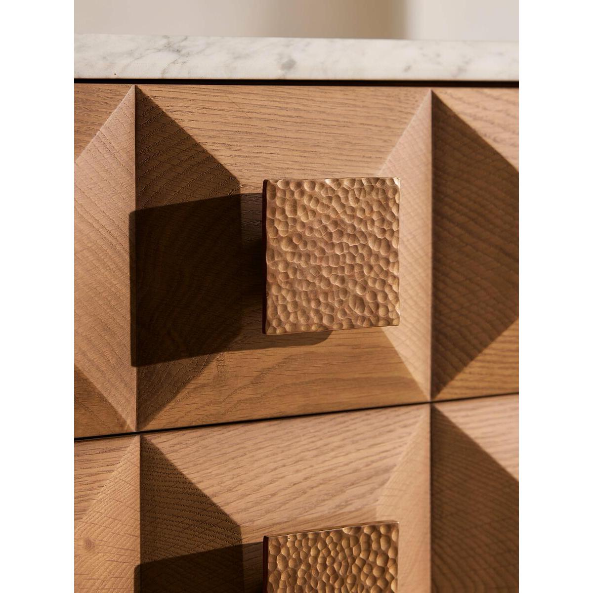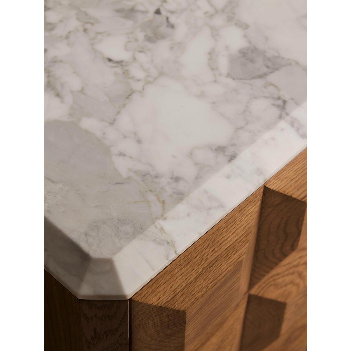 Our Marius bedside table is characteristic of the mixed material finishes found in the bedrooms of Soho House Barcelona. Crafted from European oak, this piece is complemented with a honed Arabescato Corchia marble top sourced from Italy. Relief geometric pattern drawer fronts highlight the craftsmanship behind this unique design, with hammered antique brass handles adding another material contrast. This wider style of the two features one classic top drawer and a taller bottom drawer for larger storage items, resting on a chamfered rectangular base. Two-drawer wide bedside table Honed Arabescato Corchia marble top Mid-tone European oak Relief geometric pattern drawer fronts Hammered antique brass handles Classic top drawer and taller bottom drawer Chamfered rectangular base Available in two sizes Inspired by the bedrooms of Soho House Barcelona