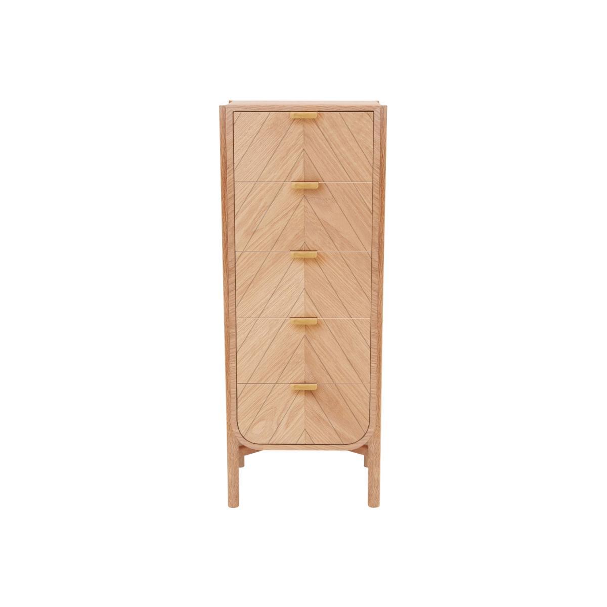 A blend inspired between retro lines and contemporary design for this superb 'chiffonnier' in blond wood. Inspired by Scandinavian furnishings from the 1950s, this robust cabinet with a vintage look has everything to please! It consists of an oak veneered MDF structure with five drawers. The general shape of Marius evokes the hull of a boat while the oblique grooves that elegantly dress its facade draw its sails. The 4 feet are in solid oak.