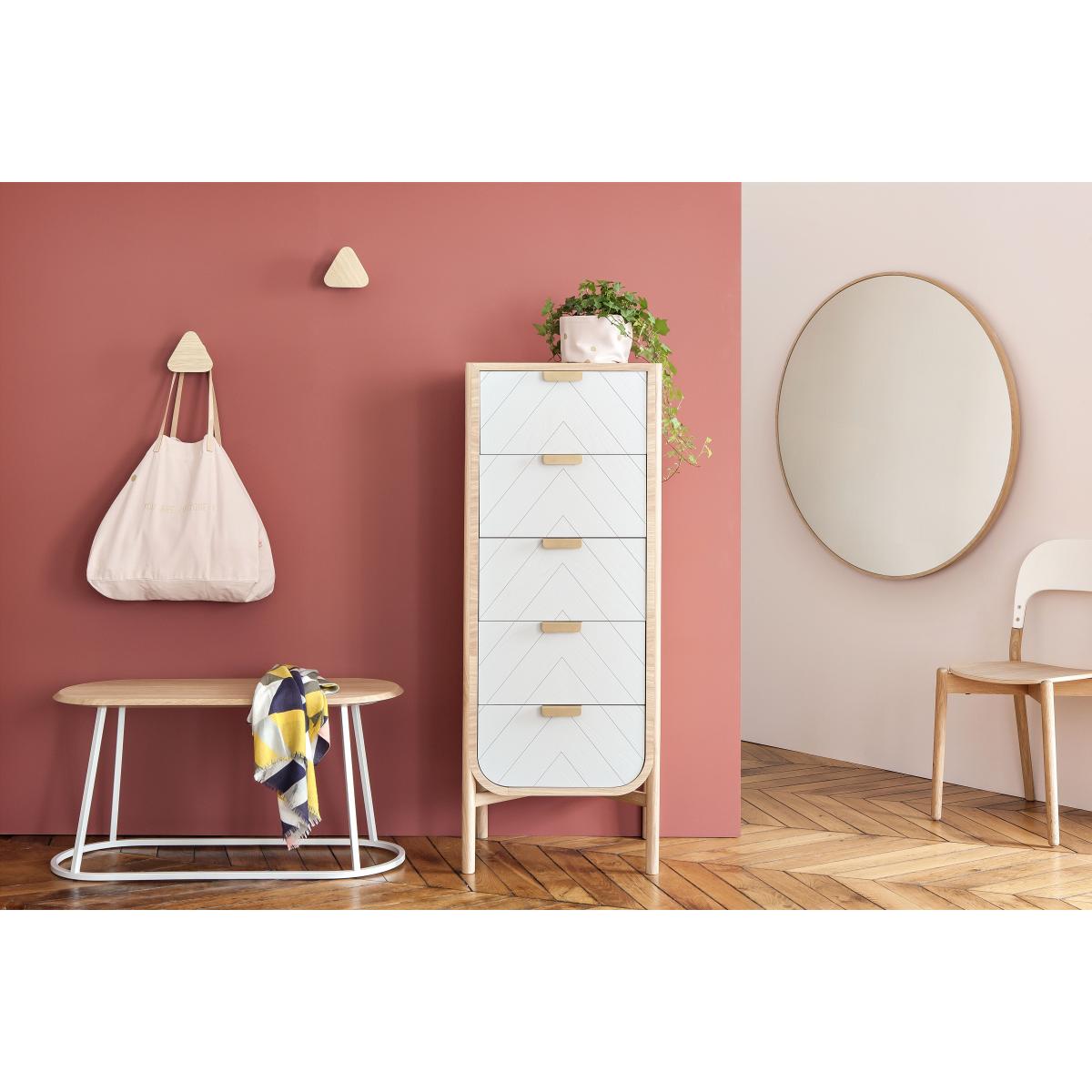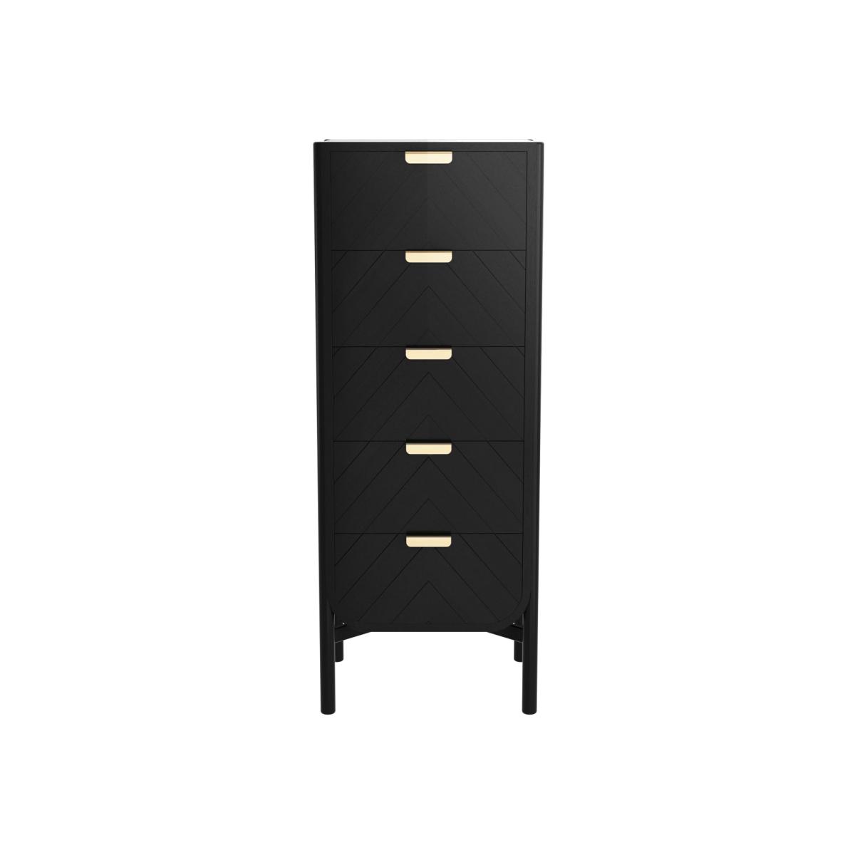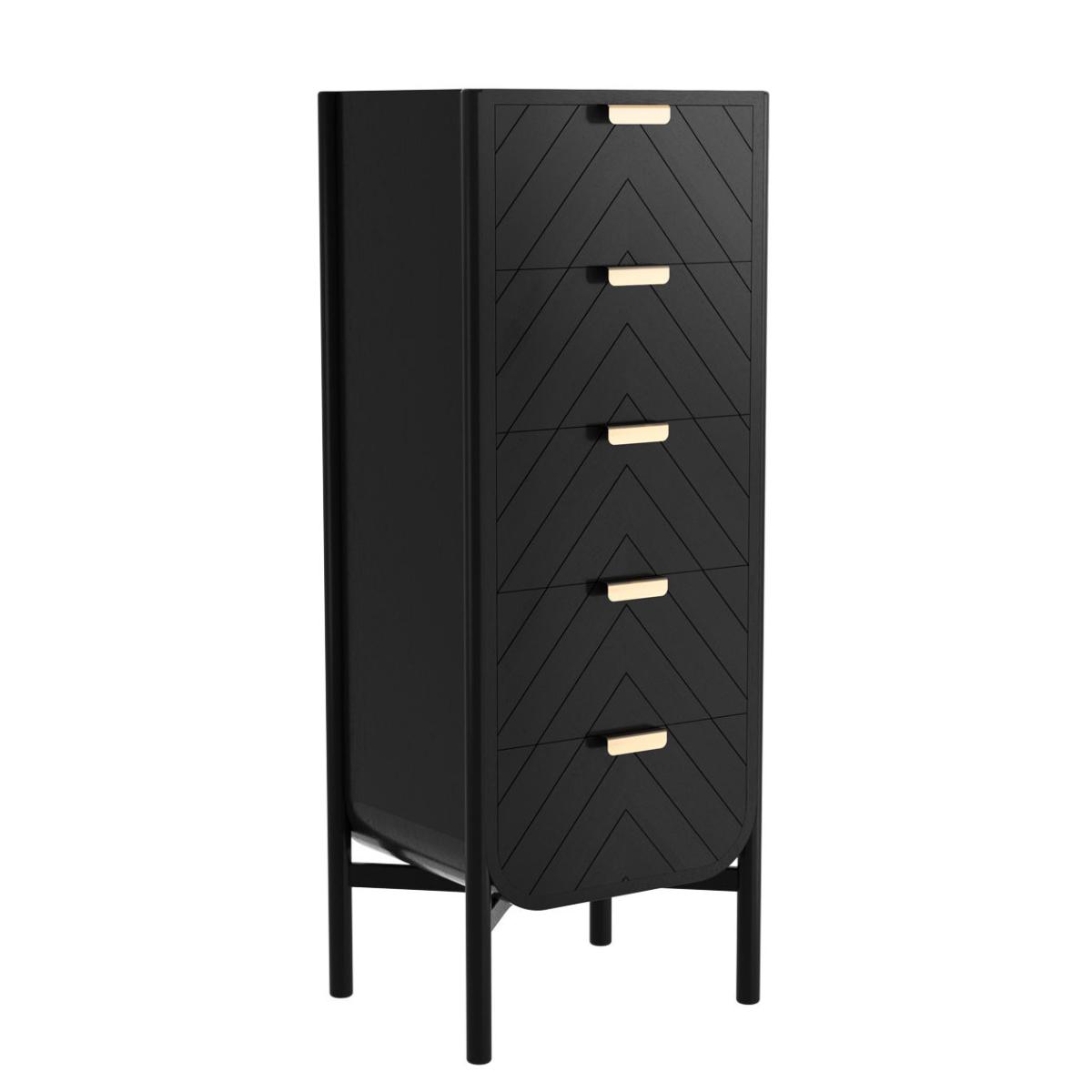 This superb chest of drawers in black-stained oak is an ingenious mix of retro lines and contemporary design. Drawing its inspiration from 50s Scandinavian furniture, it’s a sturdy, vintage-style item that has it all! With Marius, French designer Pierre-François Dubois designs a range inspired by the maritime world. The general shape of Marius evokes the hull of a boat while the oblique grooves that elegantly dress its facade draw its sails. This chest of drawers consists of five drawers fitted with nice brass handles.