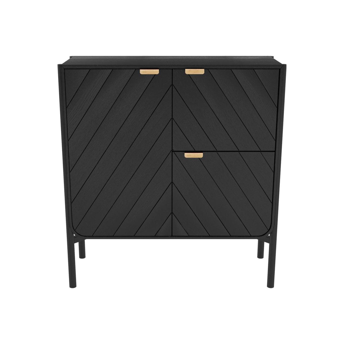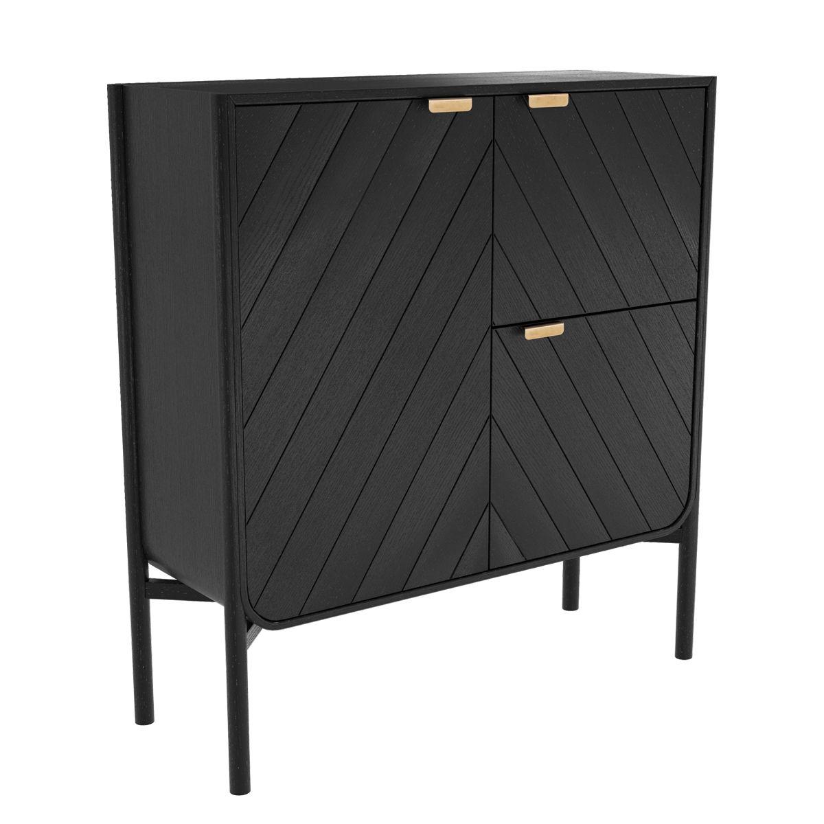 This superb dresser in black-stained oak is an ingenious mix of retro lines and contemporary design. Drawing its inspiration from 50s Scandinavian furniture, it’s a sturdy, vintage-style item that has it all! With Marius, French designer Pierre-François Dubois designs a range inspired by the maritime world. The general shape of Marius evokes the hull of a boat while the oblique grooves that elegantly dress its facade draw its sails. This dresser has 3 doors decorated with nice brass handles. The left compartment conceals 3 shelves. The bottom right-hand compartment hides 2 shelves. The top right door opens from the bottom, held by 2 hinges, and hides a single compartment.