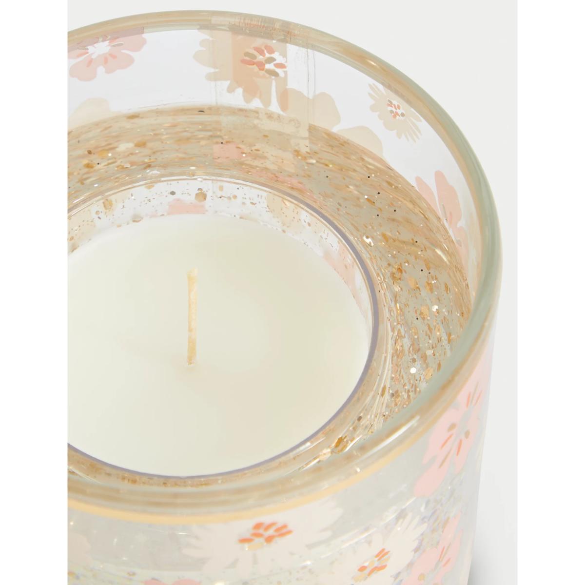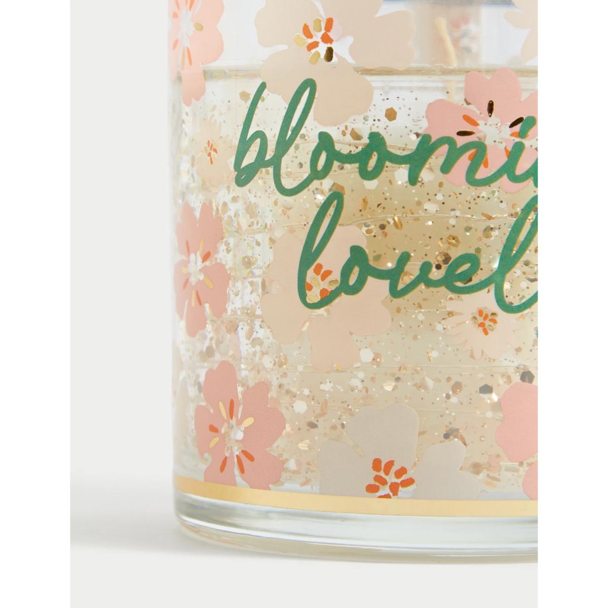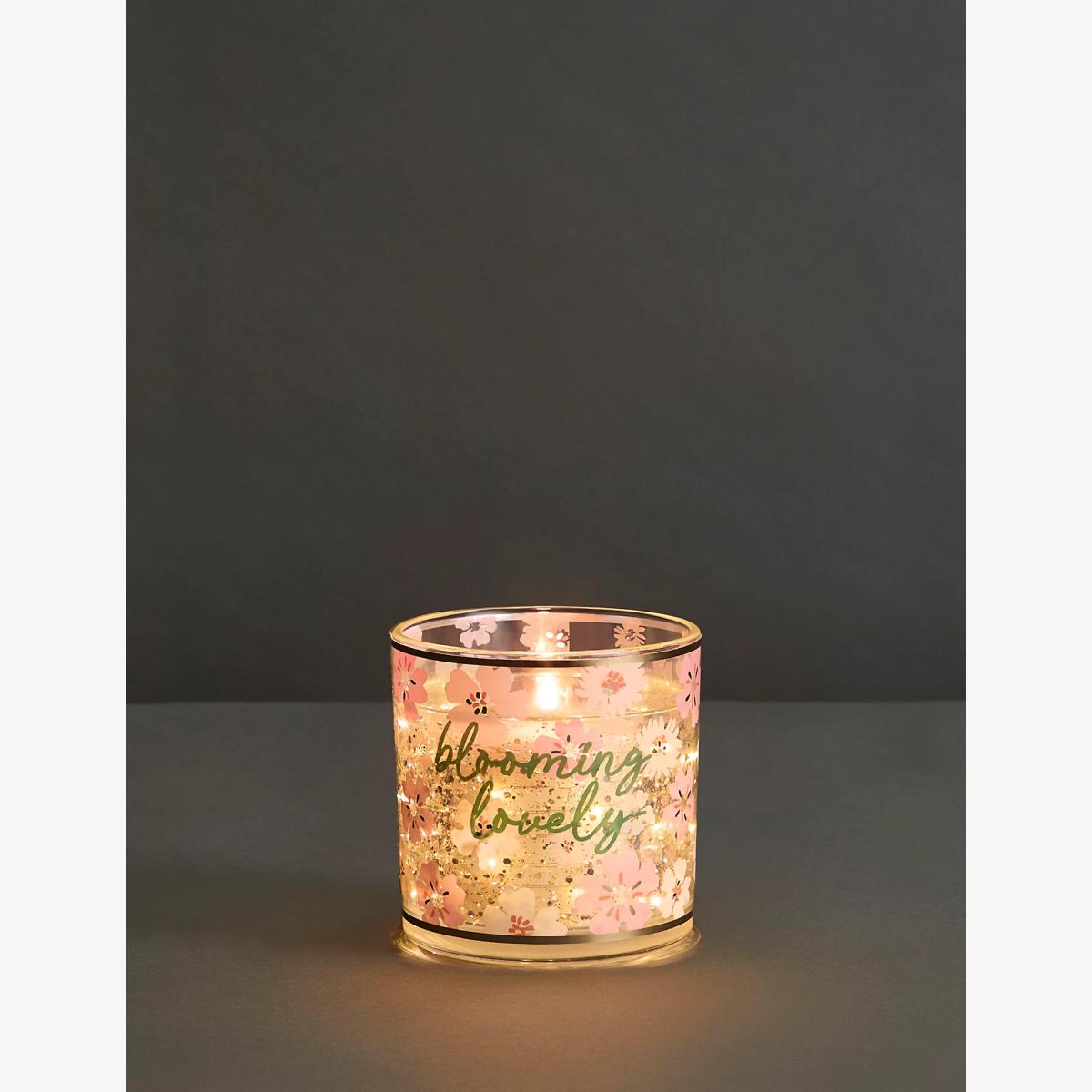 Bring extra charm to a loved one's home with our Marks & Sparkle™ light-up candle featuring sparkling glitter. It's scented with the fragrance of fresh spring blooms for a dreamy aroma. The floral print and 'Blooming lovely' slogan on the outside of the glass jar add stylish touches. This fragrance is part of the Herbal family of fragrances. Herbal scents are often considered to have soothing and relaxing qualities and may contain notes such as lavender, cedar wood, vetiver or eucalyptus.