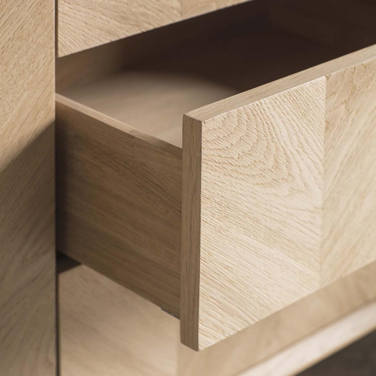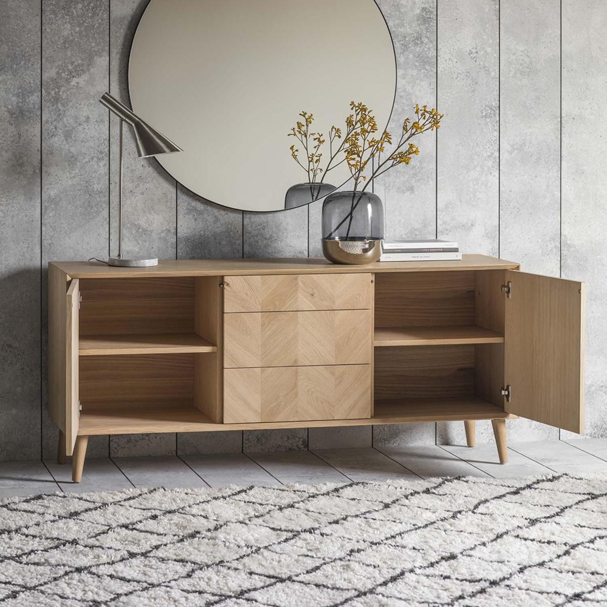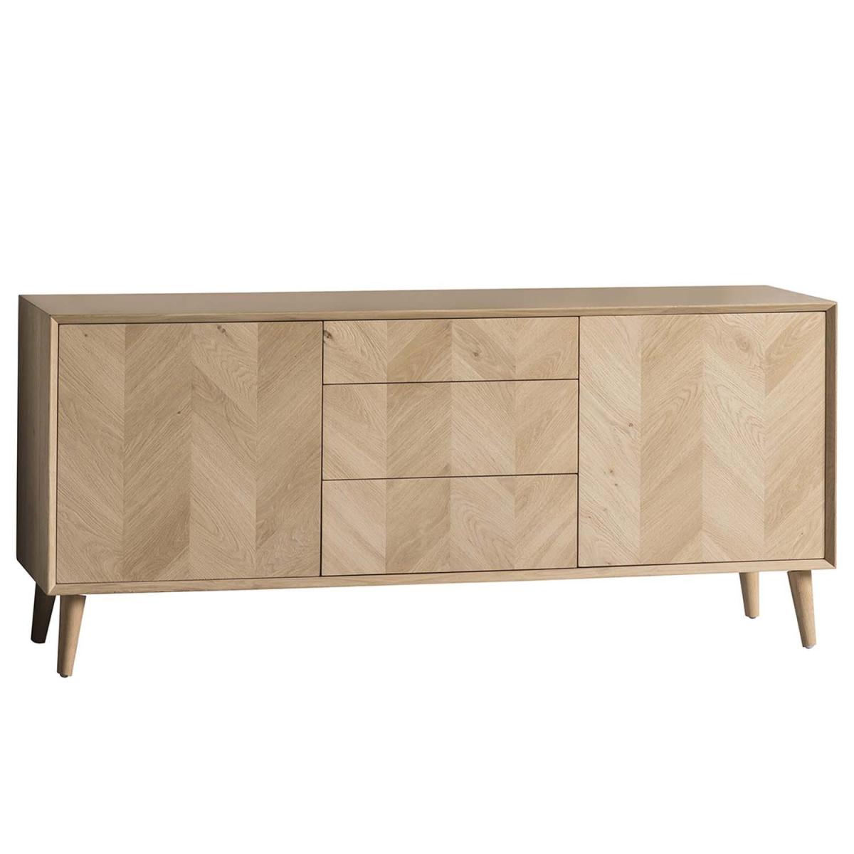 The Marley Sideboard makes a stunning and practical addition to the everyday dining room, living room, or hallway. Featuring a beautiful inlay chevron design, this sideboard is made using European oak and rustic oak structured veneers which show the natural beauty of the oak grain and knots. This beautiful surface is finished in a specialist matte lacquer, which keeps the timber looking natural and dry, with brushed out grain to make it look great in any family home. With two doors each concealing shelving, and three drawers, there is plenty of space to contain all of the things you need, as well as the top providing a surface for displaying ornaments.