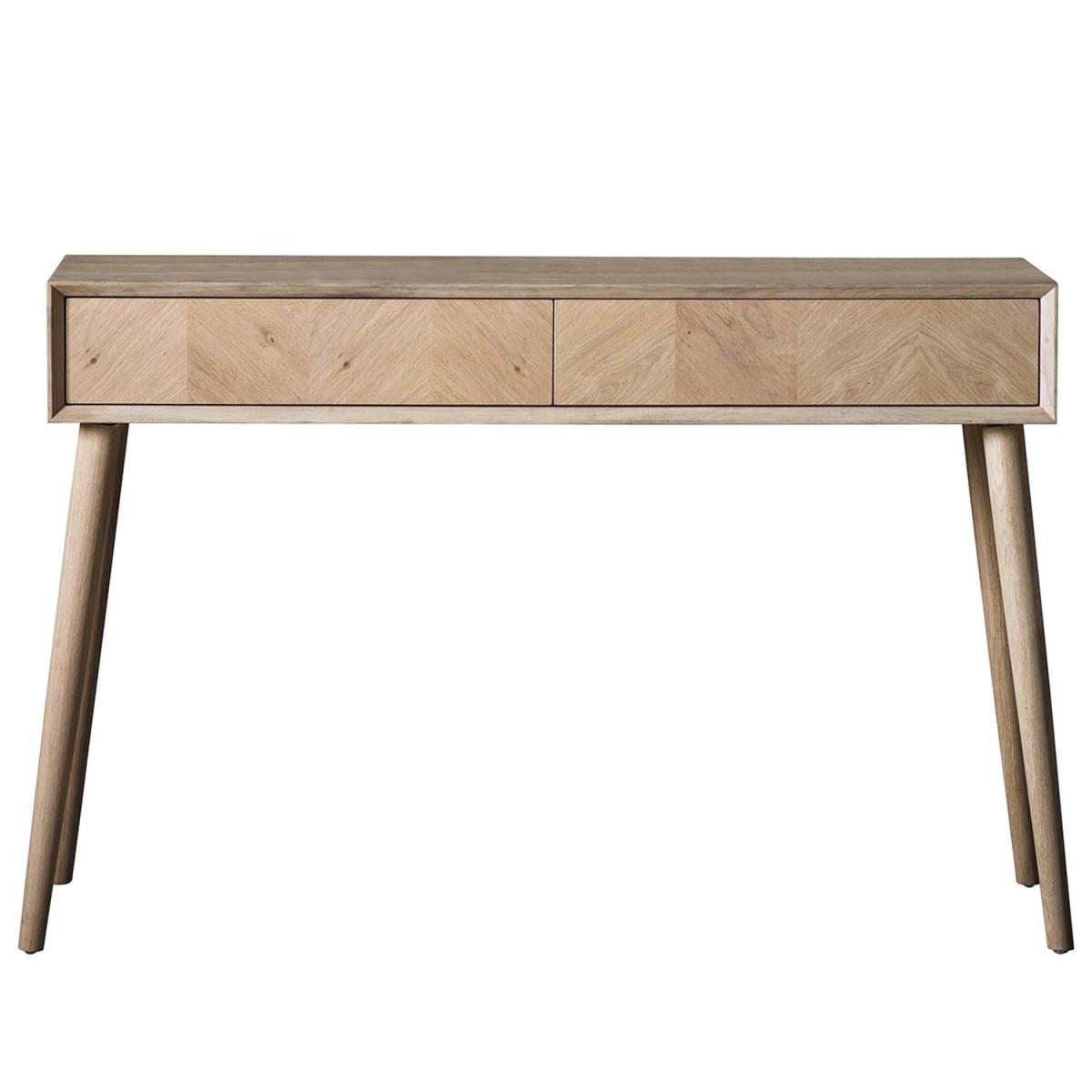 The Marley Two Drawer Console Table makes a stunning addition to the everyday living room. Featuring a beautiful inlay chevron design, this living room accent piece is made using European oak and rustic oak structured veneers which show the natural beauty of the oak grain and knots. This beautiful console table is finished in a specialist matte lacquer, which keeps the timber looking natural and dry, with brushed out grain to make it look great in your living room or hallway. For added practicality, it has two drawers, making it ideal as a dressing table, and looks great with the matching Marley mirror above it.