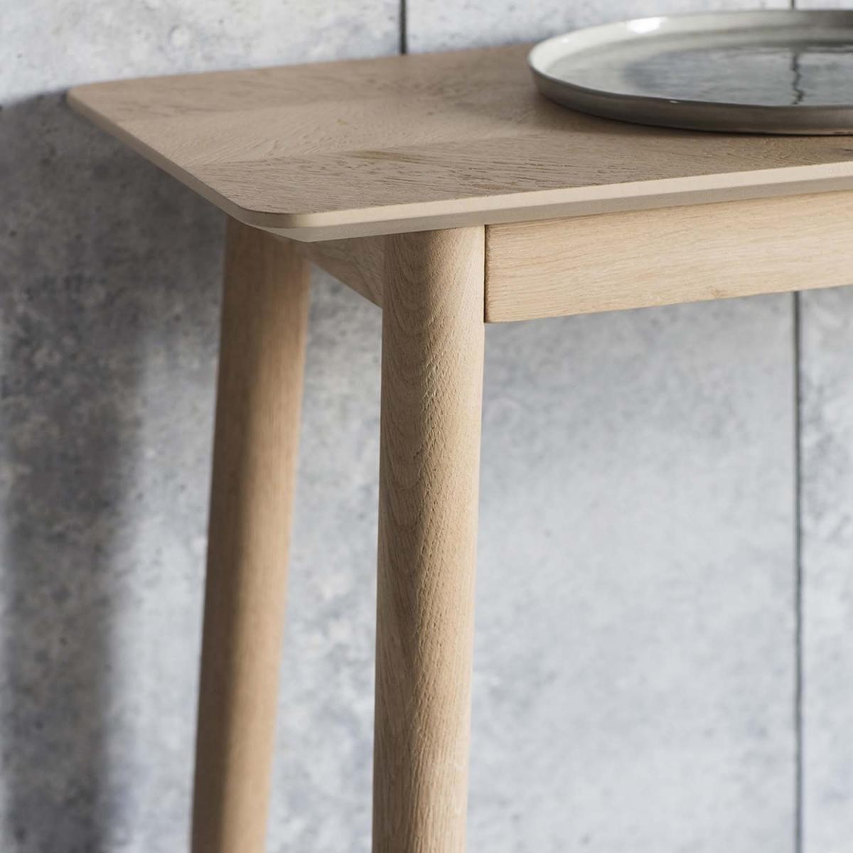 The Marley Console Table makes a stunning addition to the everyday living room. Featuring a beautiful inlay chevron design, this living room accent piece is made using European oak and rustic oak structured veneers which show the natural beauty of the oak grain and knots. This beautiful console table is finished in a specialist matte lacquer, which keeps the timber looking natural and dry, with brushed out grain to make it look great in your living room or hallway.
