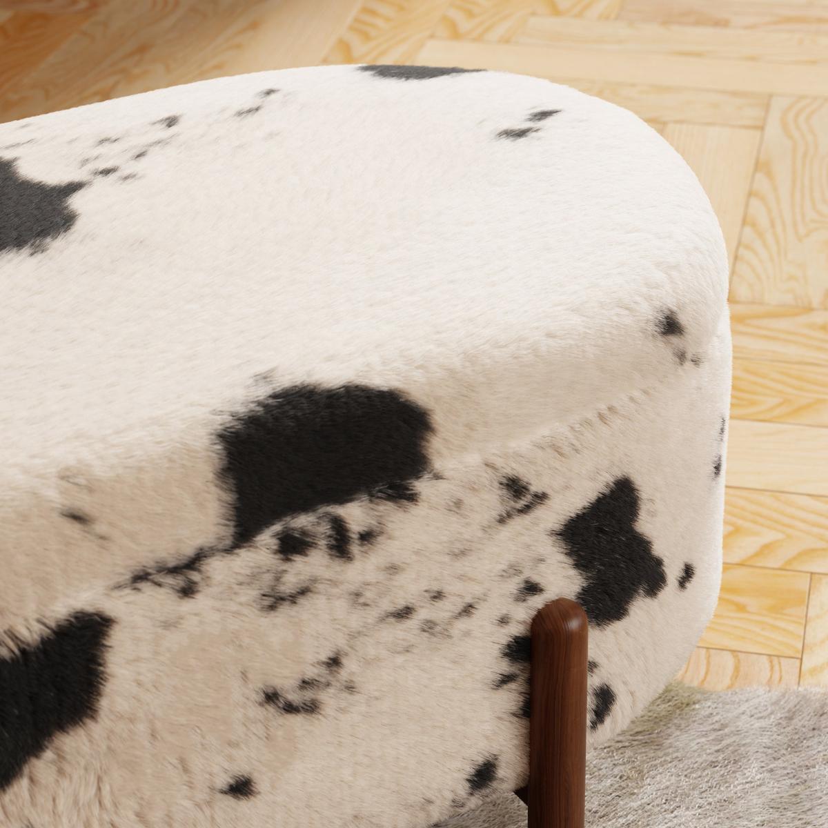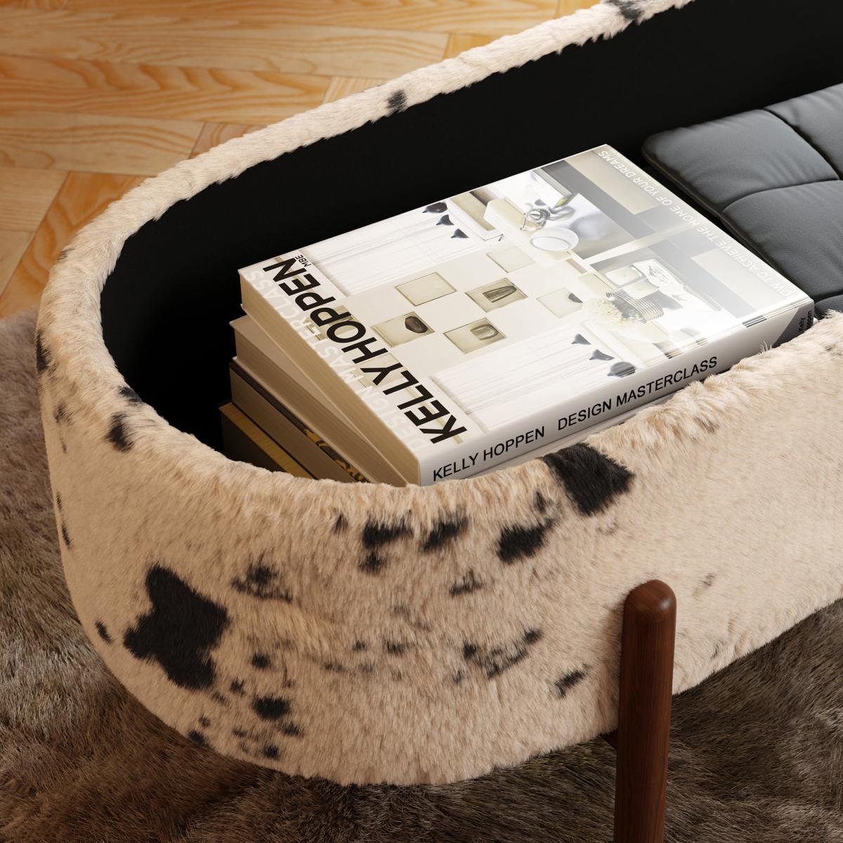 * Cow fur fabric * Walnut frame * Foam filled Make a bold statement in your home with this stunning storage ottoman, featuring a striking cow fur upholstery that’s as eye-catching as it is cosy. The rich walnut legs add a refined touch, creating a perfect balance of luxury and earthy charm. Whether you're looking for a stylish footrest or need extra storage for blankets, books, or other essentials, this piece is both practical and unique.