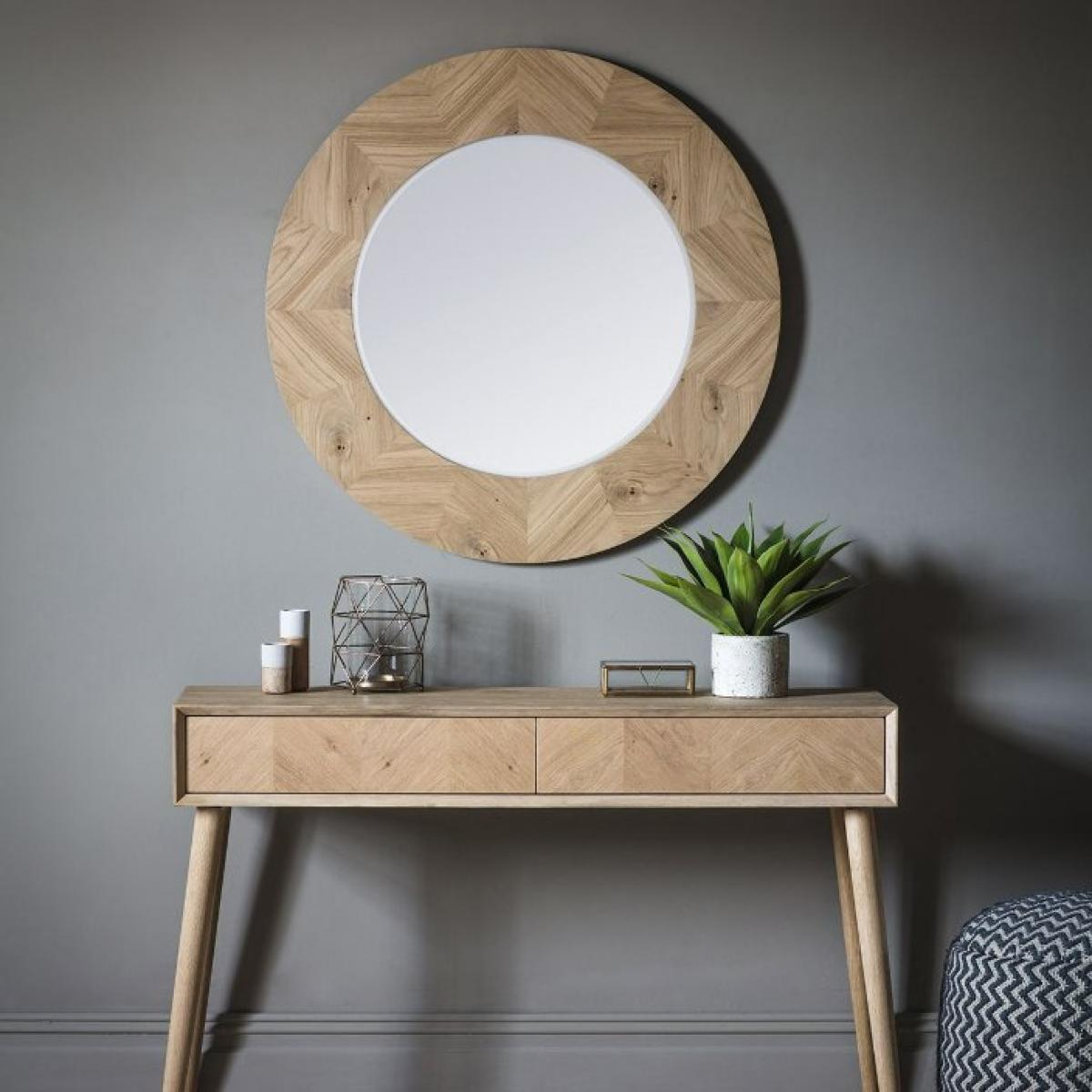 The Marley Round Mirror makes a stunning addition to any home. Featuring a beautiful inlay chevron design, this mirror is made using European oak and rustic oak structured veneers which show the natural beauty of the oak grain and knots. This beautiful mirror is finished in a specialist matte lacquer, which keeps the timber looking natural and dry, with brushed out grain to make it look great in any family living space, bedroom, or hallway.