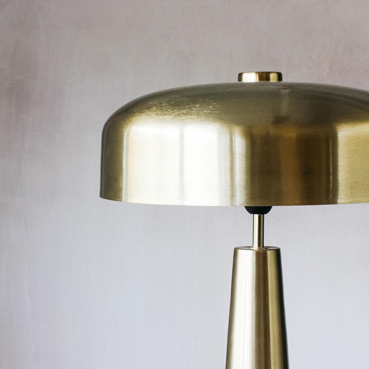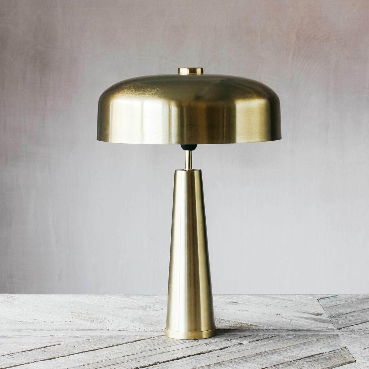 A curvy cocoon of soft lighting, the Marlon Table Lamp features a conical base and a domed shade finished in brass.