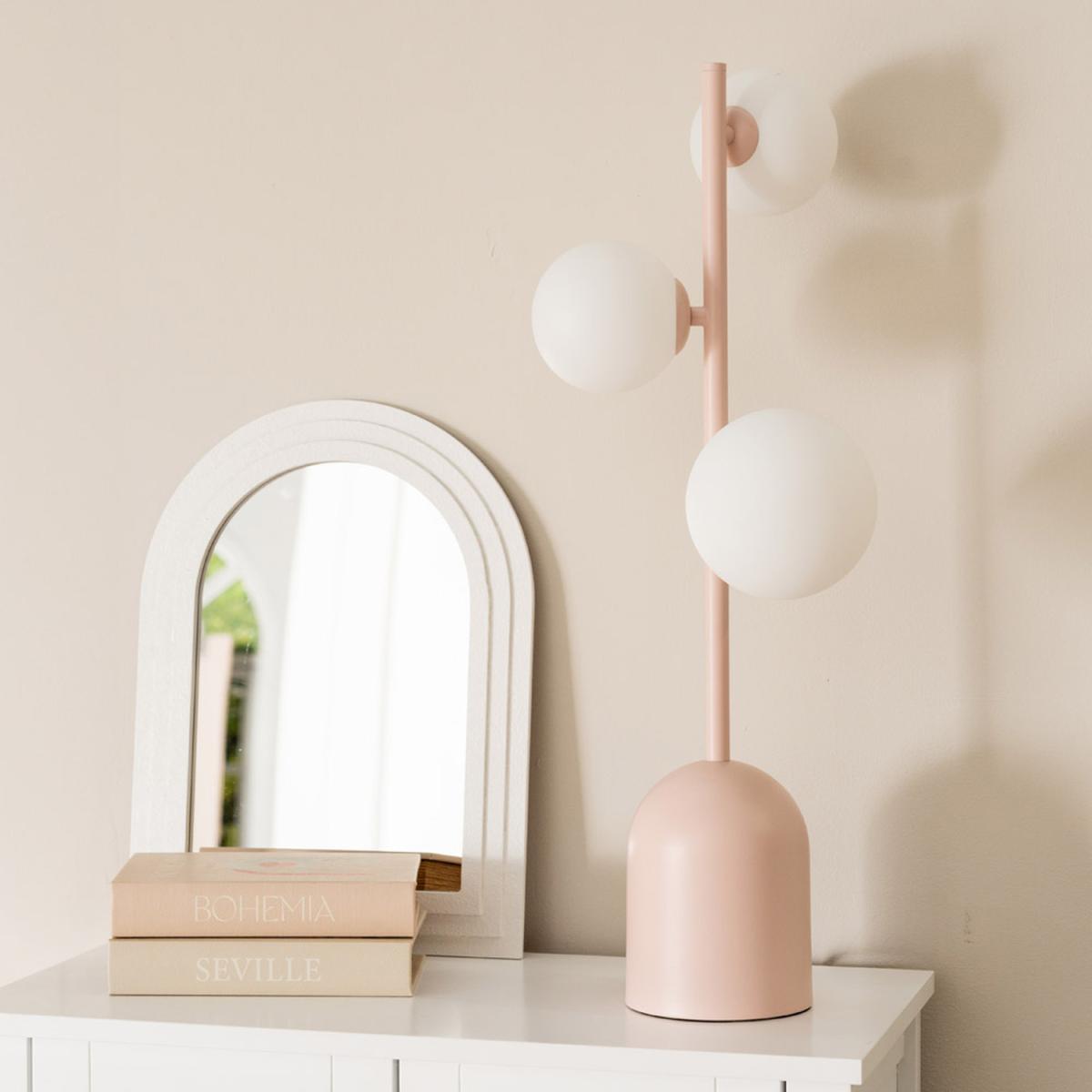 This table lamp is designed to help brighten your space whilst creating a chic and cozy atmosphere in your home. Featuring a metal stem in a blush finish with three glass globe lampshades. The opal glass shades offer a warm glow of light, the perfect complement to the metal base. This light is sure to be a showstopper that'll brighten up your home. Please note - we have matching items available in our shop.