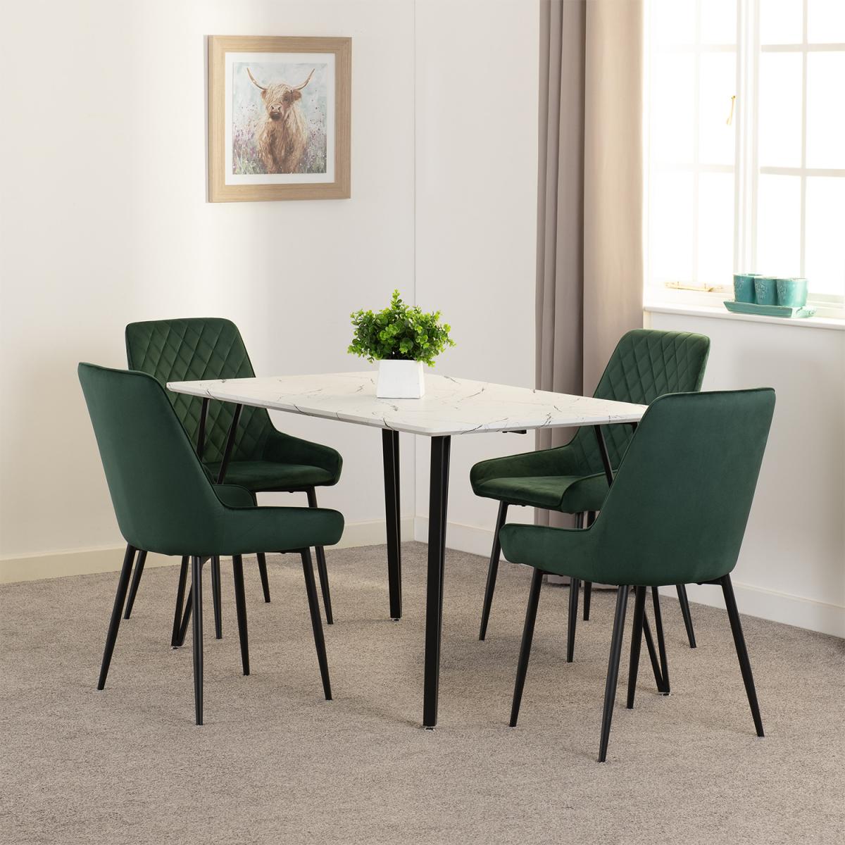 Introducing the Seconique Marlow Dining Set with Avery Chairs, a harmonious blend of contemporary design and luxurious comfort. This set features a sleek rectangular dining table adorned with a sophisticated white marble-effect finish, perfectly complemented by four plush Avery chairs upholstered in rich emerald green velvet, grey velvet or sapphire blue UK Mainland delivery only, between 9 am and 9 pm (weekdays) the courier will contact you on the day of delivery to offer a time slot. This takes place within 10 working days (Ground floor only). Please also ensure that we have a note of your up-to-date address and contact information, to be passed to the couriers.