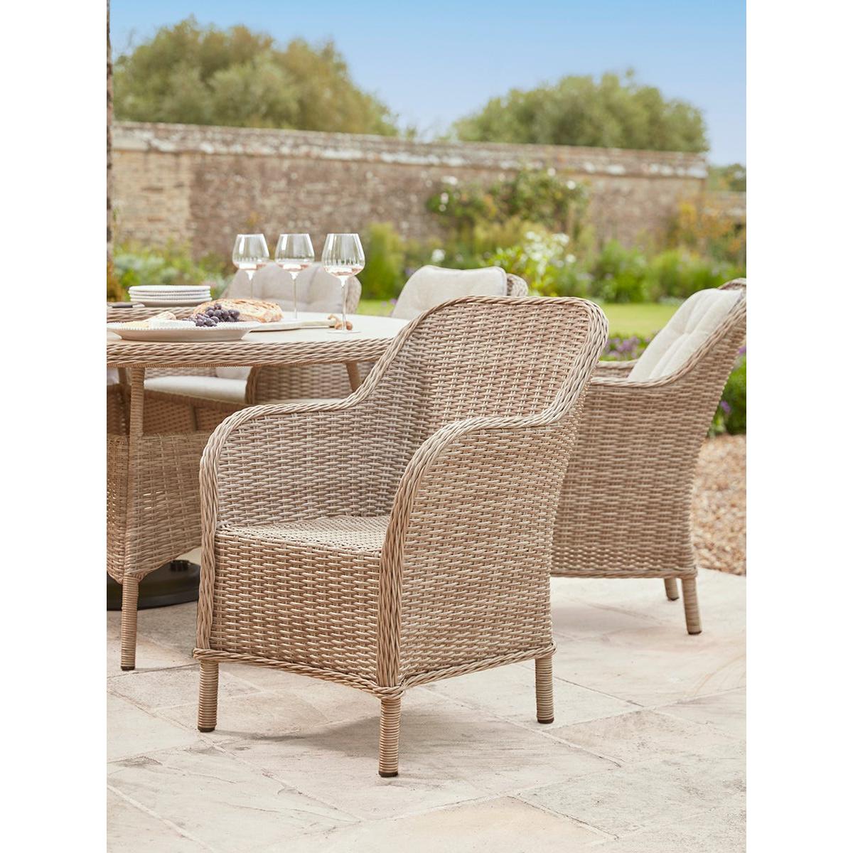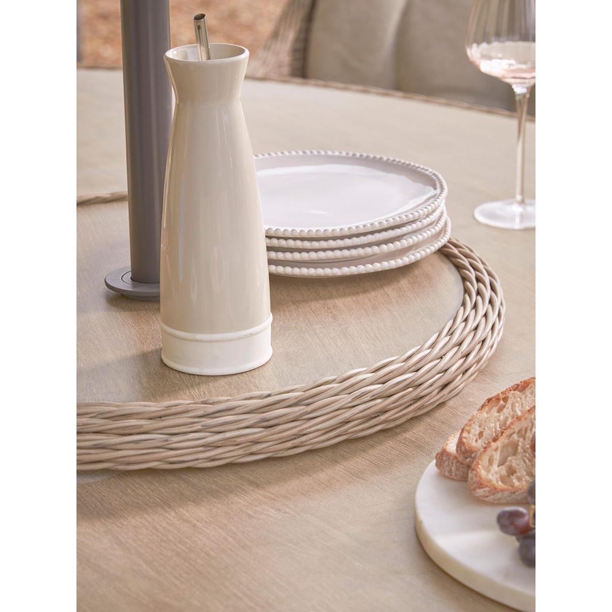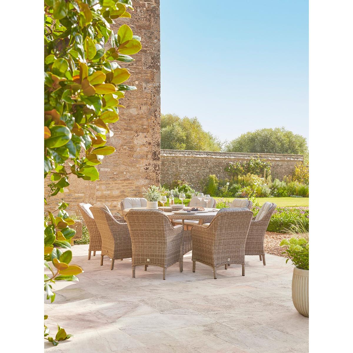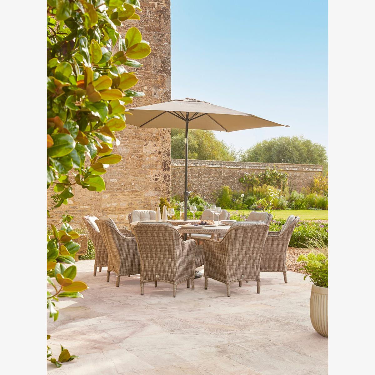 Full of rustic country charm, our Marlow Dining Set features chairs made from an authentic looking faux rattan weave with broad backs and elegant curved arms. The comfortable rattan seats are softened with opulent buttoned back cushions and seat pads in a weatherproof fabric that will shrug off summer showers and retain its colour even after long periods of exposure to the sun. The round table features a toughened glass top printed with a realistic wood finish and has a central serving table that rotates. The eight seat outdoor dining set comes with a natural toned parasol which has a tilt mechanism. Browse our useful Outdoor Furniture Buying Guide.