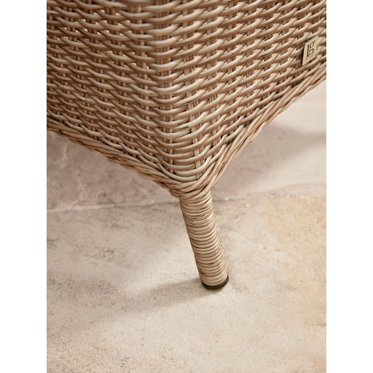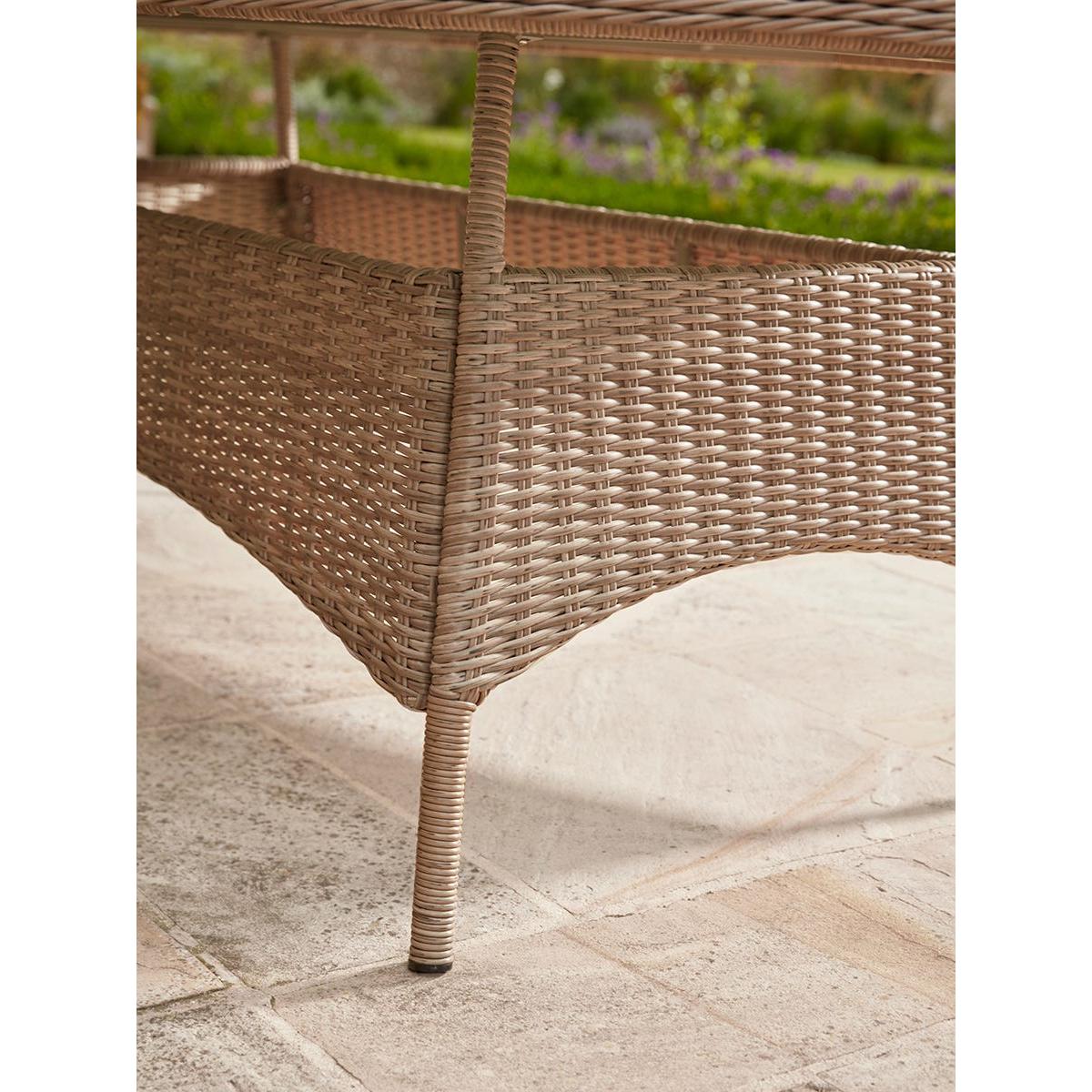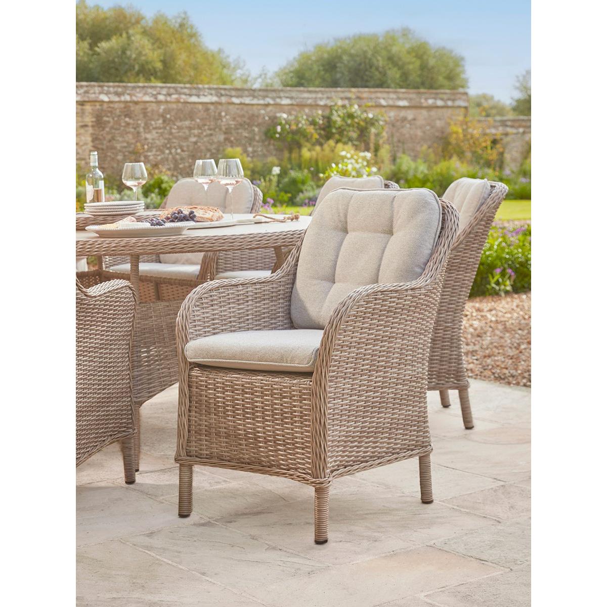 Full of rustic country charm, our Marlow Dining Set features chairs made from an authentic looking faux rattan weave with broad backs and elegant curved arms. The comfortable rattan seats are softened with opulent buttoned back cushions and seat pads in a weatherproof fabric that will shrug off summer showers and retain its colour even after long periods of exposure to the sun. The round table features a toughened glass top printed with a realistic wood finish and has a central serving table that rotates. The eight seat outdoor dining set comes with a natural toned parasol which has a tilt mechanism. Browse our useful Outdoor Furniture Buying Guide.