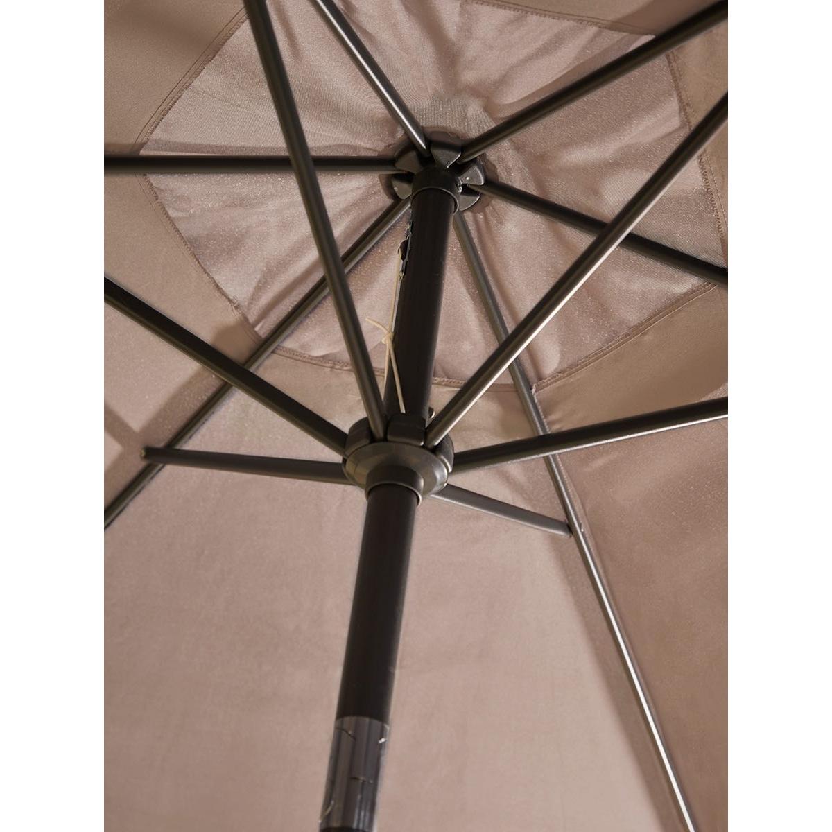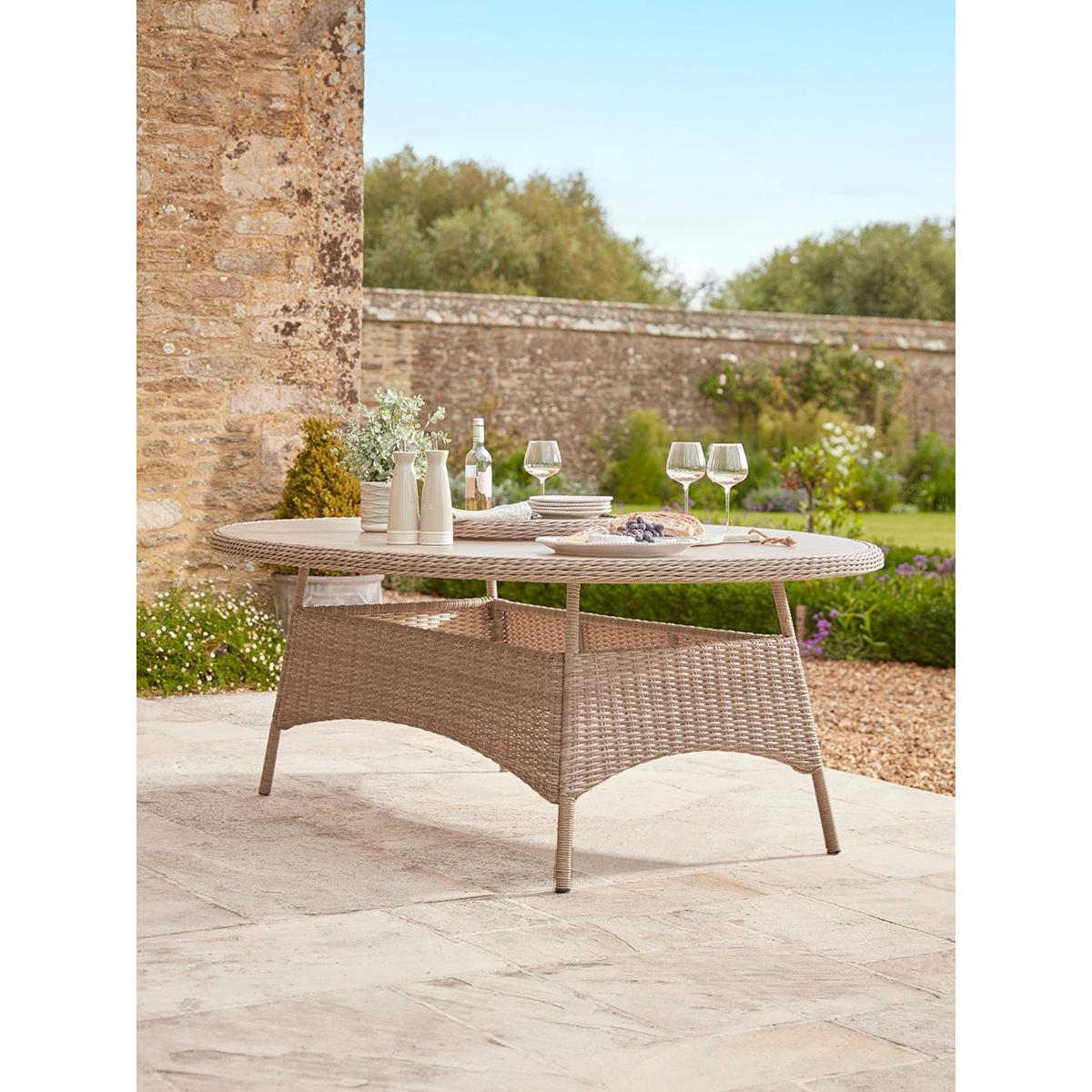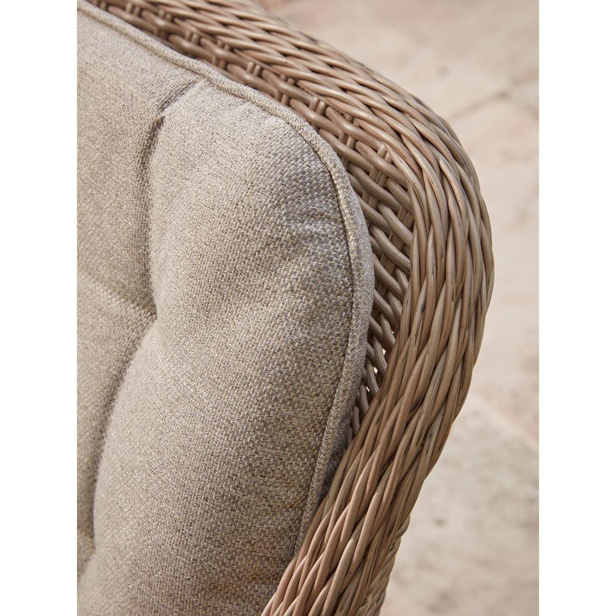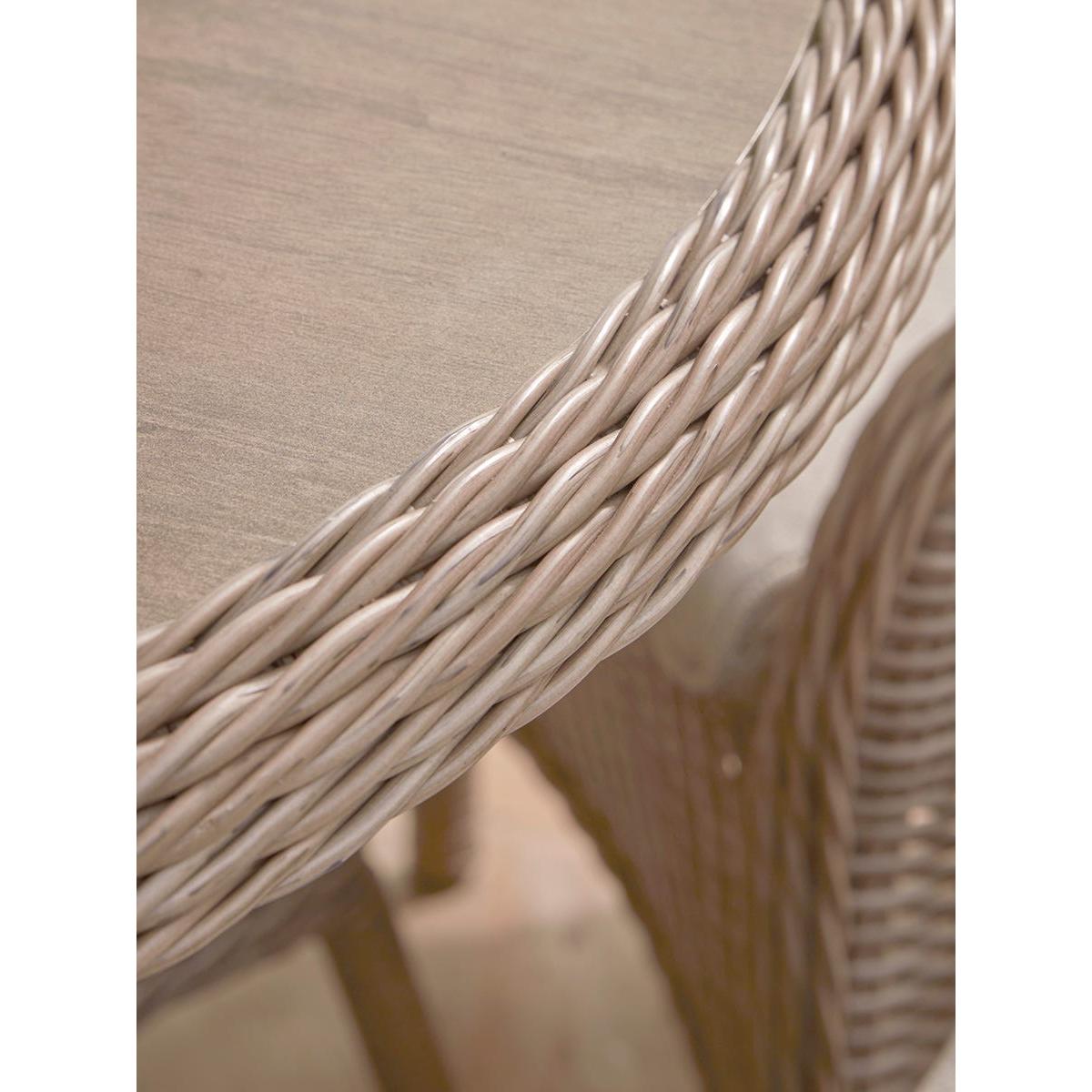 Full of rustic country charm, our Marlow Dining Set features chairs made from an authentic looking faux rattan weave with broad backs and elegant curved arms. The comfortable rattan seats are softened with opulent buttoned back cushions and seat pads in a weatherproof fabric that will shrug off summer showers and retain its colour even after long periods of exposure to the sun. The round table features a toughened glass top printed with a realistic wood finish and has a central serving table that rotates. The eight seat outdoor dining set comes with a natural toned parasol which has a tilt mechanism. Browse our useful Outdoor Furniture Buying Guide.
