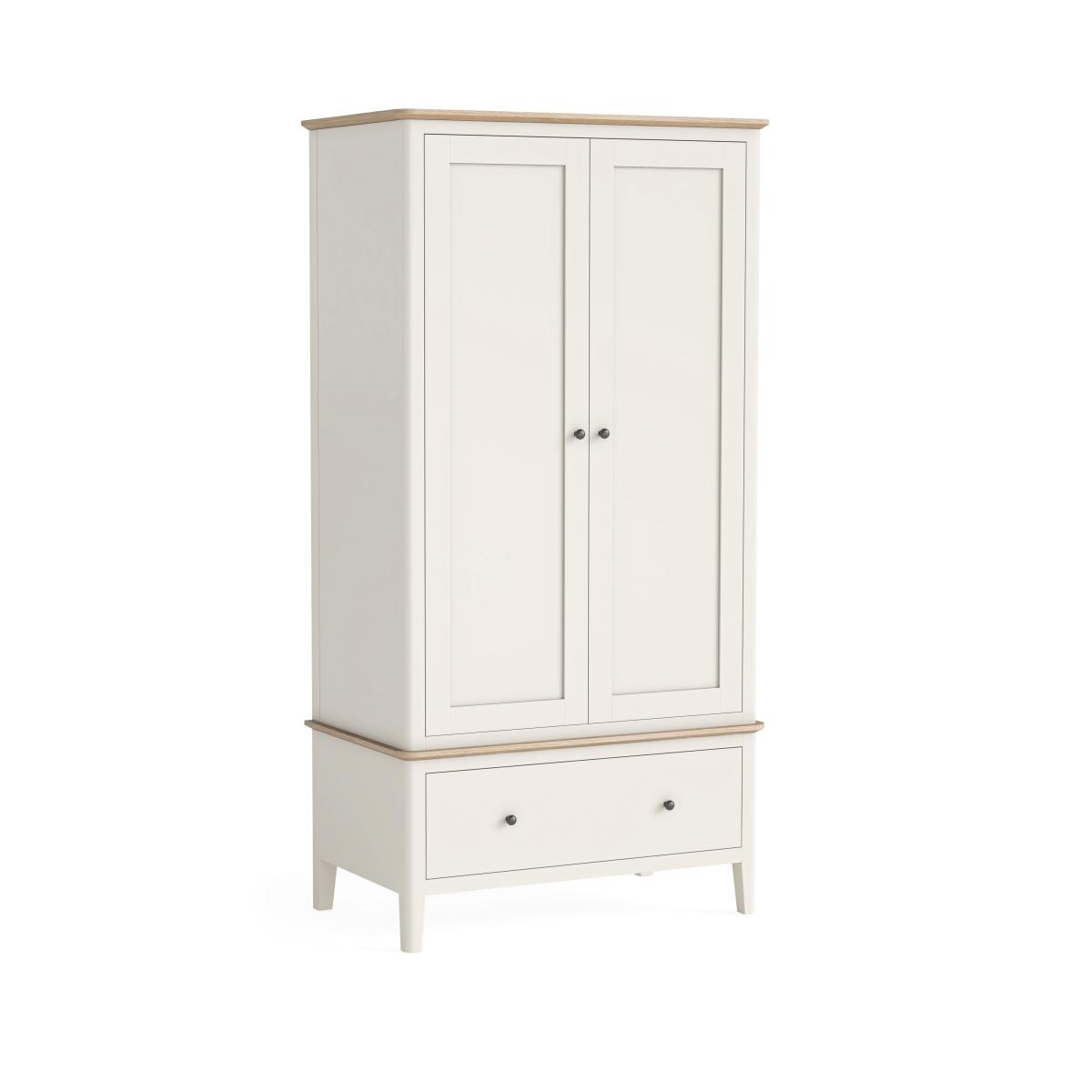 * Painted pine* 1 large drawer* Single hanging rail Constructed from painted pine, this wardrobe combines rustic charm with modern practicality. It features two spacious doors that open to reveal a generous hanging rail, perfect for organising your clothes and keeping them wrinkle-free. At the base, a sturdy drawer provides additional storage for accessories, shoes, or other essentials.