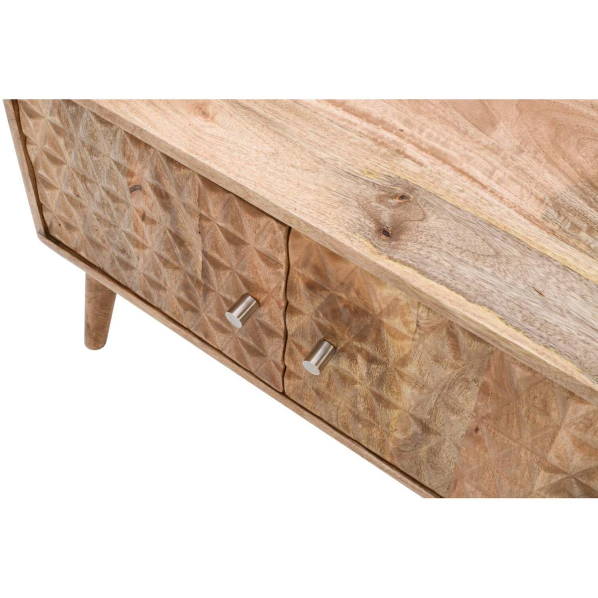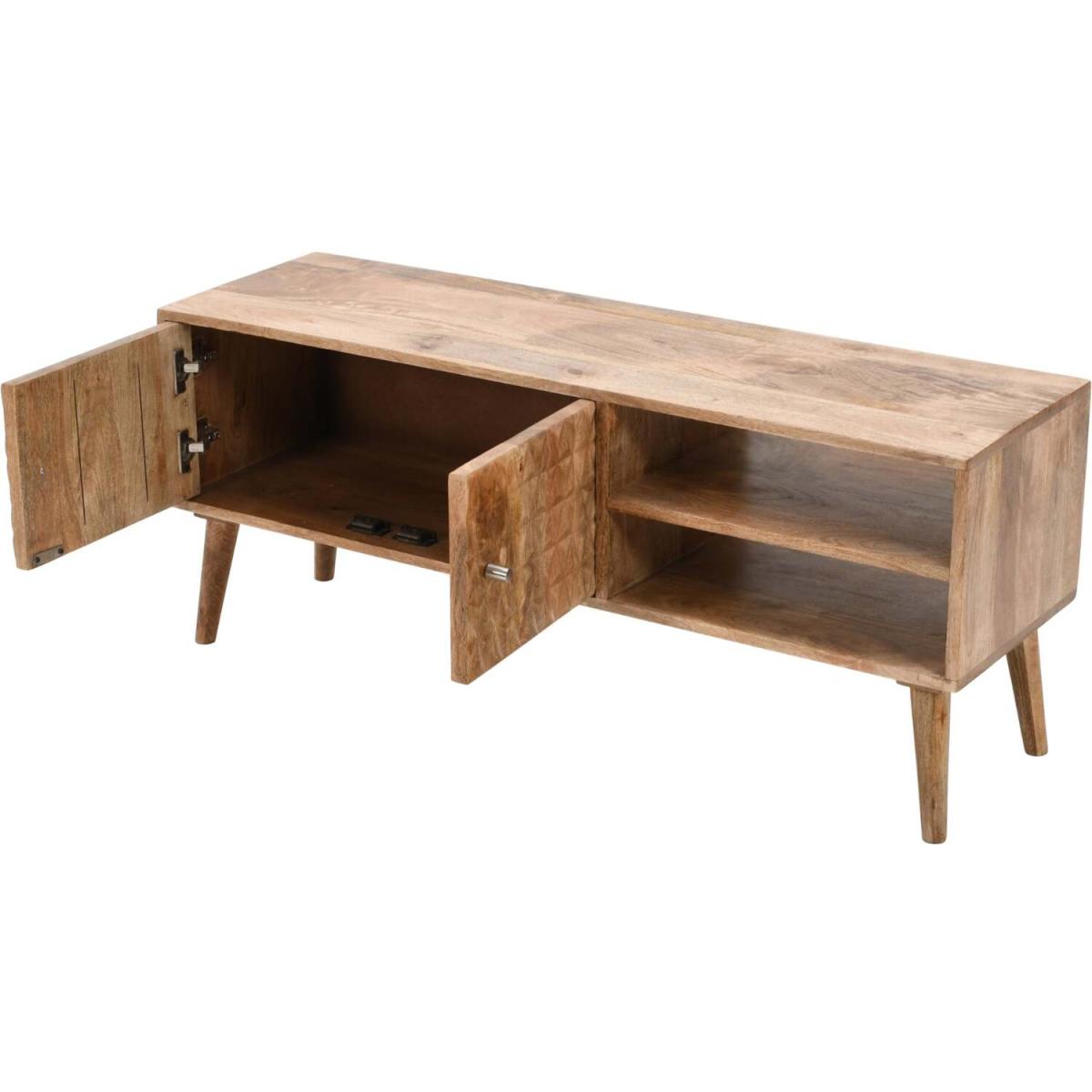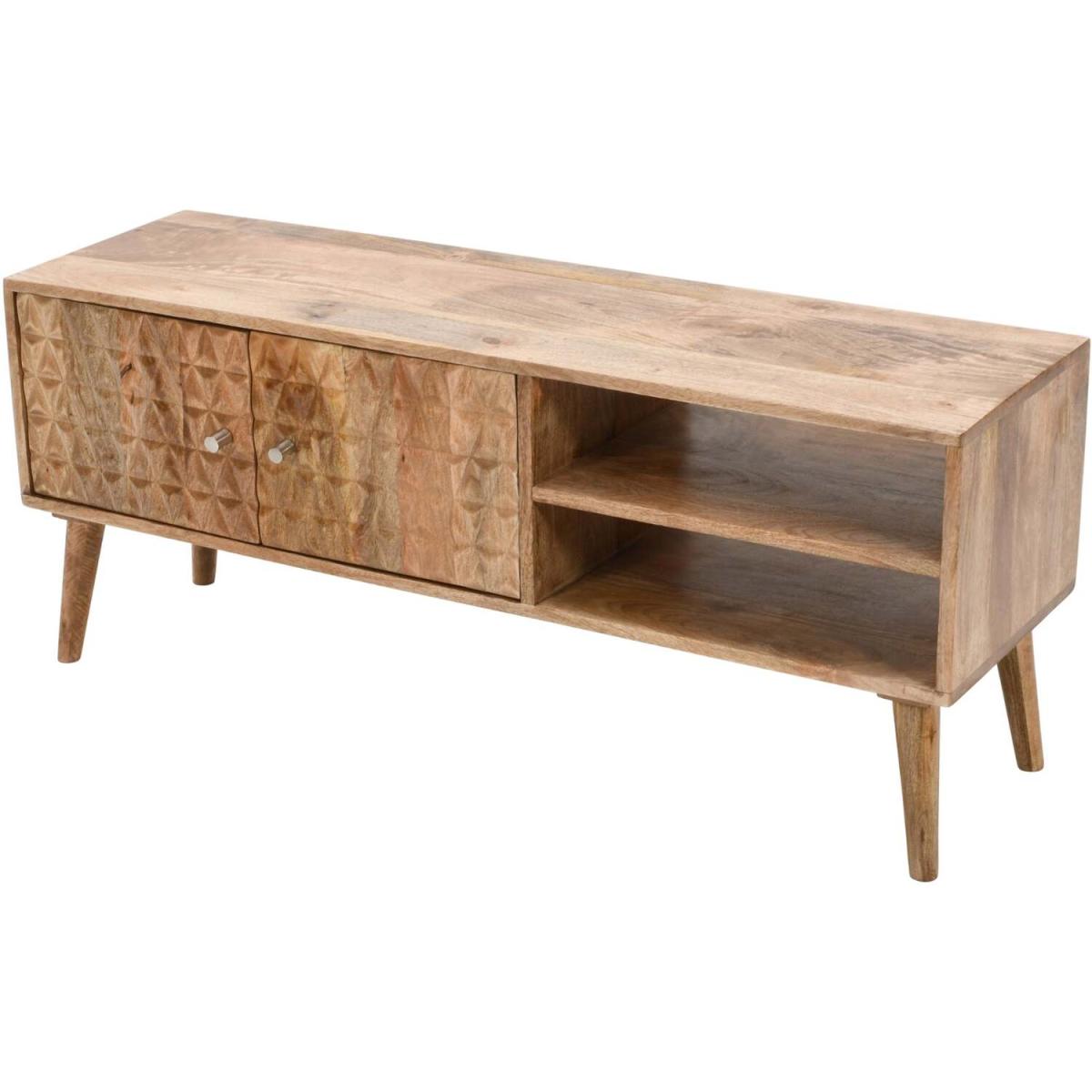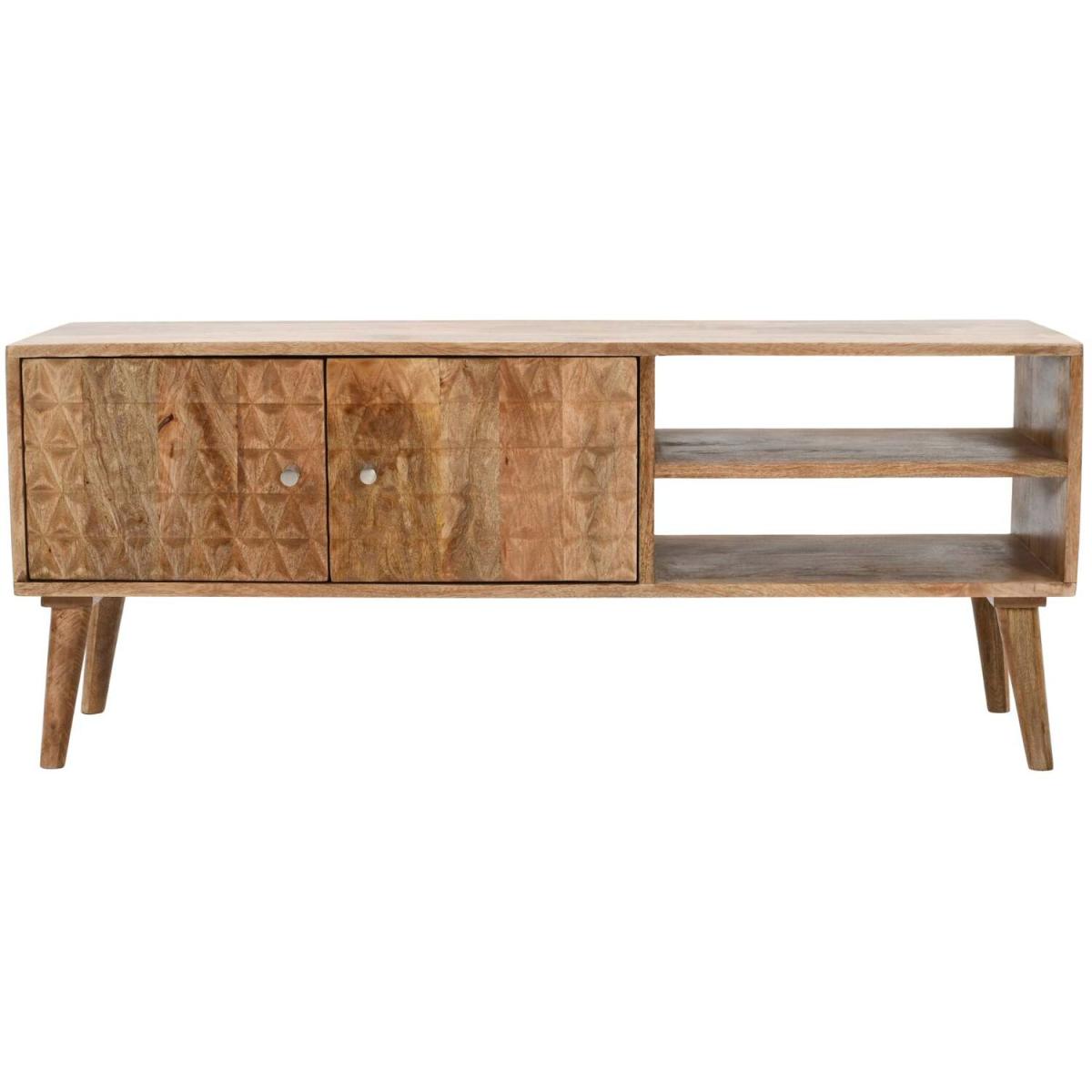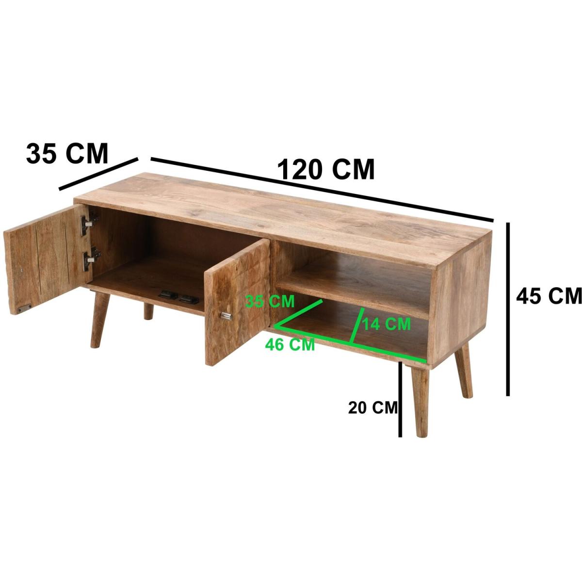 The precision CNC cutting on this range of furniture is a work of art and is especially dominant on this TV stand. Featuring 2 doors for storage and 2 open areas to accommodate your media equipment this is definitely a focal point in your room. Big enough to hold most modern TV's, although the beautiful natural wood top is stunning if a smaller tv is used. The modern style will blend in to any existing decor you may have and is delivered ready made. Handmade entirely by skilled craftsmen in India using 100 eco sourced natural wood making each piece individual and unique.