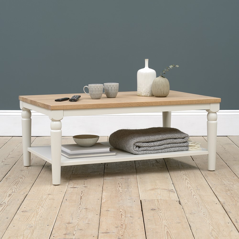 Blending elegant design with a timeless feel, our Marlow Pale Grey Coffee Table will make the perfect focal point for your living room. The solid oak top - retaining its knots and natural grain - beautifully complements the soft grey satin finish, while hand-turned legs add a stylish yet feminine feel. Ideal for stacking books or magazines, the painted shelf adds some much needed storage to this solid oak coffee table.