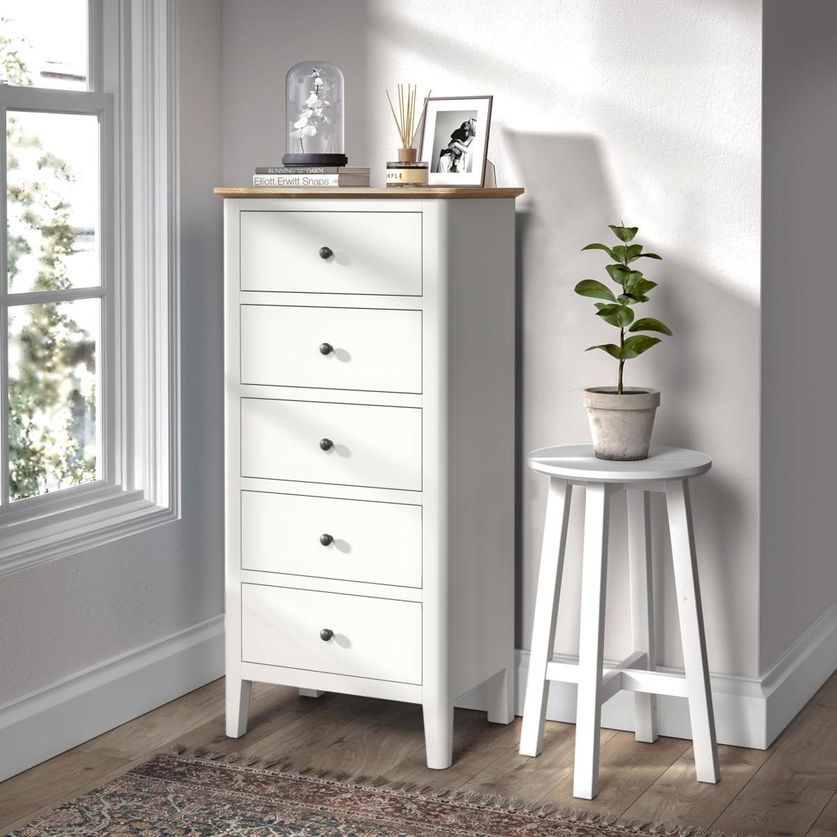 I’m a fan of this tallboy for its slim, five-drawer design and crisp white finish topped with a natural oak effect - it brings both storage and light into a room without feeling bulky. It sits equally well in Scandi-inspired or modern coastal schemes, and its simple lines make it a versatile piece for bedrooms, hallways or even a dressing area. For styling, keep the top surface clutter-free: try a small potted plant, a brass reading lamp and a shallow tray for keys or jewellery. Pair it with soft linens, woven baskets on the floor and a framed print above to create a layered look that’s practical and pared-back.
