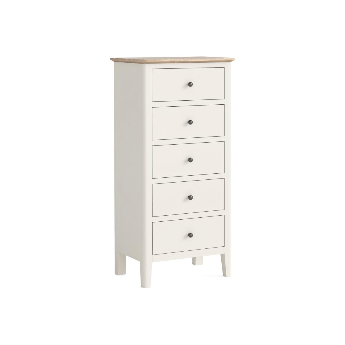 5 Drawers Painted pine No assembly required With its sleek design and sturdy construction, this tallboy offers ample storage space without taking up much floor space. It features multiple drawers, providing versatility for organising clothes, accessories, or any items you need to keep within reach. The smooth painted finish enhances its timeless appeal, making it suitable for various bedroom decors.