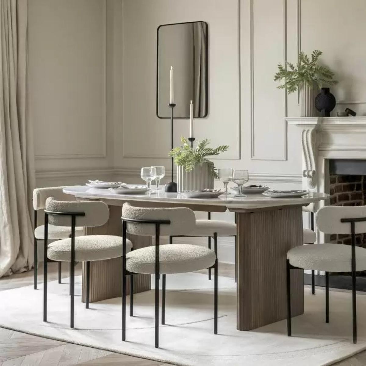 This on trend dining table offers a modern classic look. Crafted from solid mango wood, with a striking vertical ribbed feature on the legs, and a polished Indian white Carrera marble top with classic grey/blue veins running through it, the table exudes timeless quality & beauty. Matching pieces are available.
