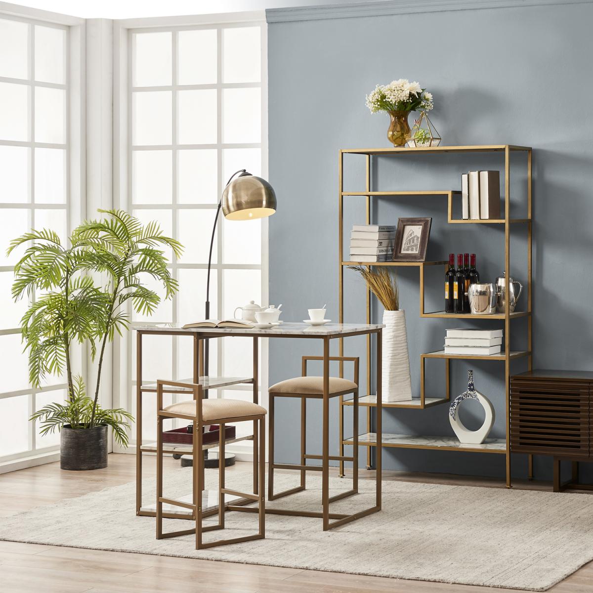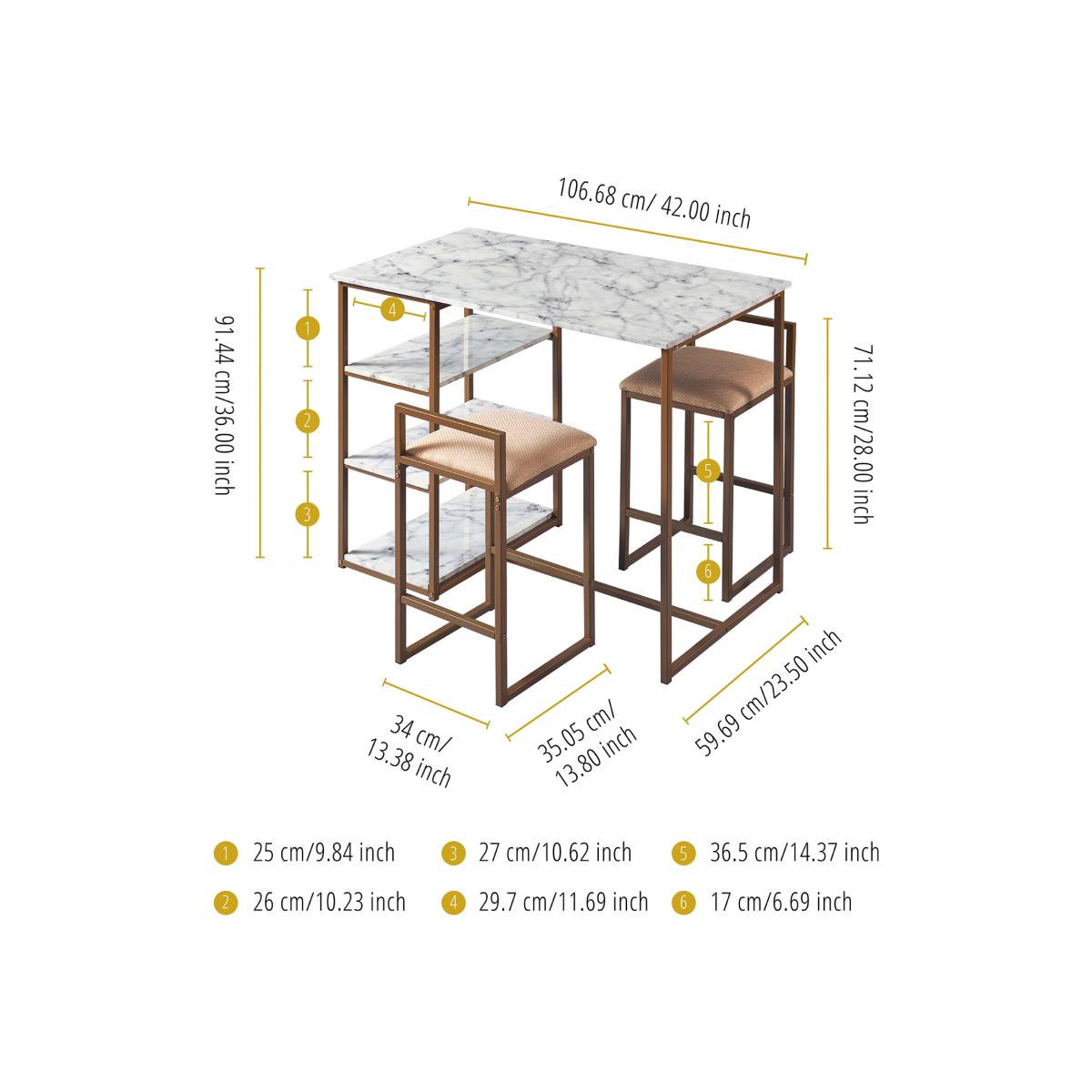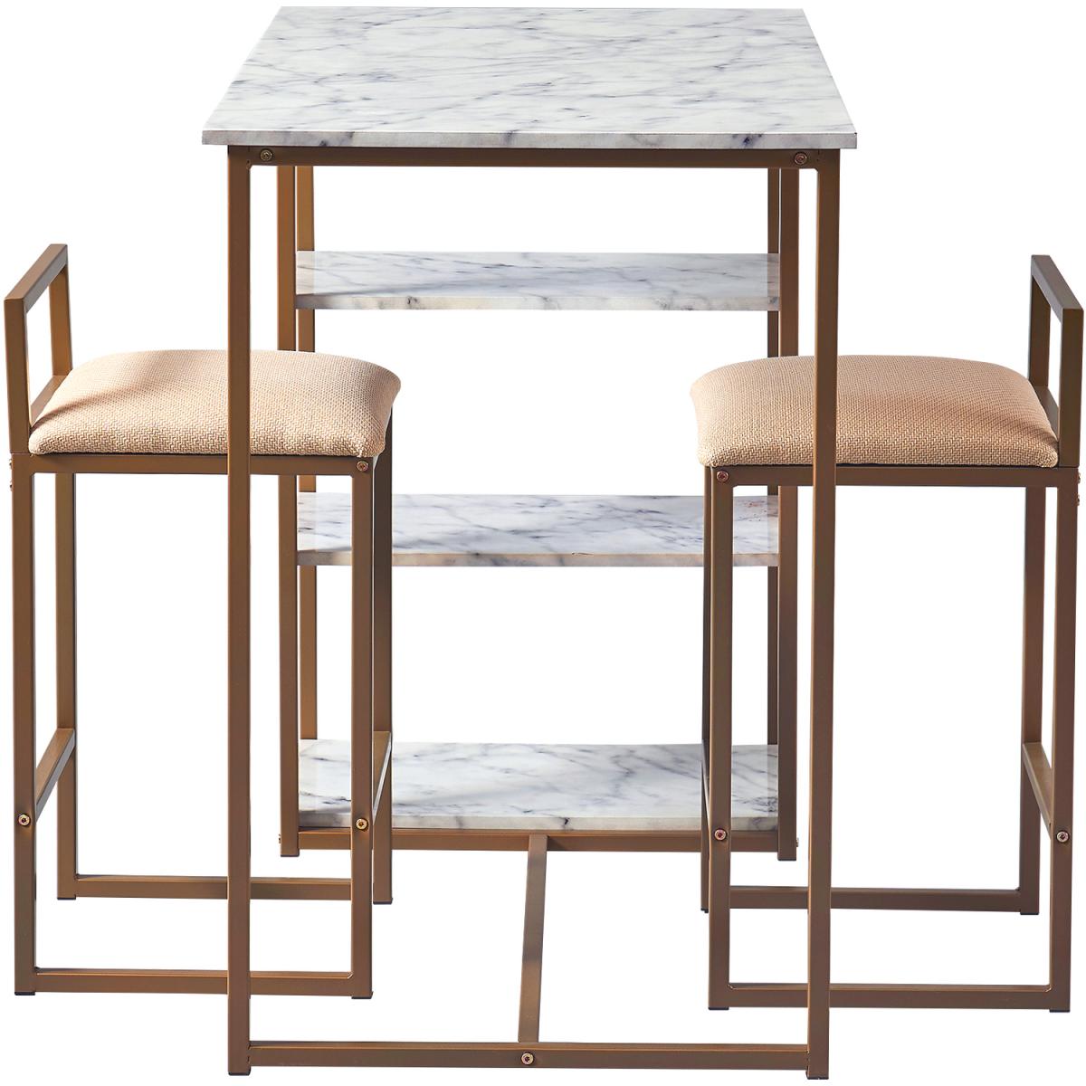 Teamson Home Marmo Breakfast Dining Set, Bar Table 2 Padded Stool Chairs with Storage is the perfect space-saving solution! Whether you need some extra space to set up for a social gathering when cooking family meals, or you just want a cosy place to enjoy a quick breakfast in the morning, this three-piece counter set with three-tier shelves is a must for your home. Unlike traditional dining tables, the Marmo breakfast table adds a bit of a bistro mood to your breakfast area, while the stools tuck neatly under the table for space-saving convenience. This versatile dining set showcases a classic touch as a breakfast nook for any dining space. Teamson is a global lifestyle home designs brand bringing joy into every home through beautiful, quality pieces made for stylishly comfortable everyday living. Teamson Home is our flagship brand continuing our tradition of beautiful high-quality designs including versatile indoor and outdoor furniture, bathroom furniture, indoor and outdoor lighting, and outdoor heating and decor.