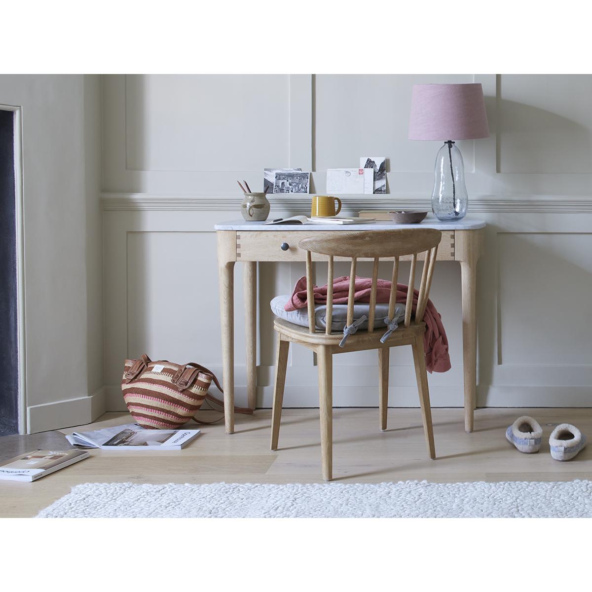 I love this desk for its timeless blend of natural materials and subtle detail, making it versatile enough for a variety of interiors. It works particularly well in light, airy spaces that benefit from a touch of sophistication, such as seaside retreats or Scandi-inspired schemes. Practical styling tips include pairing it with understated accessories like a sleek desk lamp or organised storage boxes, and emphasising its natural beauty by keeping the surface clear or adding a simple vase of fresh flowers. Its soft, neutral tone also lends itself well to layering textures with textiles or artwork, ensuring it remains a functional yet stylish focal point in any room.