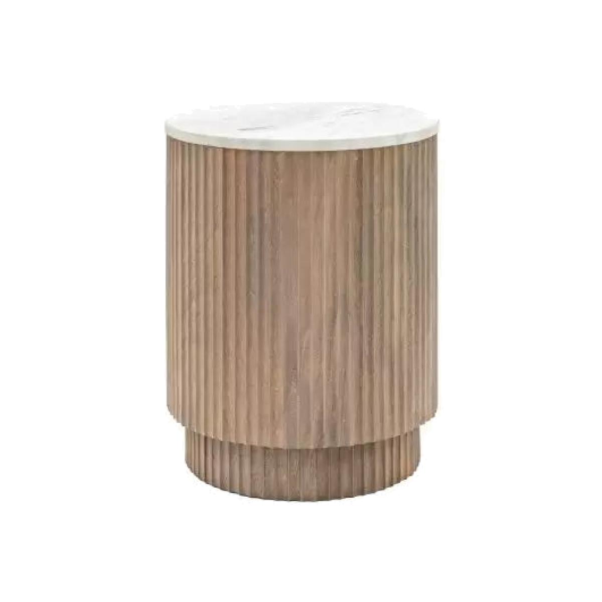 Offering a modern classic look, this stunning side table exudes timeless quality and beauty. It is crafted from solid mango wood, with a striking vertical ribbed feature on the drum base, and a polished Indian white Carrera marble top with classic grey/blue veins running through it. Matching pieces available.
