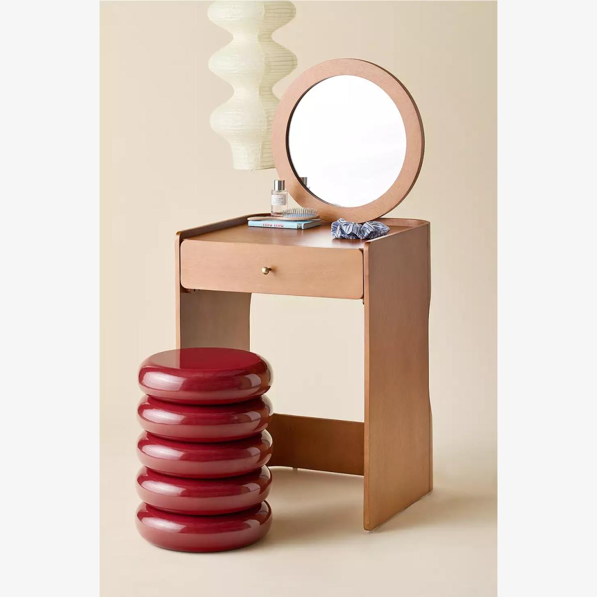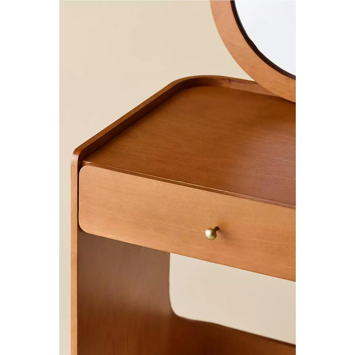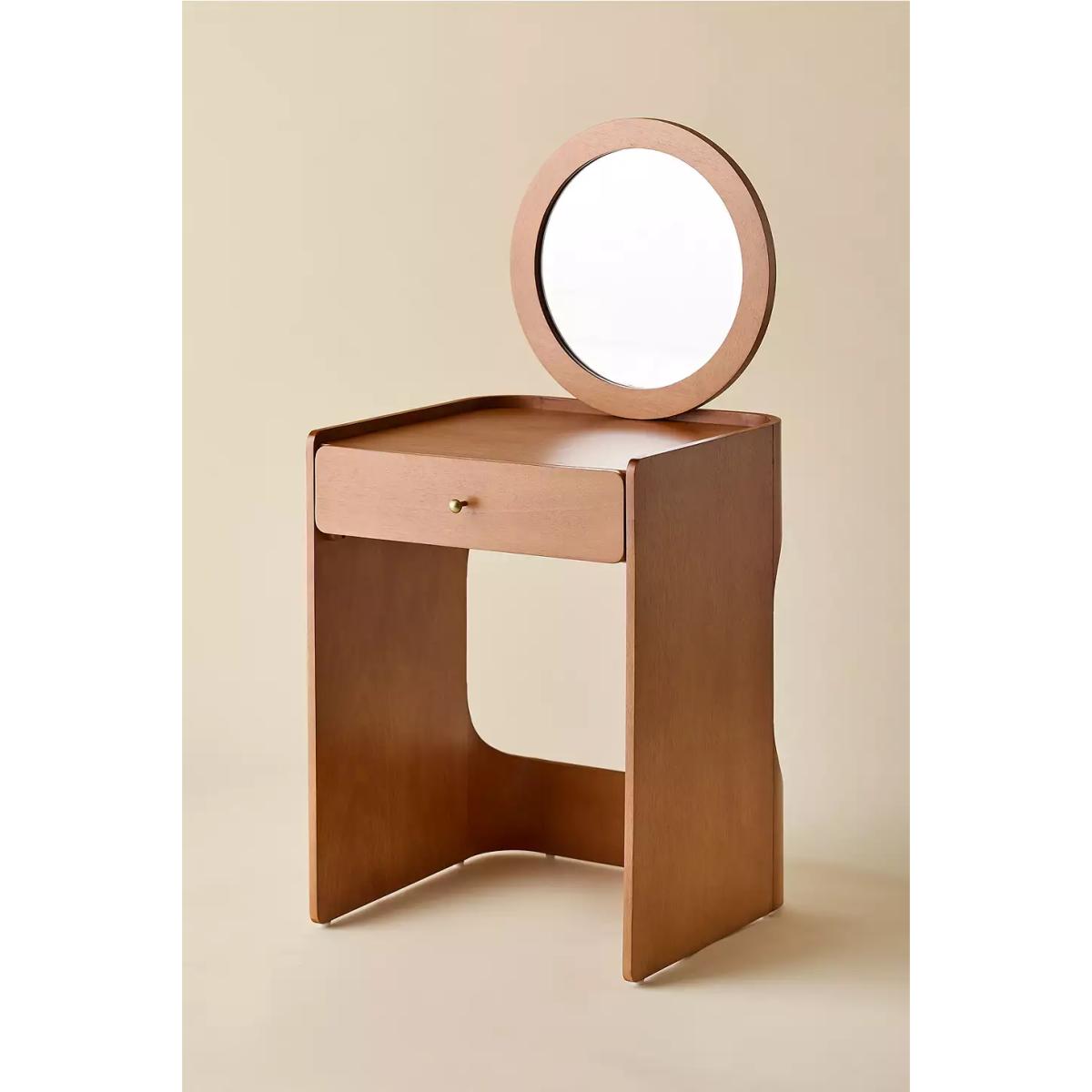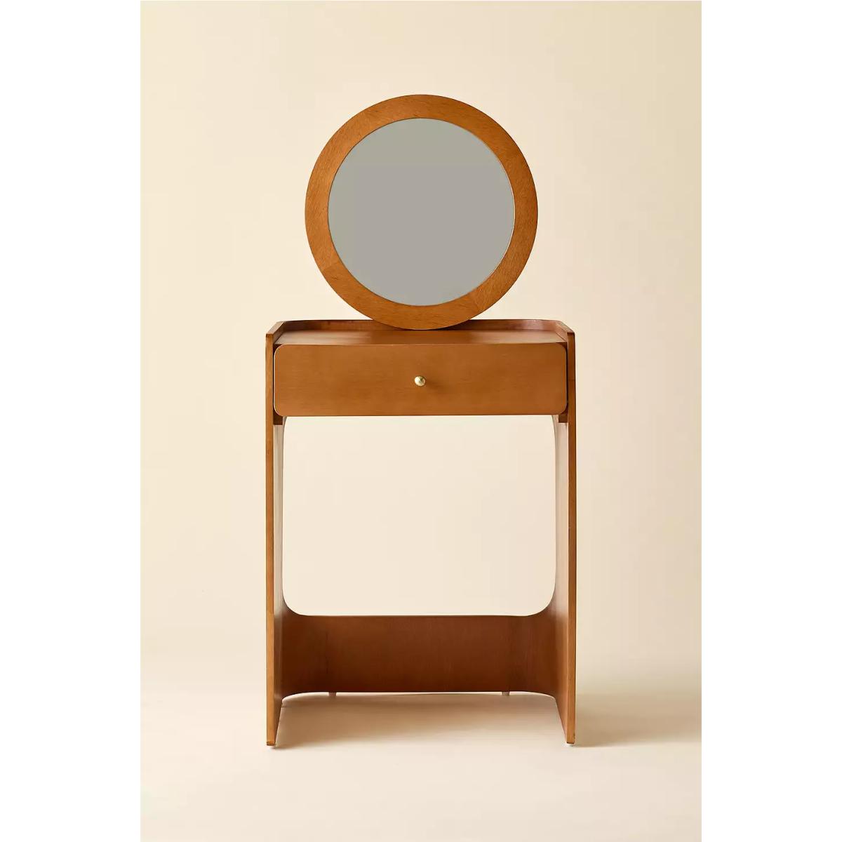 Minimalist wooden dresser, ideal for compact spaces. Features a circular mirror, single drawer, tabletop surface and open silhouette perfect for storing a stool underneath. Stool not included. *Online return only. This item cannot be returned instore. Please note furniture items currently cannot be shipped to Northern Ireland or The Republic of Ireland. Delivery of large furniture items may take 1-2 weeks and are therefore not eligible for Next Day Delivery.* **Content + Care** \- Mango wood, MDF, Glass Mirror, Brass trim \- Wipe clean with a soft and dry cloth **Size** \- 60 x 56 x 128cm