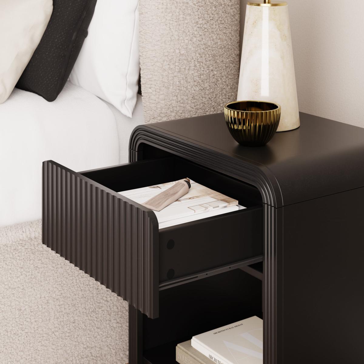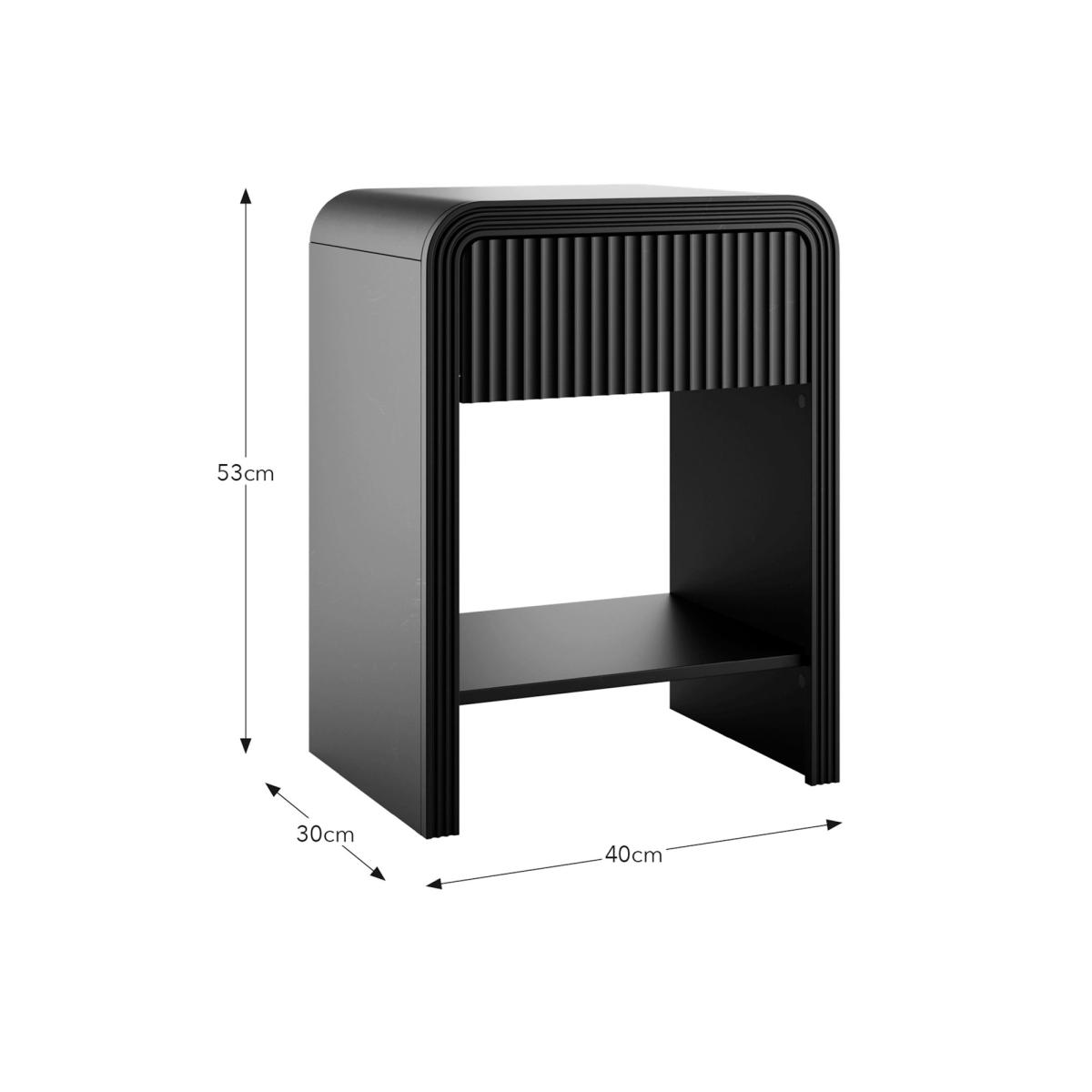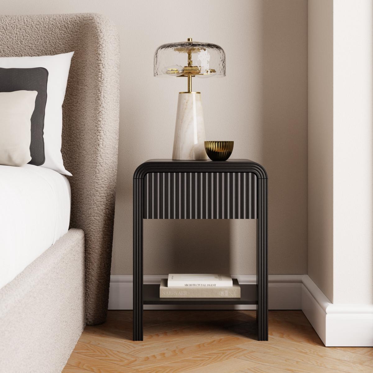 I love this little black bedside table for its sleek, minimalist design that works well in modern and contemporary interiors. Its clean lines and dark finish create a stylish focal point that can add depth to a neutral colour scheme, while also blending seamlessly with other monochrome or metallic accents. Practical styling tips include keeping the surface clutter-free with a simple lamp and a decorative object, like a small vase or clock. The shelf below is perfect for books or magazines, making it both functional and attractive. It’s versatile enough to sit beside a bed, but also works well in lounge areas or as a side table in a hallway, adding a touch of sophistication wherever it’s placed.