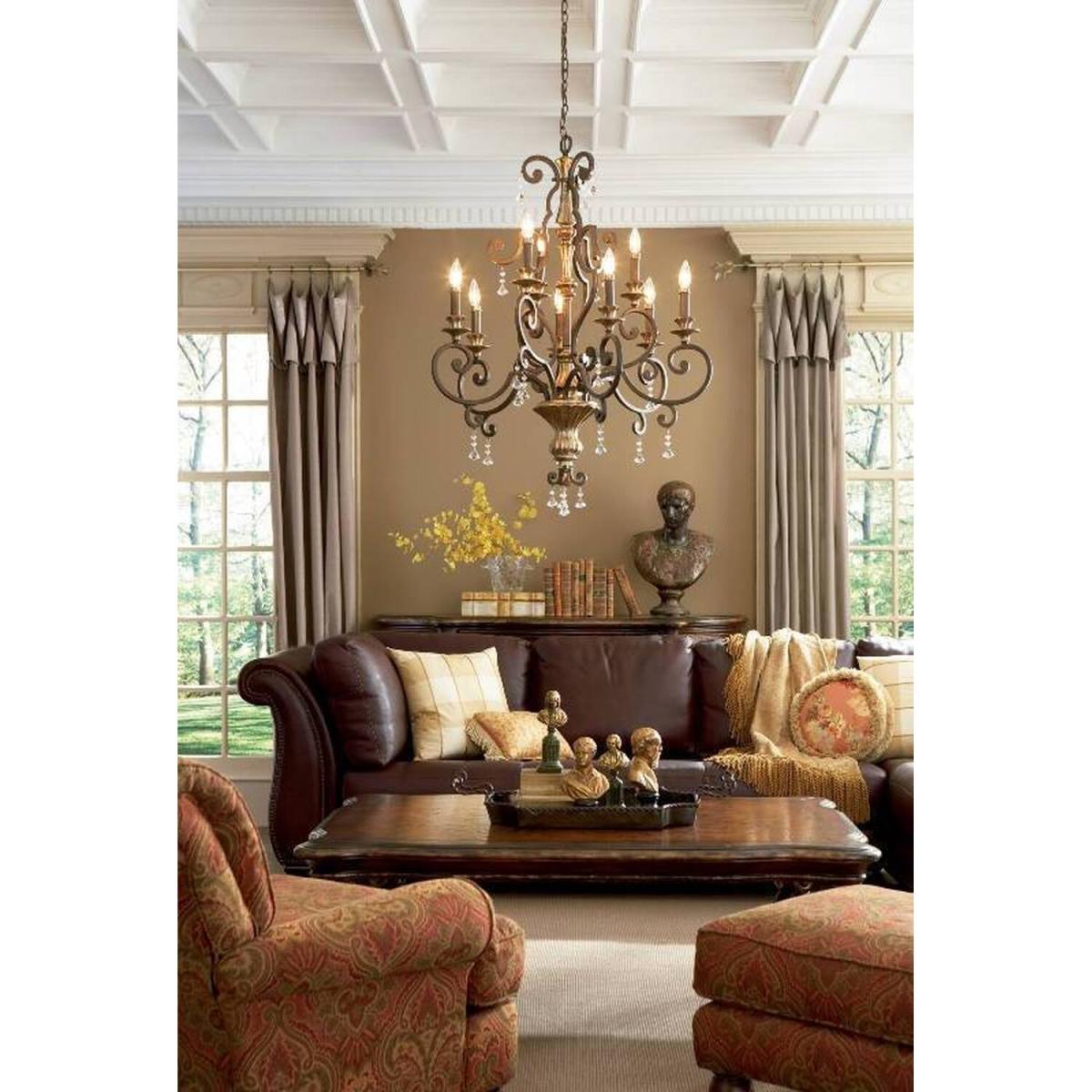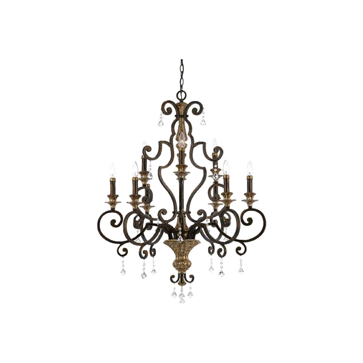 With a subtle touch of multi-faceted crystal drops, this refined designed 9 light chandelier is worthy of a stately home. The beautiful heirloom finish is a rich bronze with antique gold highlights. Also available in this range 1lt Wall Light, 3lt Chandelier, 2lt Semi-Flush, 6lt Chandelier, and 6lt Pendant.