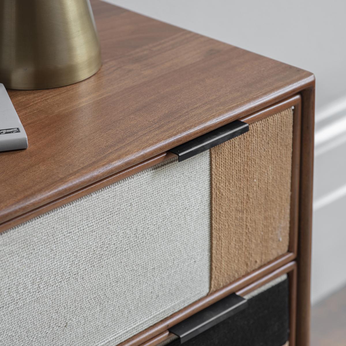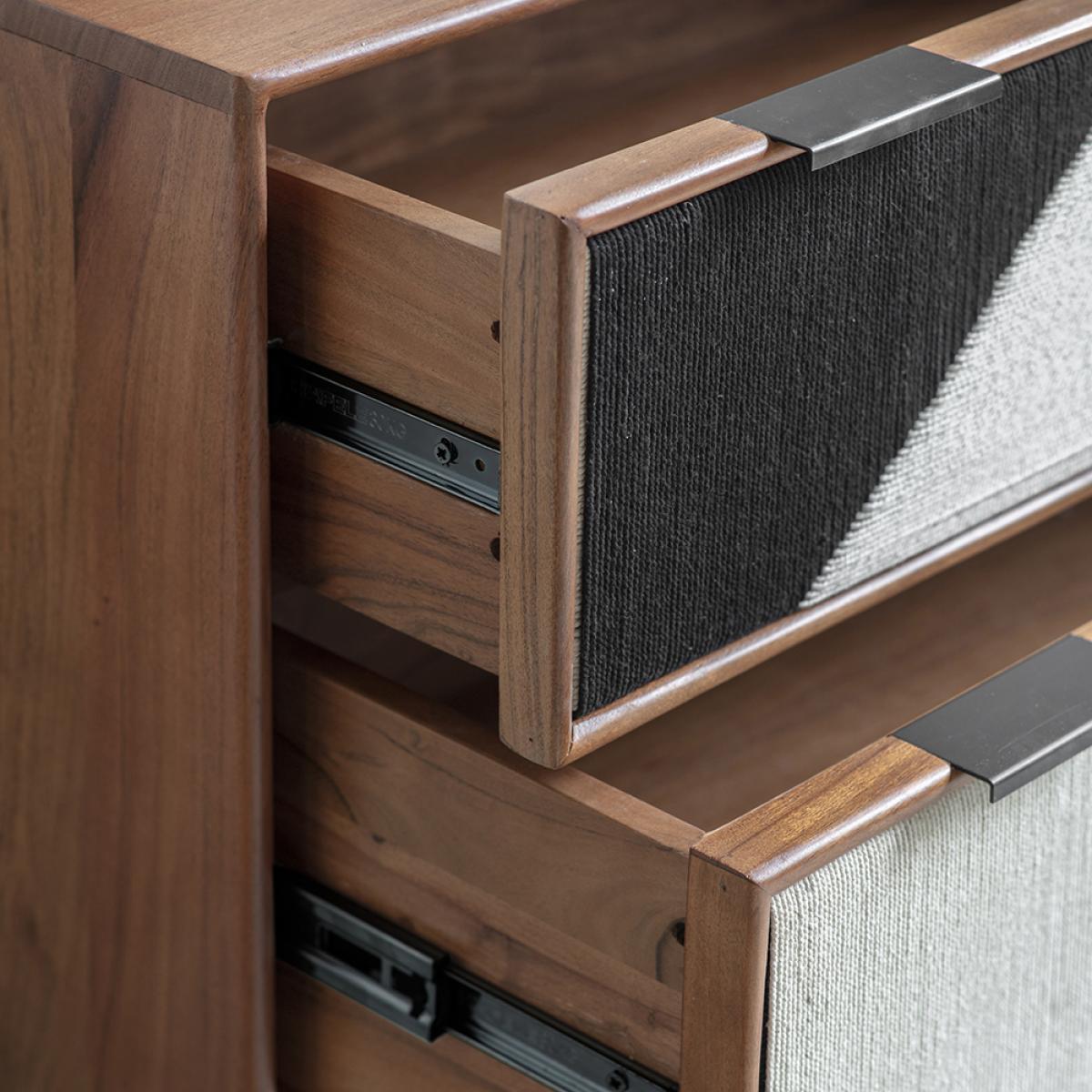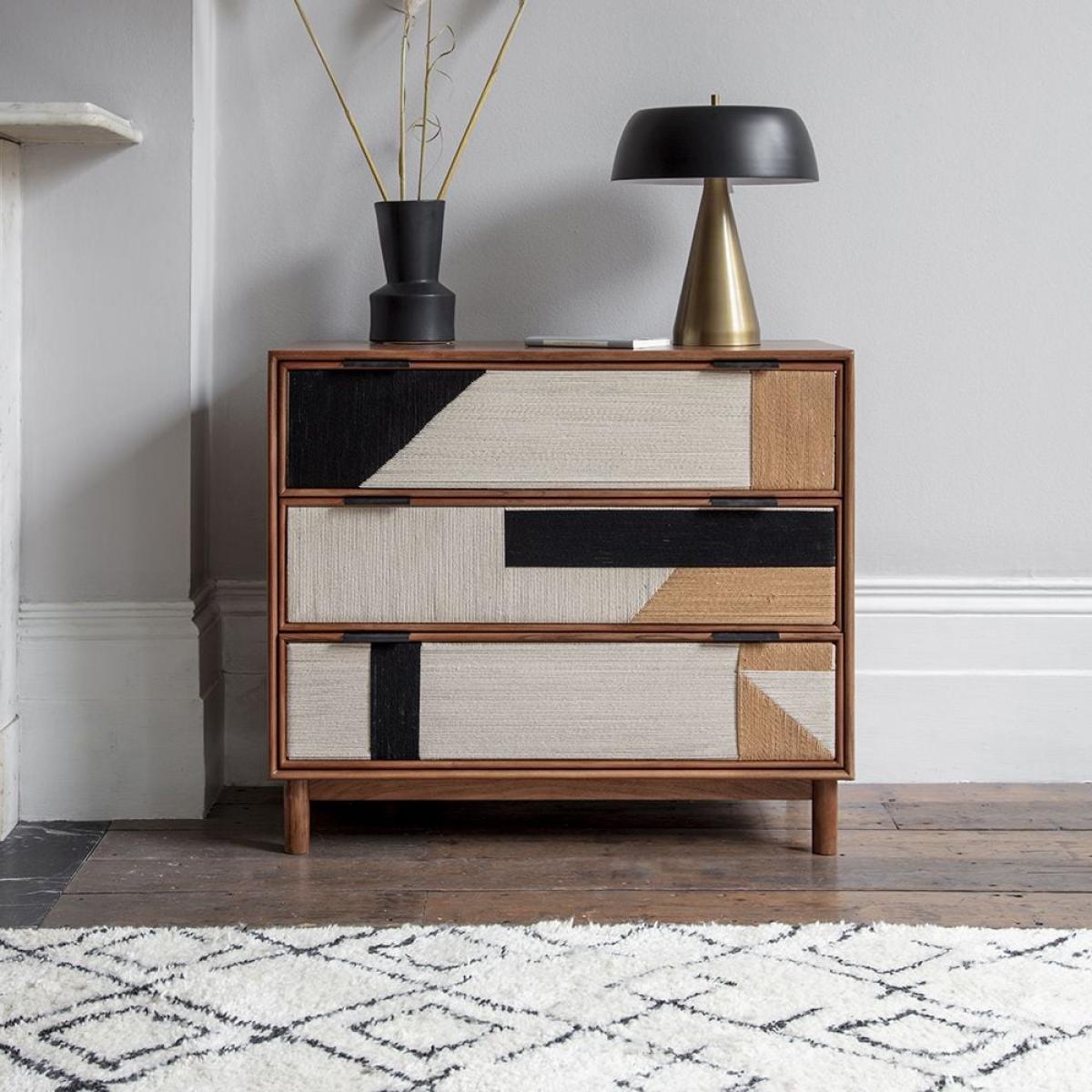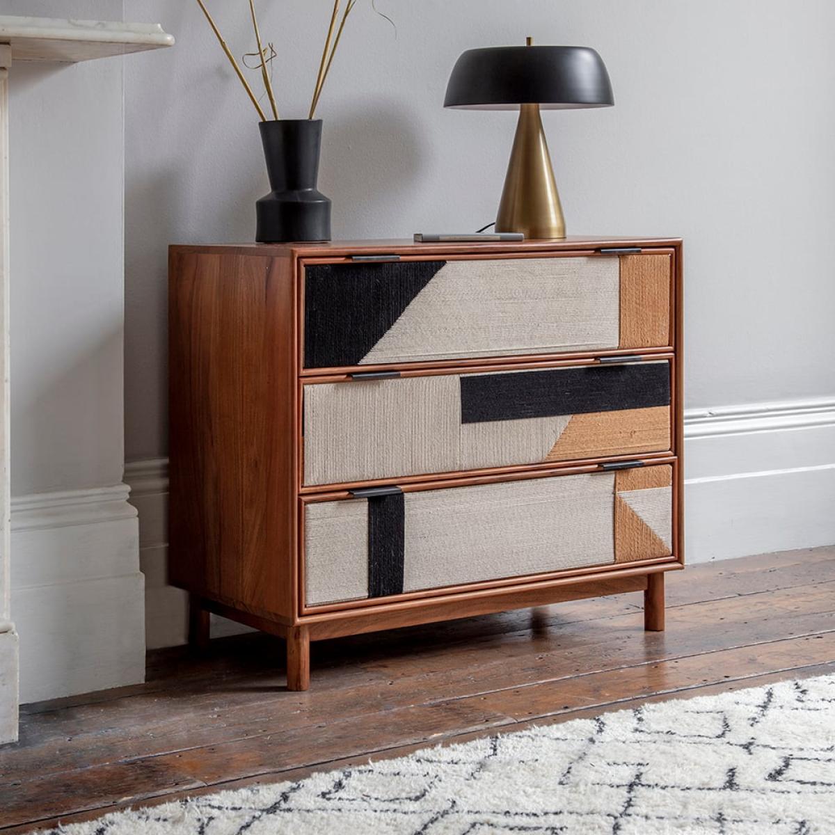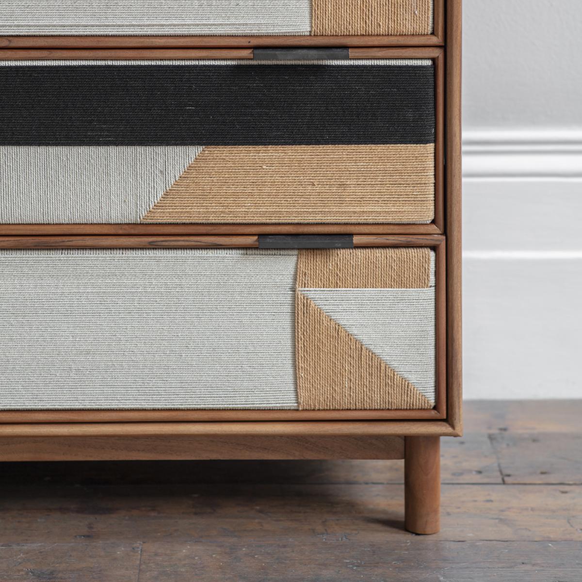 For instant impact in the bedroom or guest room, our Marrakesh Chest of Drawers is made from acacia wood with colourful woven cotton yarns on its three-drawer design. Inspired by the geometric patterns of Morocco, this woven chest of drawers is created by highly skilled artisans with each piece being totally unique. The playful, colourful pattern is applied to each of the three generously sized drawers while the black metal handles are discreetly incorporated within the coloured chest of drawers to allow the tactile finish to really shine.