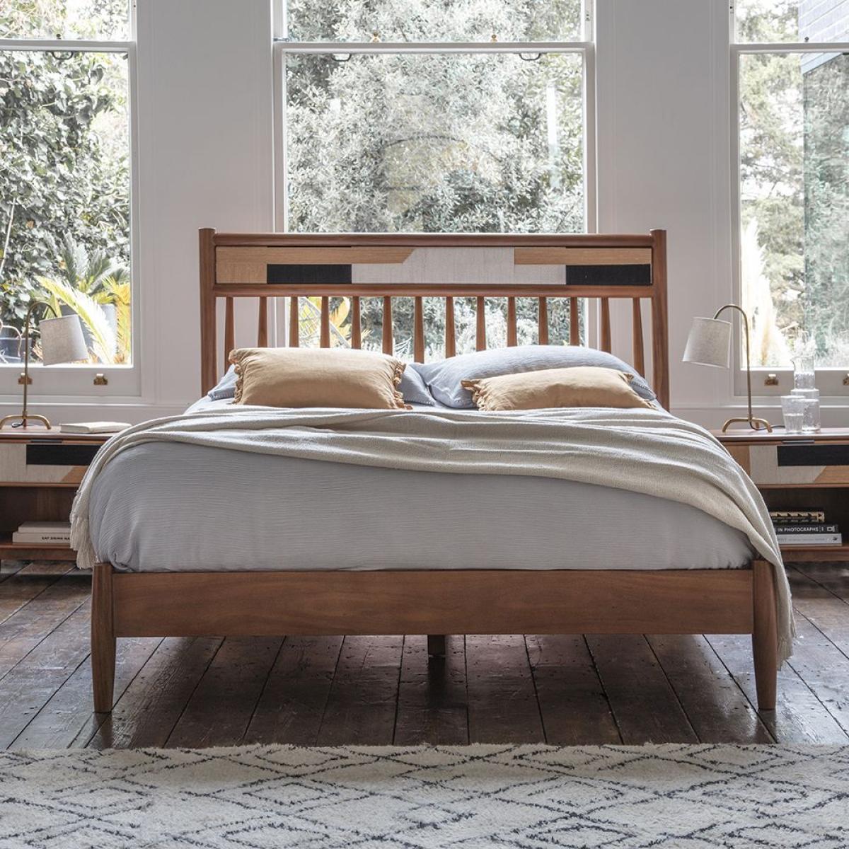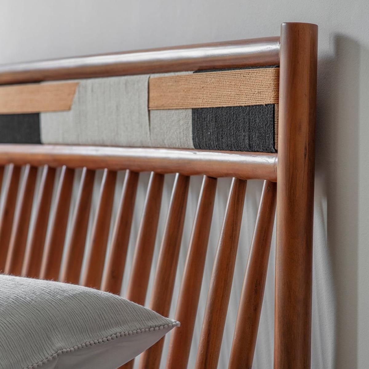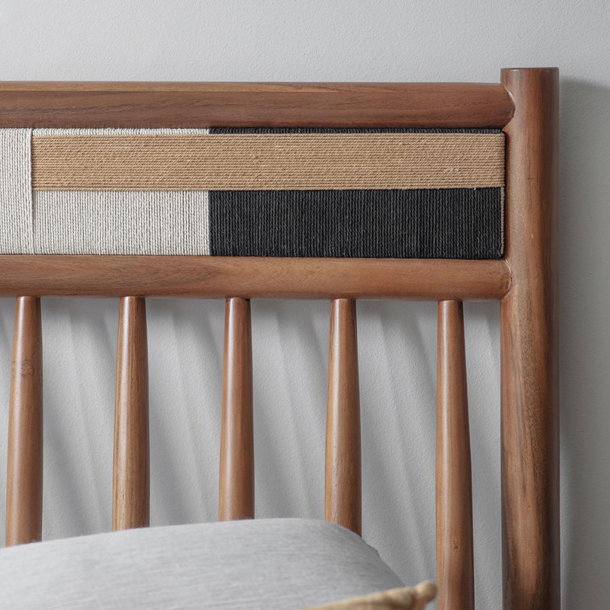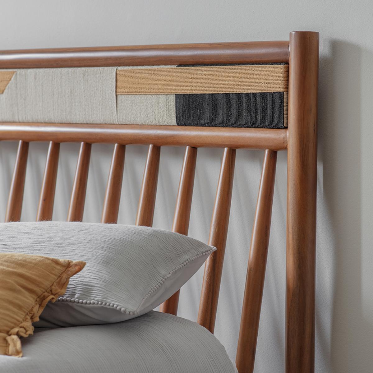 Give your bedroom the wow factor with our statement Marrakesh Kingsize Bed. With sophisticated colours and unique detailing, this will give your bedroom that luxury hotel look. This unique bed frame is made of natural acacia wood, with a woven spindle headboard inspired by Moroccan geometric patterns and prints. The Marrakesh kingsize bed is carefully crafted by highly skilled artisans with each bed being totally unique. The playful pattern on the headboard is achieved by applying woven coloured cotton yarns for a distinctive and tactile design that gives this woven bed frame its personal and individual look. Team with our matching Marrakesh bedside table and chest of drawers for a cohesive finish. Bedframe only, mattress not included.