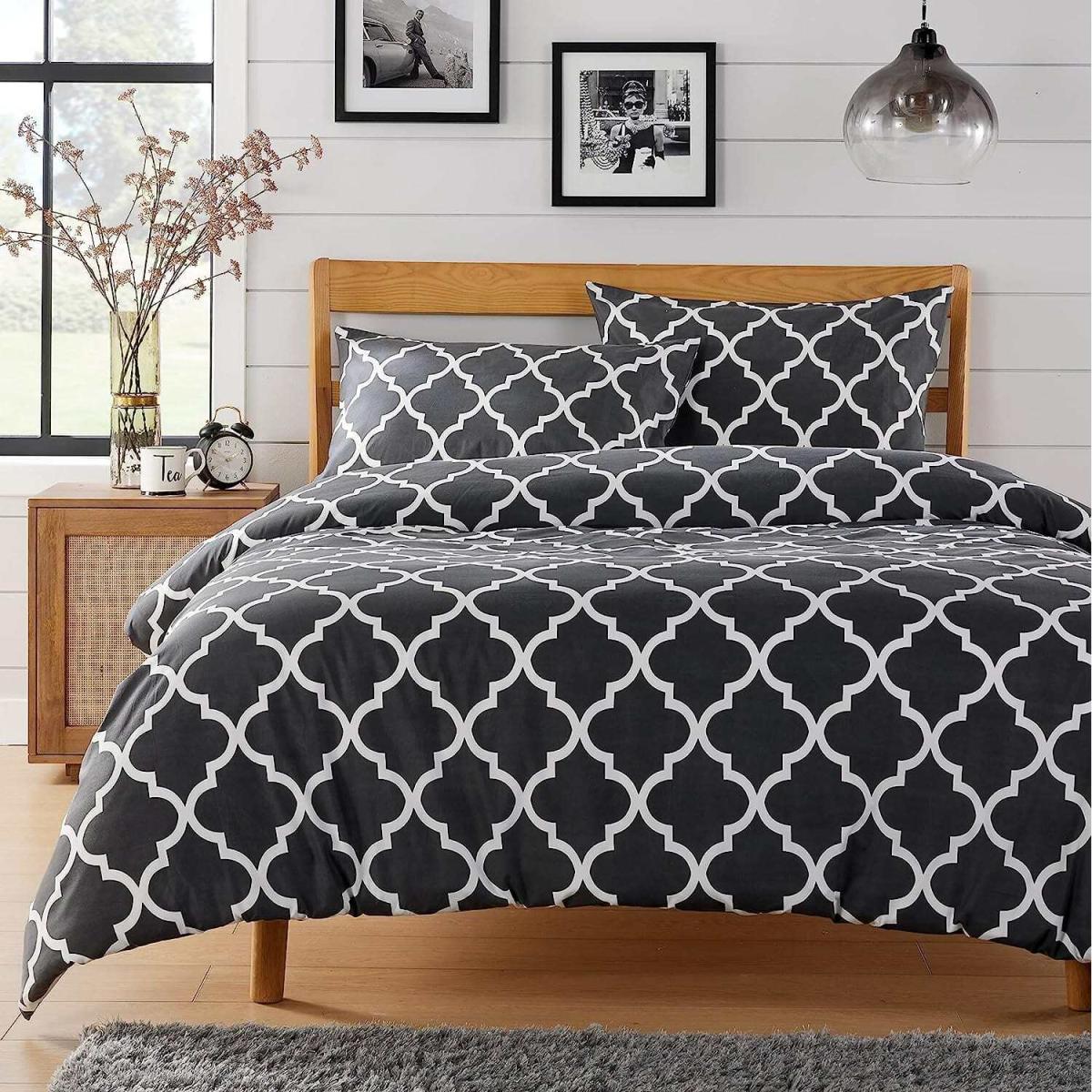 I love this bedding set for its versatile grey tone and bold, geometric pattern, which makes it a great anchor piece in a variety of interiors. It works particularly well in modern, Scandinavian, or industrial spaces where clean lines and minimalism are key, but it can also add visual interest to more eclectic or boho bedrooms. Practical styling tips include pairing it with crisp white or neutral pillows to let the pattern pop, or adding textured throws and cushions for a layered look. Its neutral colour makes it easy to coordinate with a range of colour schemes, while the pattern adds just enough visual intrigue without overwhelming the space.