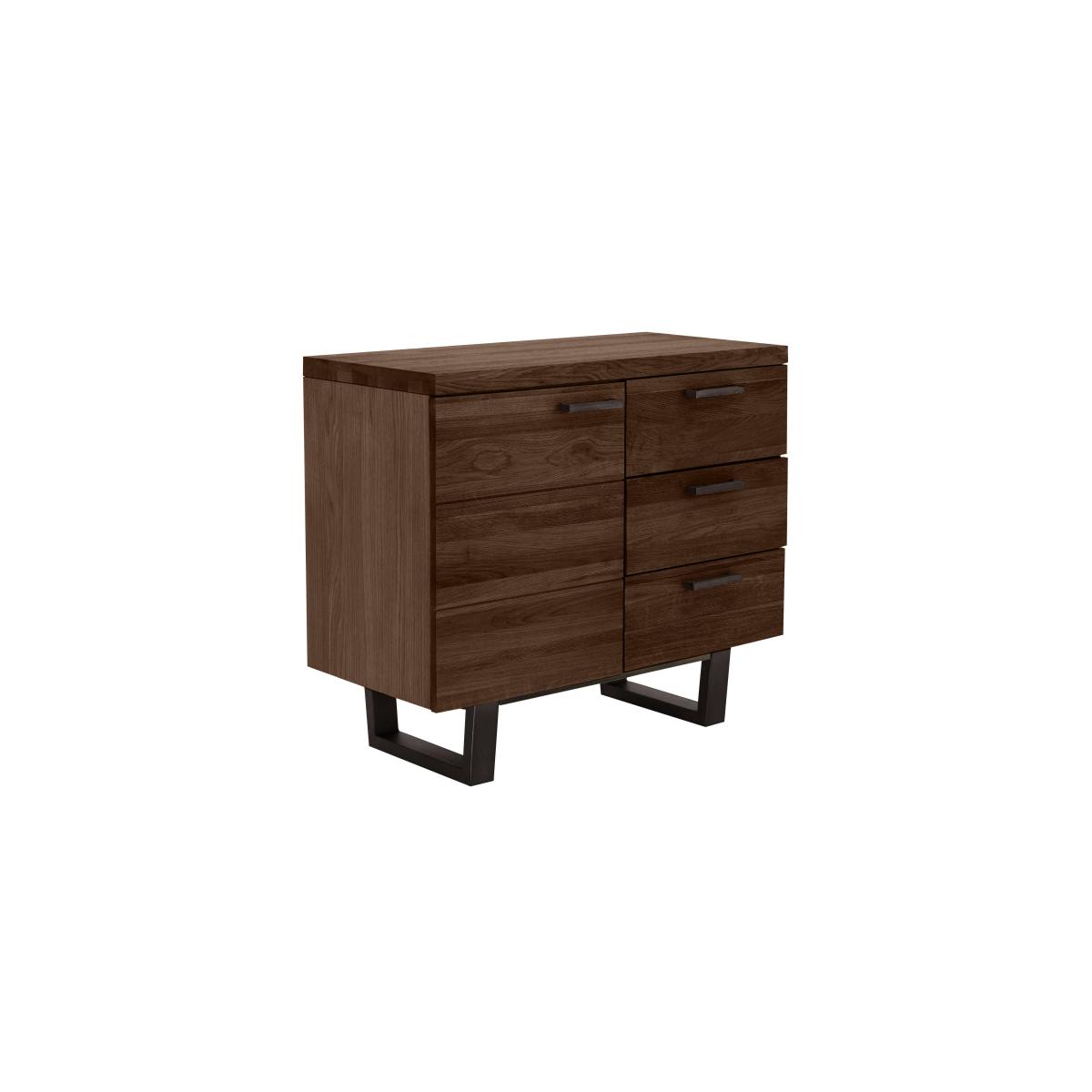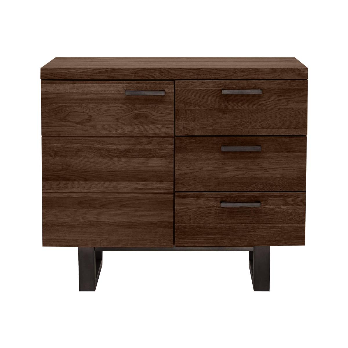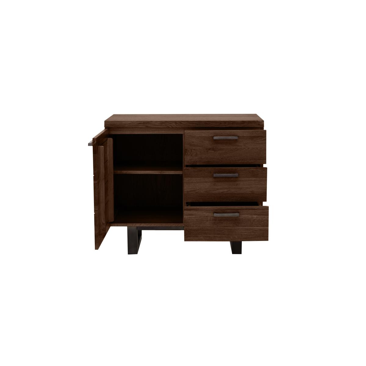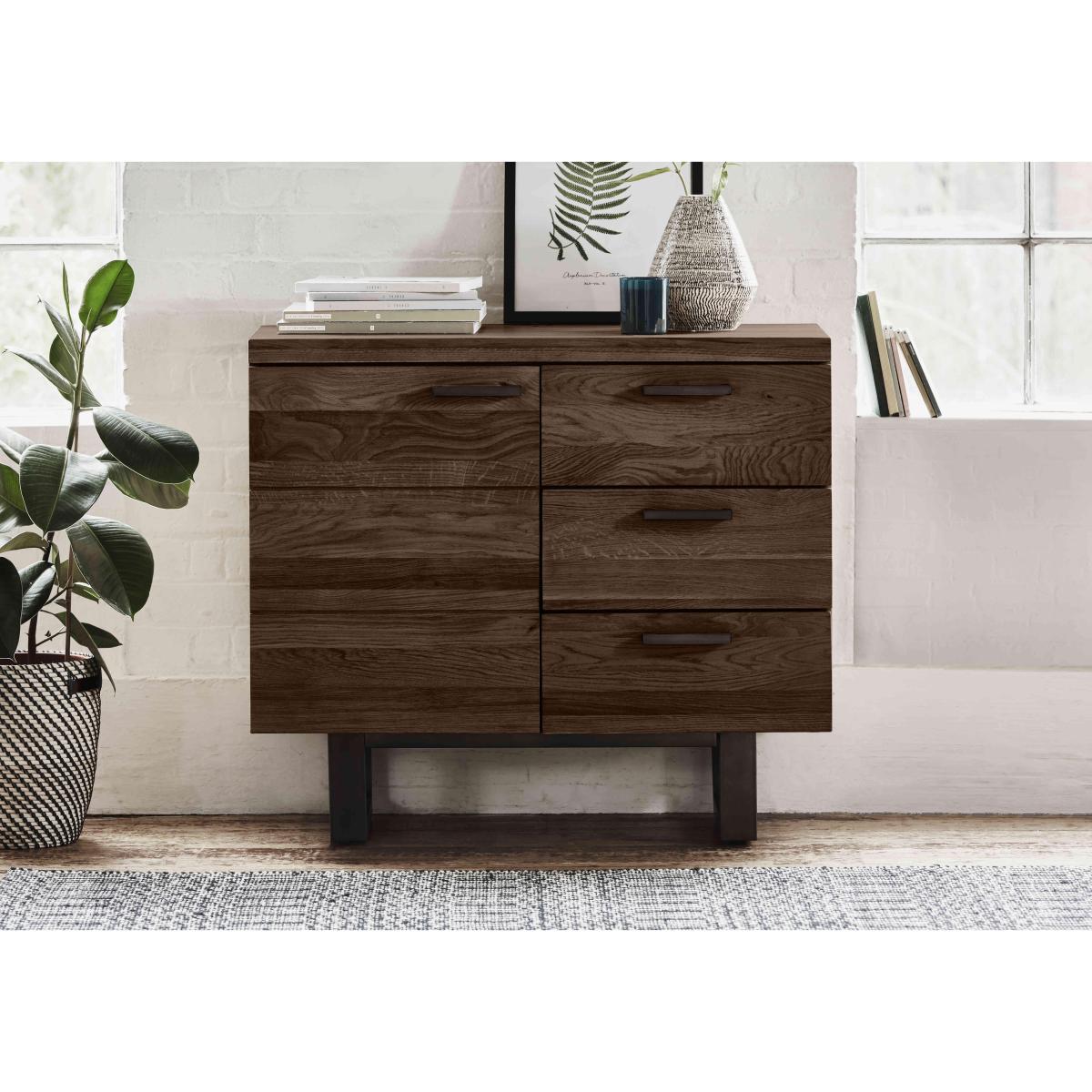 If you’re a fan of our popular Earth collection, you’ll love our Mars range. Like Earth, Mars delivers cool industrial design with plenty of beautiful solid oak and veneer surfaces and sturdy metal bases. It also offers a really extensive selection of dining room and living room furniture at fantastic-value pricing that makes it so easy to bring home on-trend urban style for less. The Mars difference? A distinctive dark oak finish that strikes the perfect balance between modern rustic design and sophisticated interior style. It’s a contemporary aesthetic that looks fabulous in all kinds of spaces. Only at Furniture Village. This versatile small sideboard has cupboard and drawer storage so works well in a living room or hallway as well as in a dining room. We love that wire-brushed dark oak finish. Why you'll love it. Compact 1-door 3 drawer sideboard is the definition of storage with style. Contemporary industrial style at a truly exceptional price. Made from real oak and oak veneer, every sideboard is a one of a kind. Characterful dark wire-brushed and oiled finish. Front has a striking planked finish and metal door and drawer handles. On U-shaped black metal legs. Only at Furniture Village. This 1-door 3 drawer sideboard is part of the Mars range. What you need to know. Cupboard has 1 adjustable shelf. Cupboard door is soft-closing. As oak is a natural material, knots and markings are to be expected. Avoid placing in direct sunlight, and take care to use coasters and placemats. To preserve the finish, apply an invisible buffing wax every six months. WARNING!. Furniture can tip over unexpectedly and cause injury. This item must be fixed to a wall using the anti-tip kit provided. Be sure to use the correct wall fixings suitable for the walls in your home. Furniture Village is not able to fix anti-tip devices for you. Seek professional advice if you are unsure.