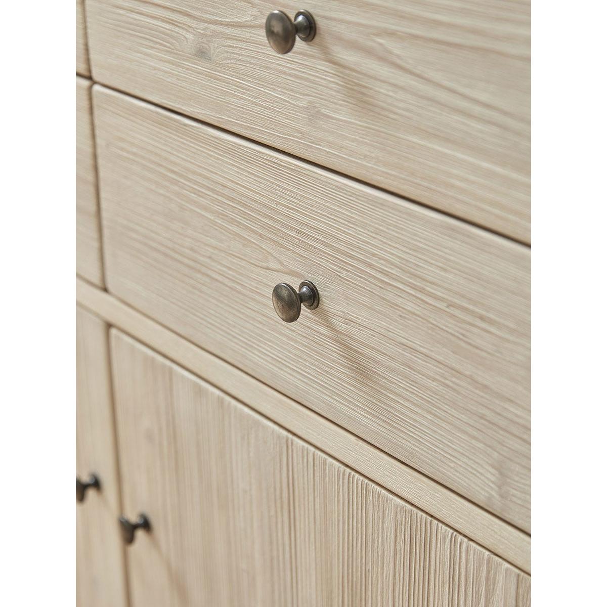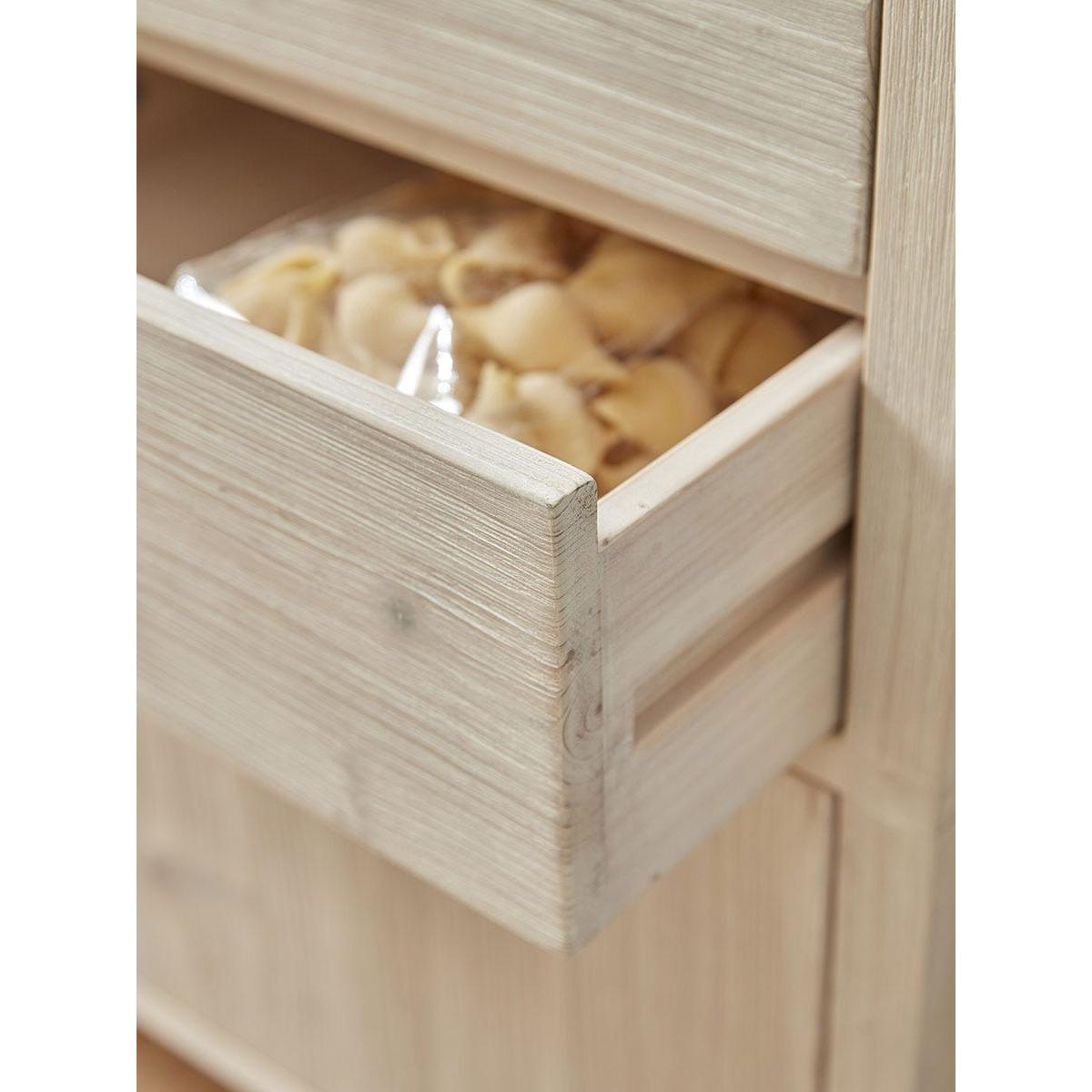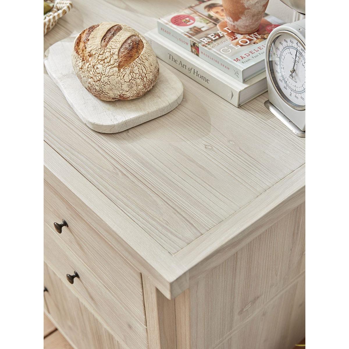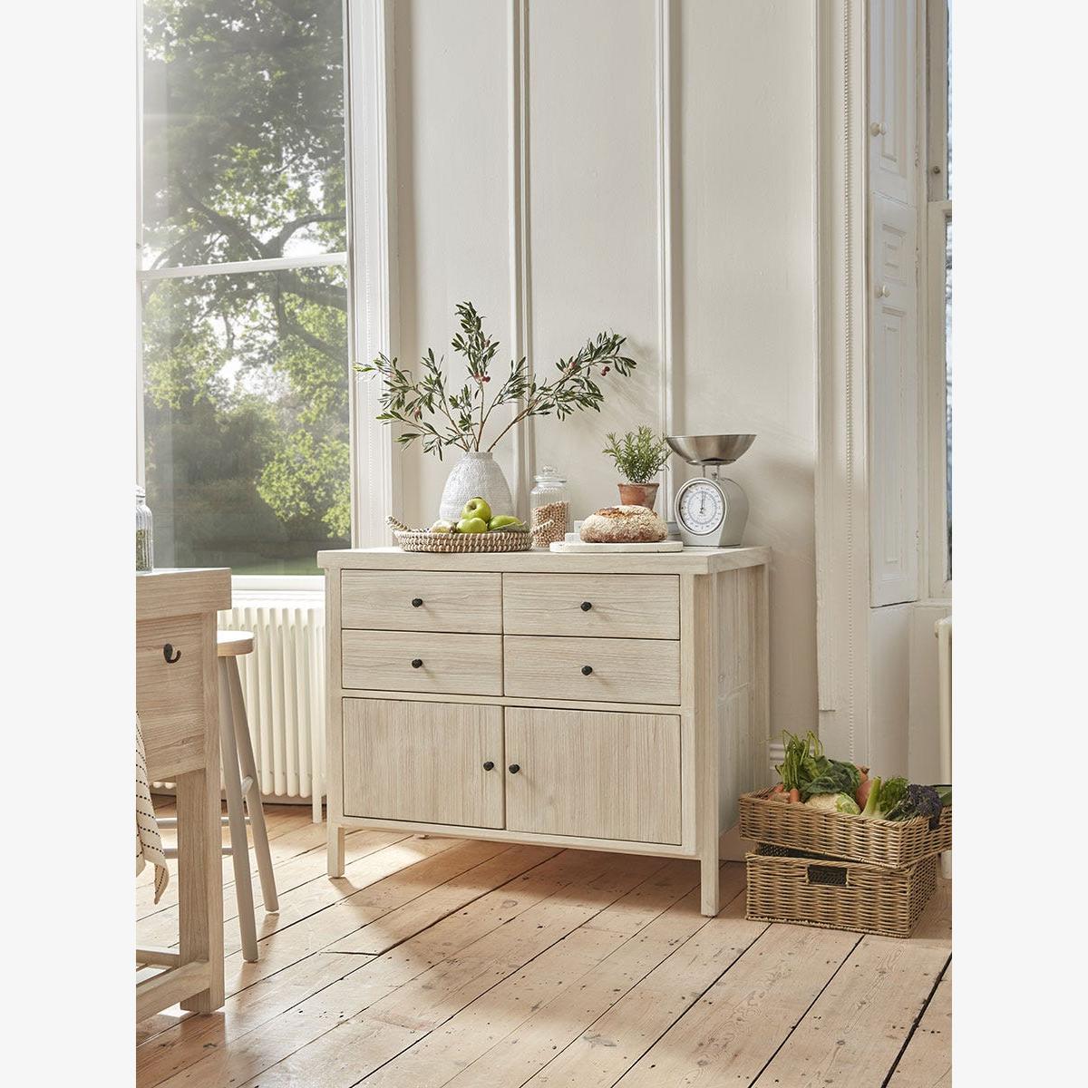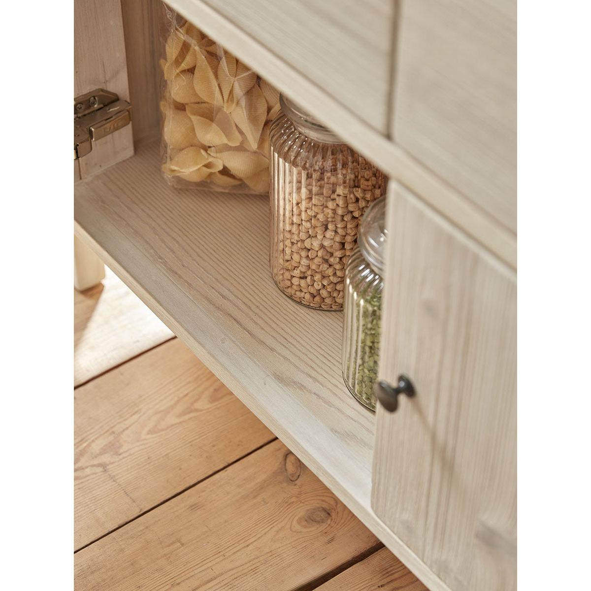 Pull together a characterful freestanding kitchen with our Marsala Kitchen Cabinet. Made from recycled pine with a pale finish, this neat cabinet features four drawers with cupboard space underneath. The cabinet sits on square legs and has a pared back simplicity that allows the beauty of the woodgrain to be fully appreciated.