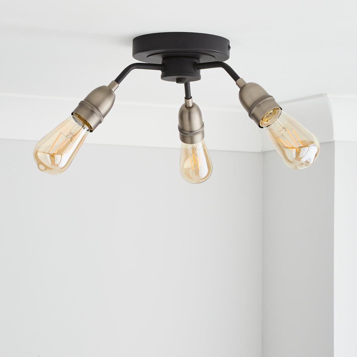 Stylishly fashioned with 3 lights, this light fitting features a sleek black finish, with antique bulb caps and amber bulbs, perfect for adding a contemporary touch to your home. The semi flush fitting makes it suitable for lower ceilings and this light comes with bulbs, and is also dimmable with a dimmer switch so you can set the perfect ambience no matter the occasion.