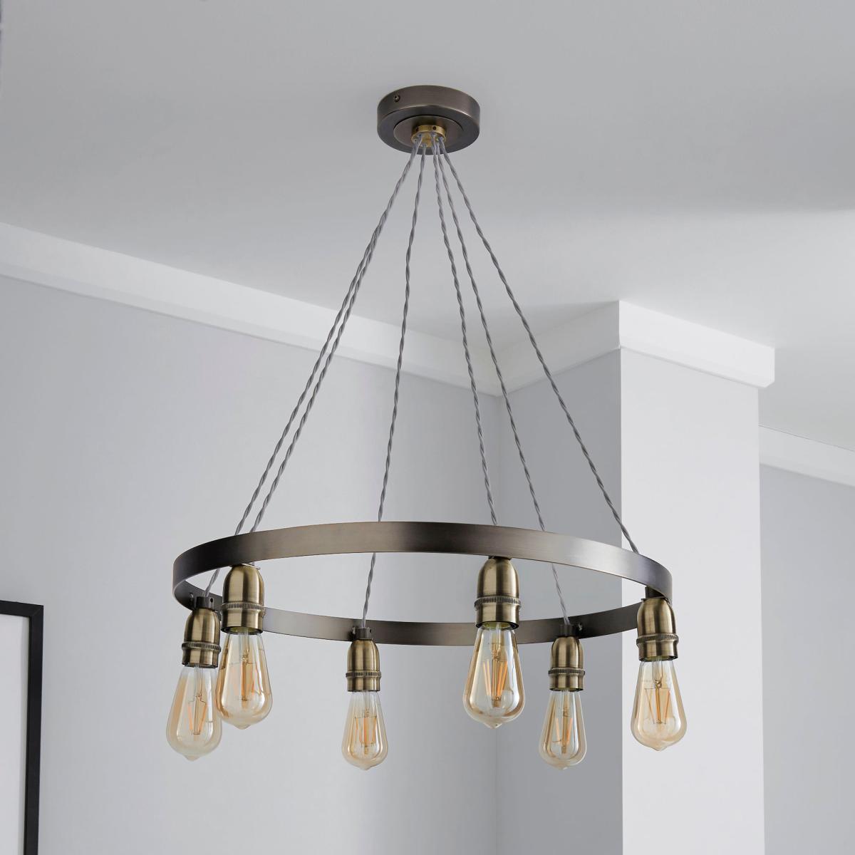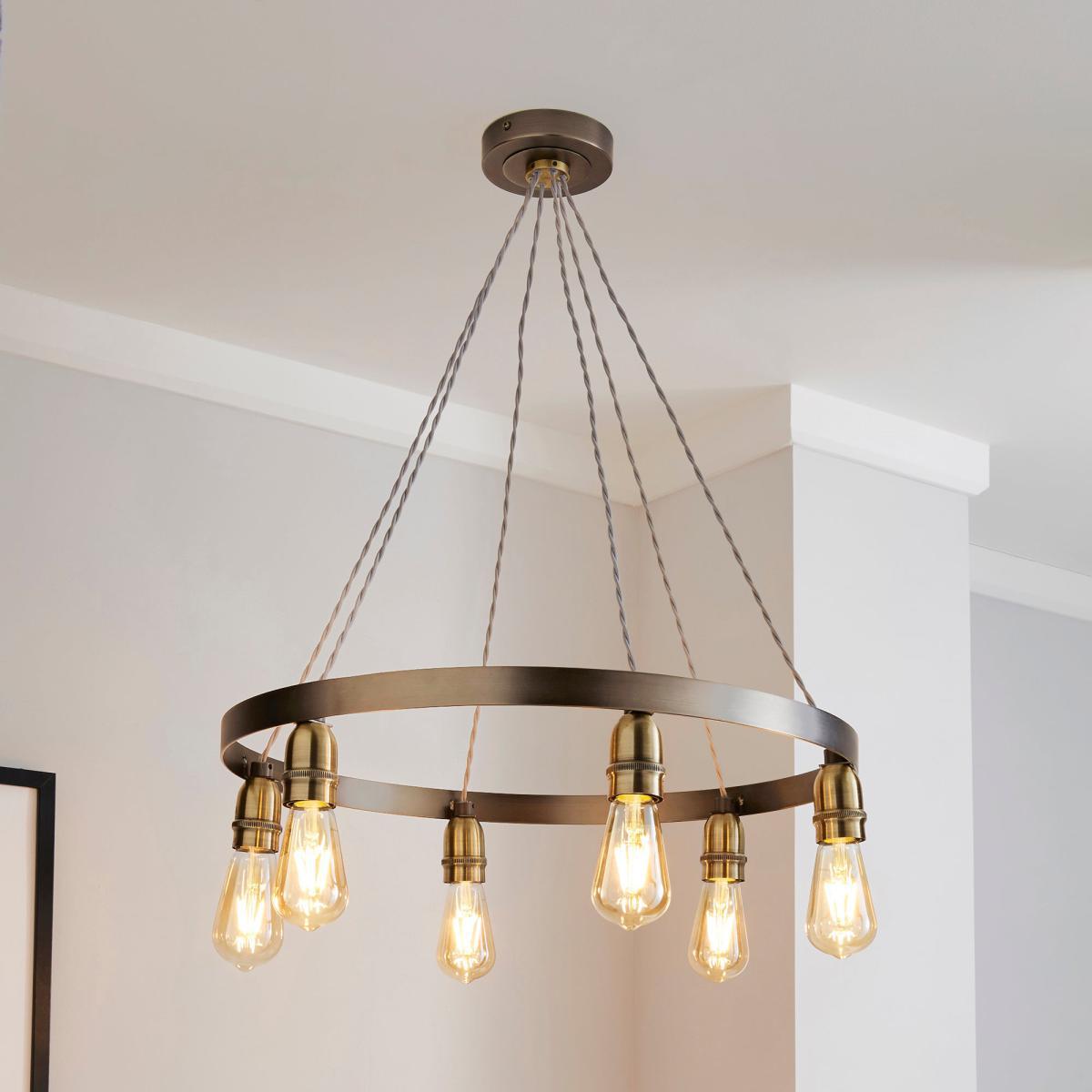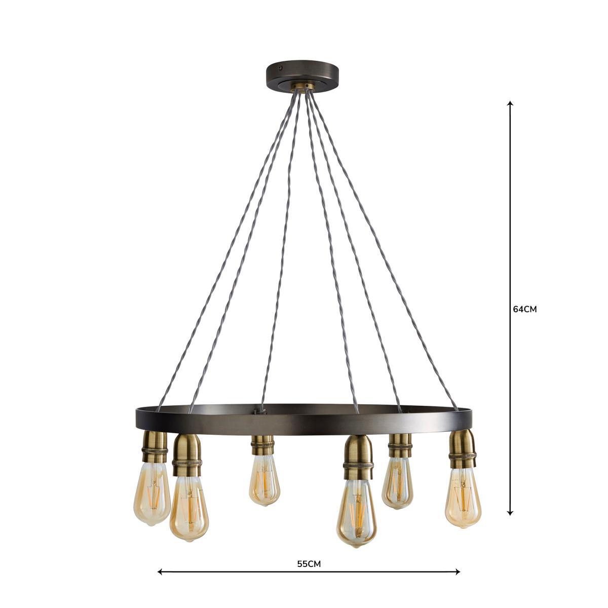Stylishly fashioned with 6 lights, this stunning light fitting features a steel hoop design with bronze, antique bulb caps and amber bulbs, perfect for adding a contemporary touch to your home. This light comes with a 2 year guarantee. Click [here](https://www. dunelm. com/info/help/terms-and-conditions#lighting-guarantee ) to view our terms and conditions.