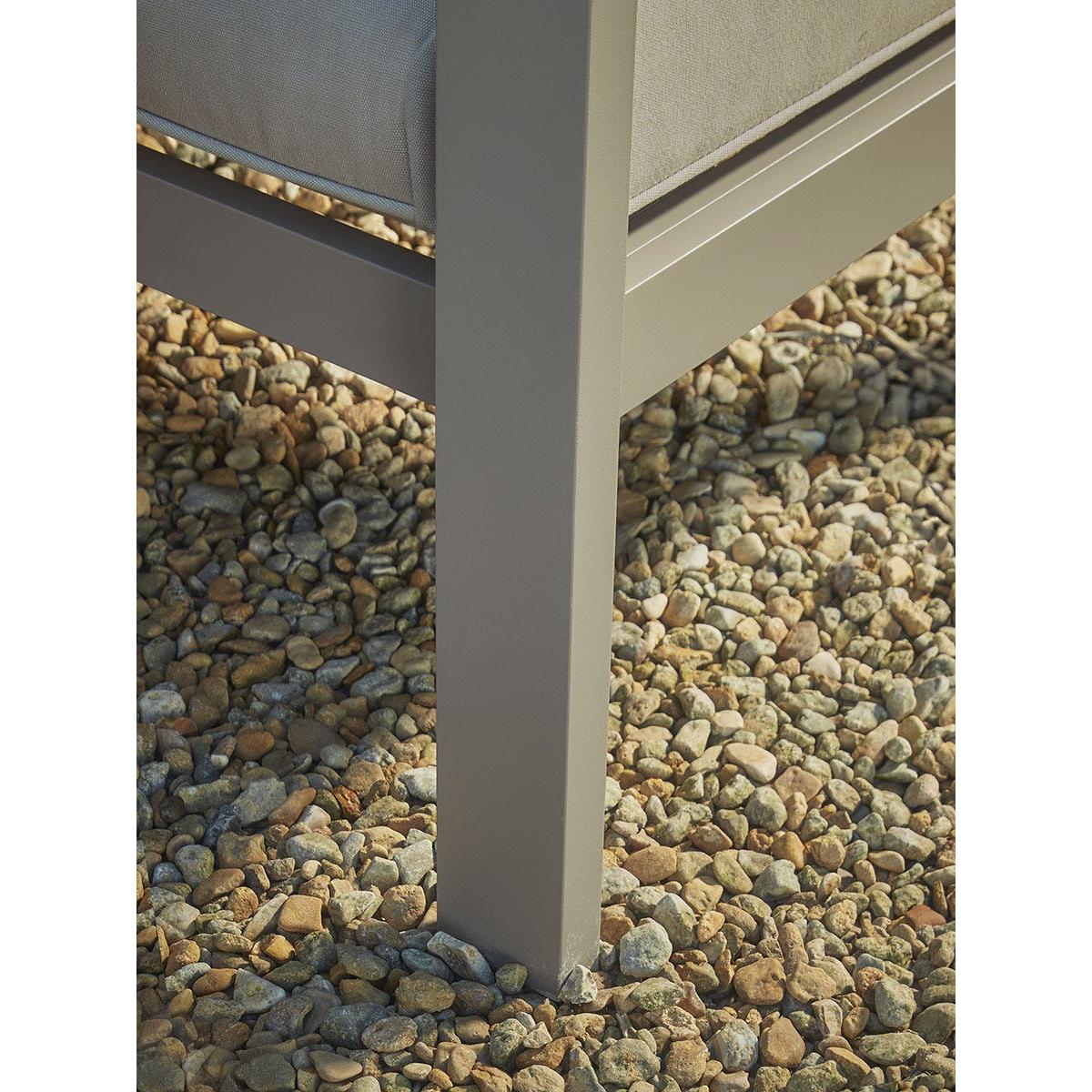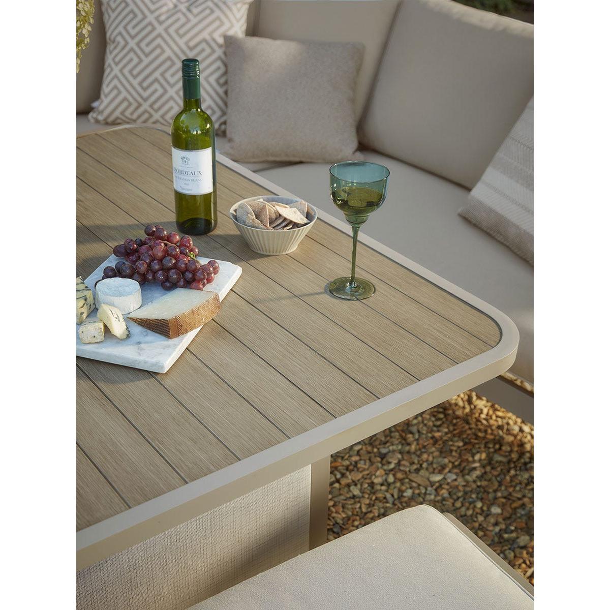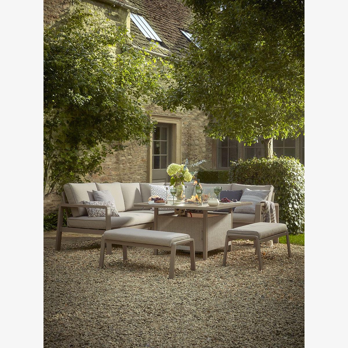 Enjoy entertaining family and friends on our spacious Marseille Corner Dining Set with Firepit. Made up of a corner sofa and two benches, the sleek and sturdy aluminium frame houses plump cushions in neutral tones that create the most comfortable place welcome guests and enjoy refreshing drinks in the sun for a restful place to while away the summer days. With a table made from the same aluminium frame, it houses a firepit that when the sun goes down and the light gets dim can gently lught the same for you and your guests as well as providing warmth as your enjoy the full day in your garden. With neutral tones, not only does this set provide a place of luxury to rest, but its simple design and colours make it perfect for a variety of garden styles.