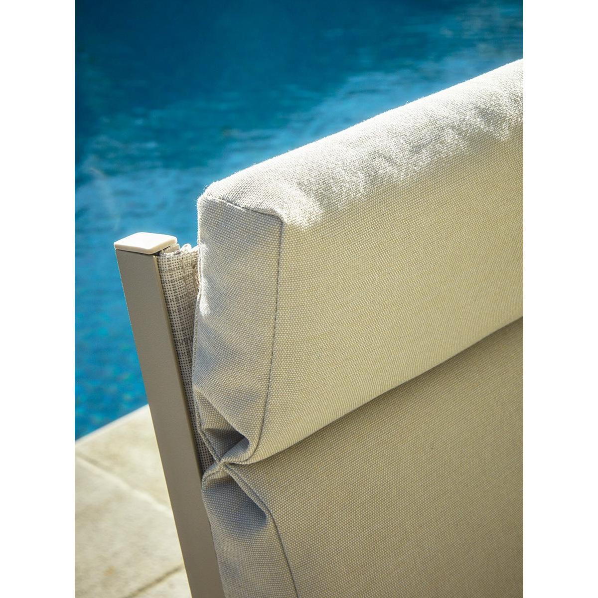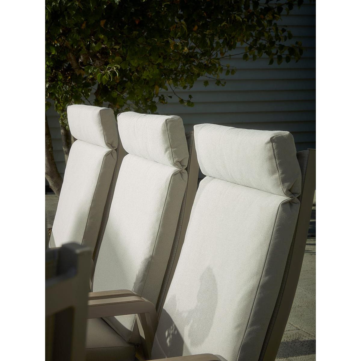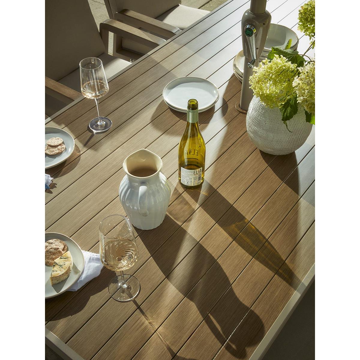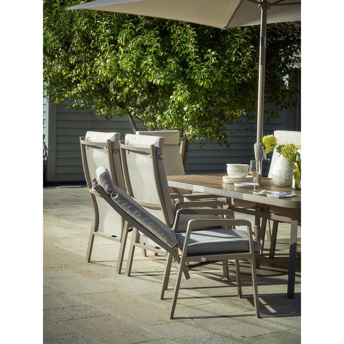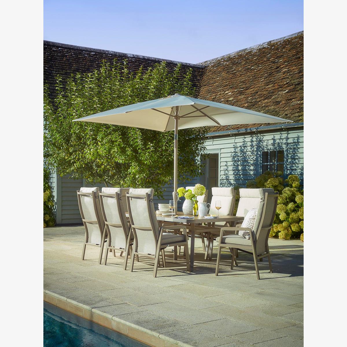 Enjoy entertaining family and friends on our spacious Marseille Delux Dining Set. A sleek and sturdy aluminium frame houses a tall parasol in neutral tones, keeping your guests and refreshing drinks out of the sun for a restful and relaxing place to enjoy the summer sun in the warmer months. The table sits 8 chairs made from the same aluminium frame. Ideal for keeping comfortable as you eat, not only do these chairs have tall backs, they recline so you and your guests can enjoy an afternoon in the sun in the most comfortable of ways. With neutral cushions on the chairs that extend up the back of them with plump head rests, not only does this set provide a place of luxury to rest, but its simple design and colours make it perfect for a variety of garden styles.