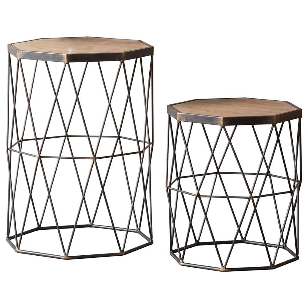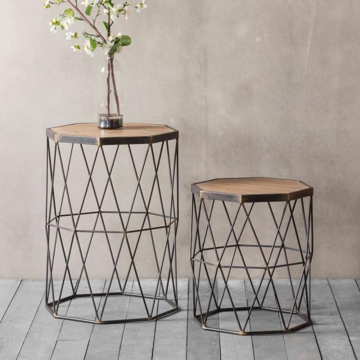 I love this pair because they offer a sleek, modern touch with their geometric wire frames and natural wooden tops, making them highly versatile. They work well in contemporary, industrial, or minimalist interiors, providing both style and functionality. Practical styling tips include stacking books or placing small lamps on top, while their open design keeps spaces feeling airy and uncluttered. These tables are ideal for pairing with a sofa or bed, creating flexible surfaces that can be easily moved or styled differently to suit your needs.
