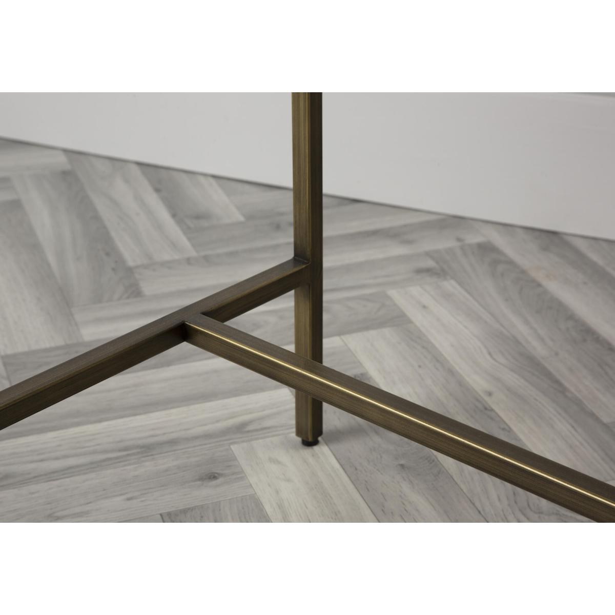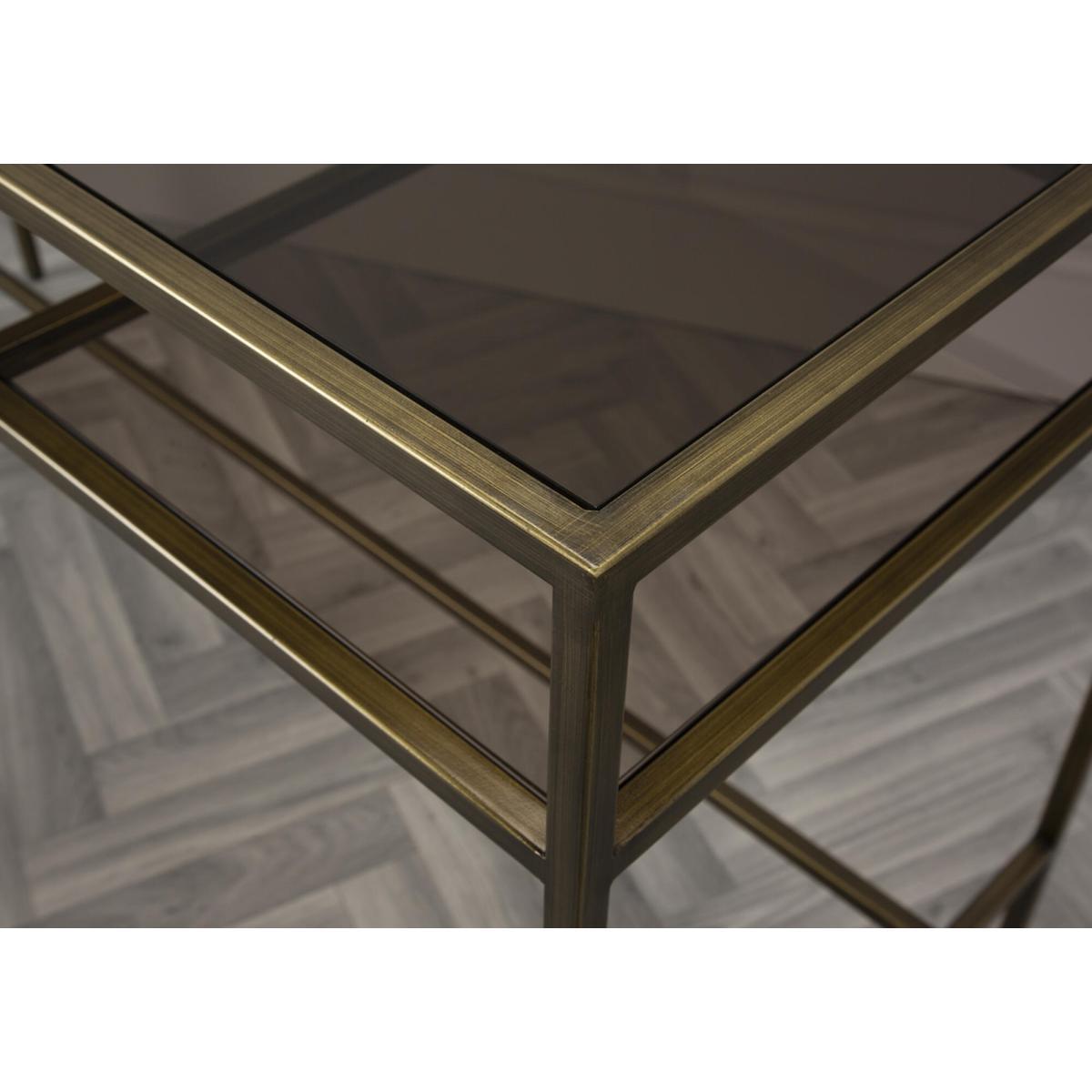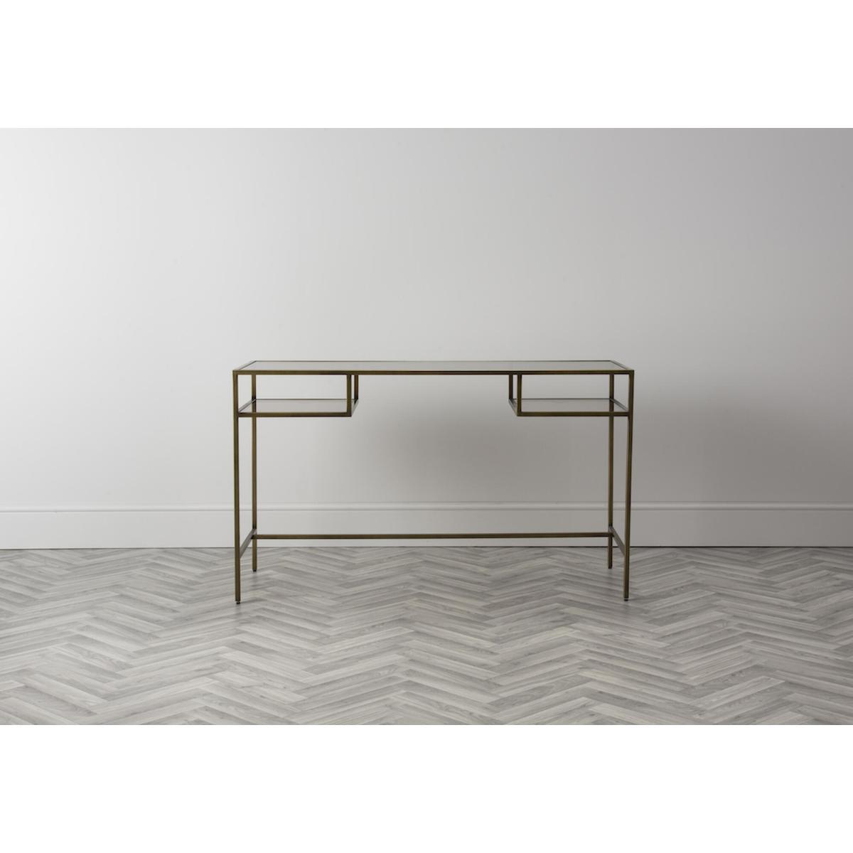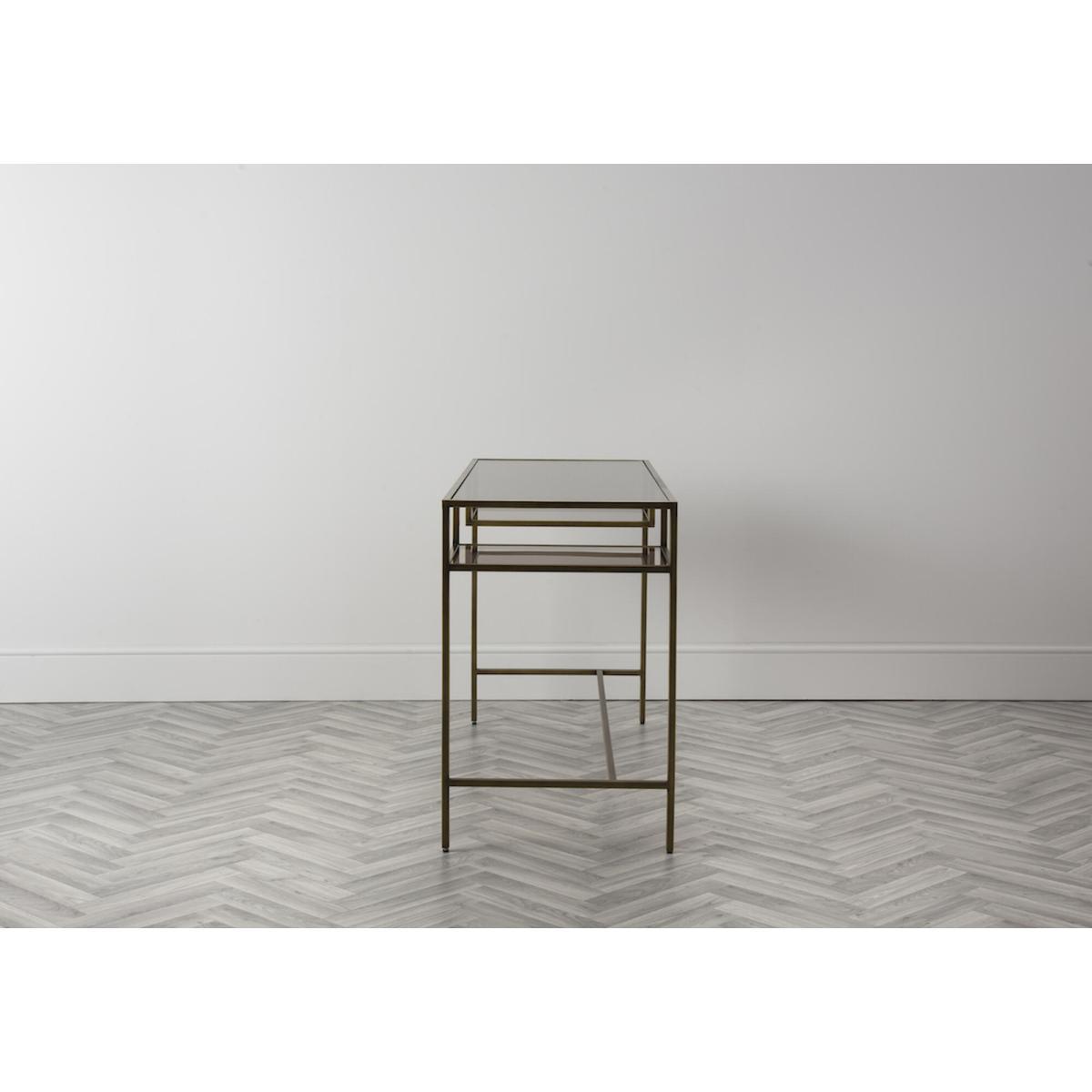 One look at the Marshall Desk and you will instantly fall in love. Clean lines and sparkling textures define this design, that combines metal and glass with a lavish bronze finish. In the Marshall, a slim metal frame holds a gorgeous clear glass top to achieve a level of elegance that is simply unique. Complete with two dropdown shelves for easy storage, place the Marshall desk in any modern home office or living room and pair it with one of those trendy honeycomb glass vases to create a look that is coordinated and utterly stylish.