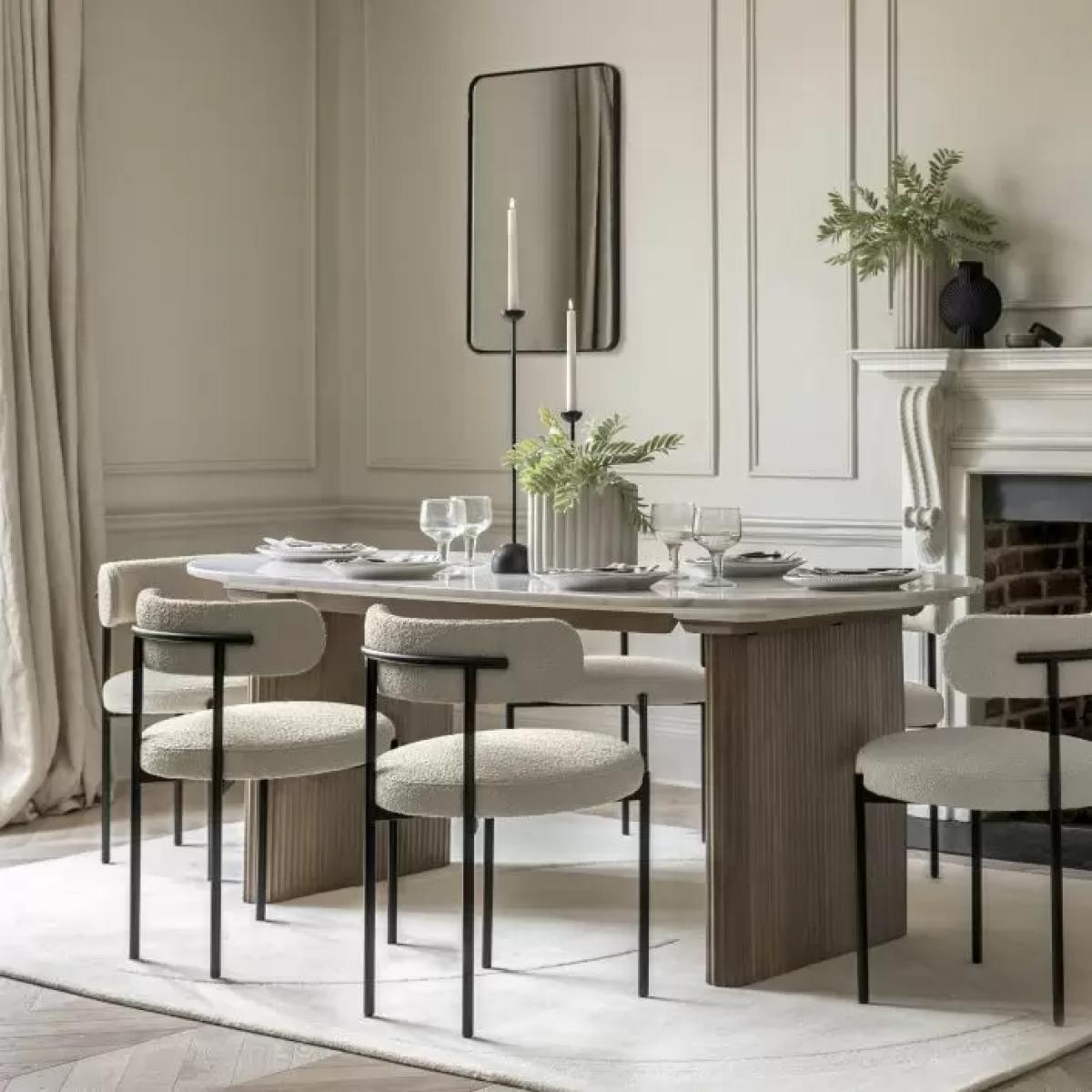 This on trend dining table offers a modern classic look. Crafted from solid mango wood, with a striking vertical ribbed feature on the legs, and a polished Indian white Carrera marble top with classic grey/blue veins running through it, the table exudes timeless quality & beauty. Matching pieces are available. Material:Marble 50% / Mango Wood 50%. Colour/Finish: Grey Wash / White.