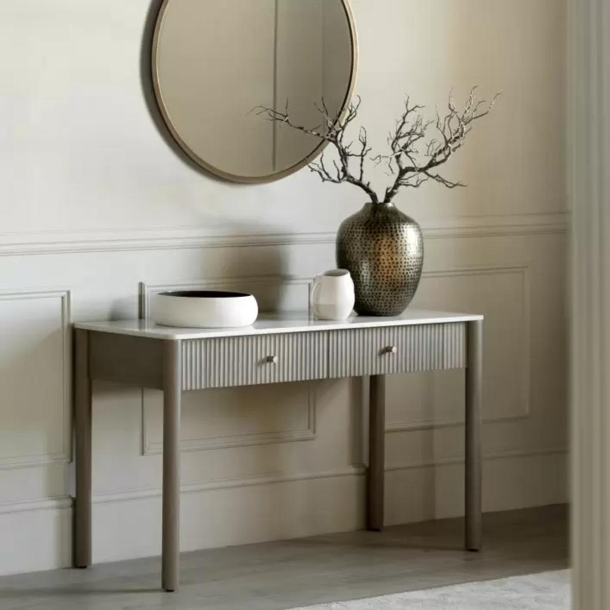 This on trend console table offers a modern classic look. Crafted from solid mango wood, with a striking vertical ribbed feature on the drawers, and a polished Indian white Carrera marble top with classic grey/blue veins running through it, the table exudes timeless quality & beauty. Matching pieces are available. Material:Mango Wood 60% / Marble 30% / MDF 10%. Colour/Finish: Grey Wash / White.