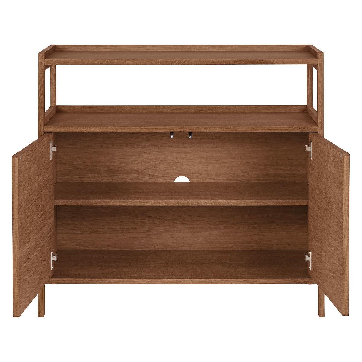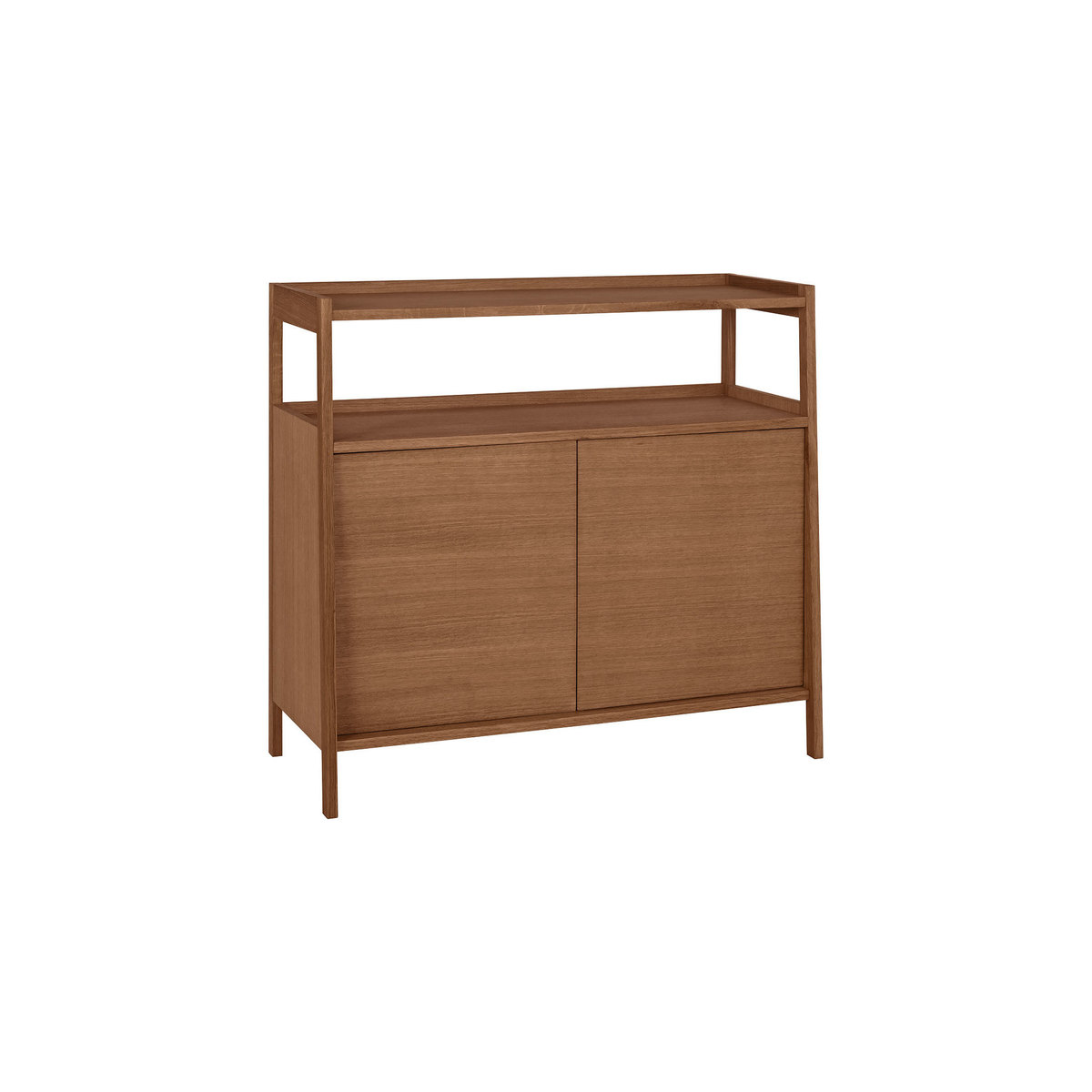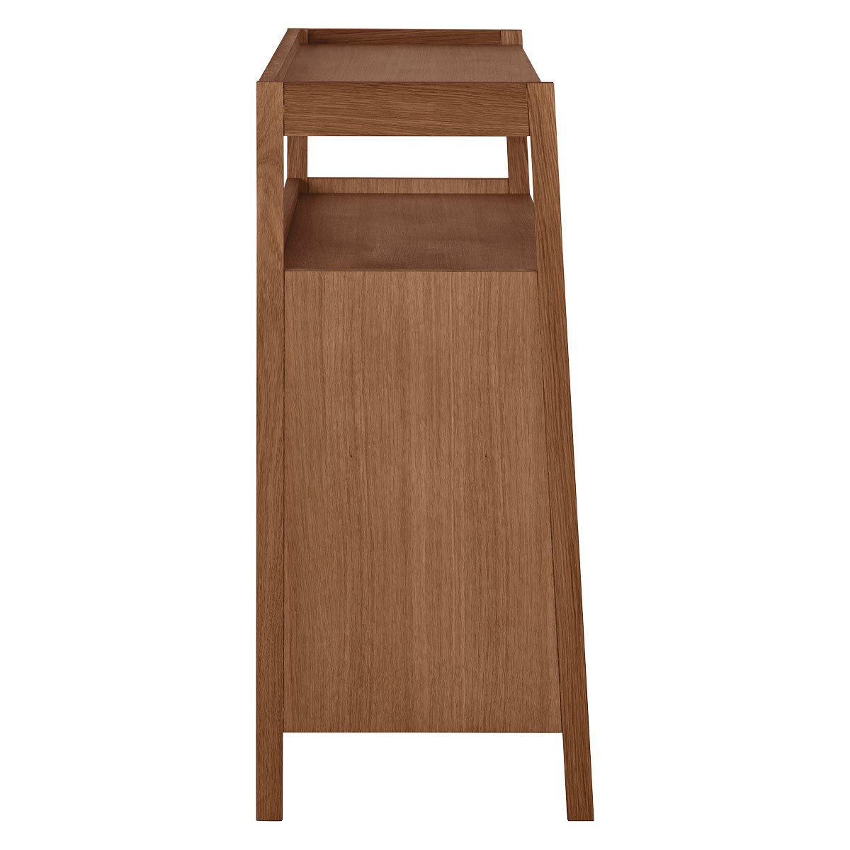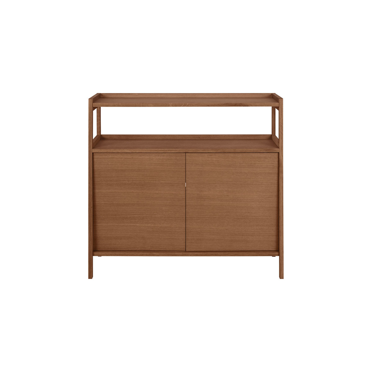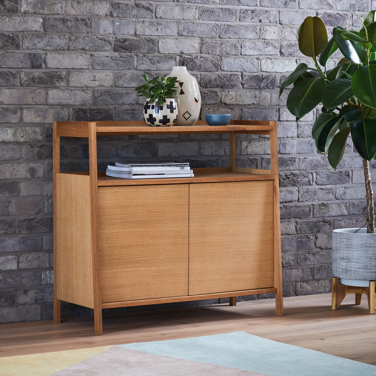 A contemporary design, the Marston walnut stain sideboard provides stylish and practical storage for any living room, hallway or dining room. With 2 spacious shelves and a bottom cupboard that adds interest to the design, there’s plenty of space for books, vases and accessories. Finished with a push-close mechanism and a moveable shelf inside, its handleless doors add to its seamless design. Designed in our in-house studio, and inspired by mid-century living, this sideboard is crafted from solid oak and finished with a walnut stain. An oak stain finish sideboard is also available as well as a bookshelf in both oak and walnut stain.